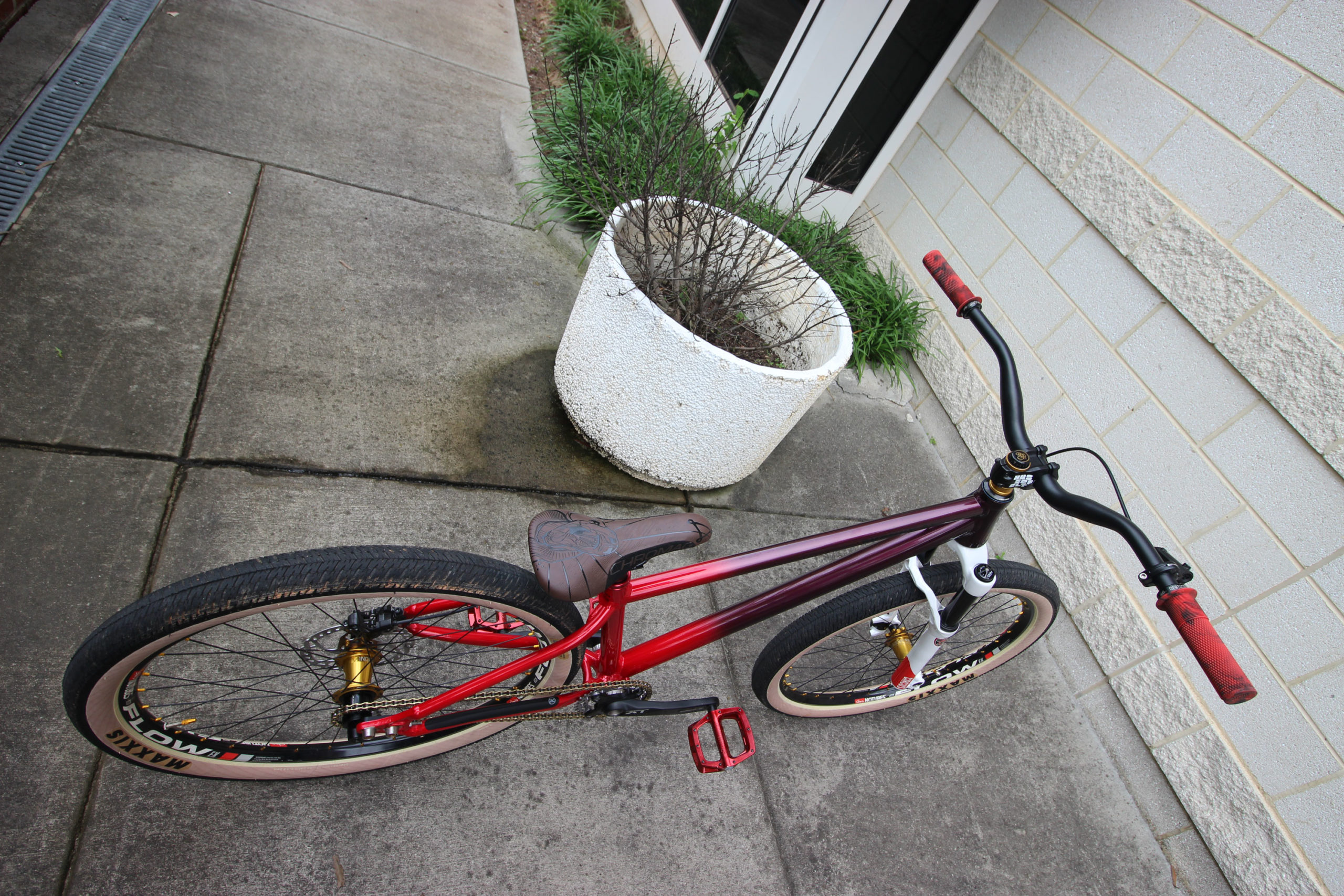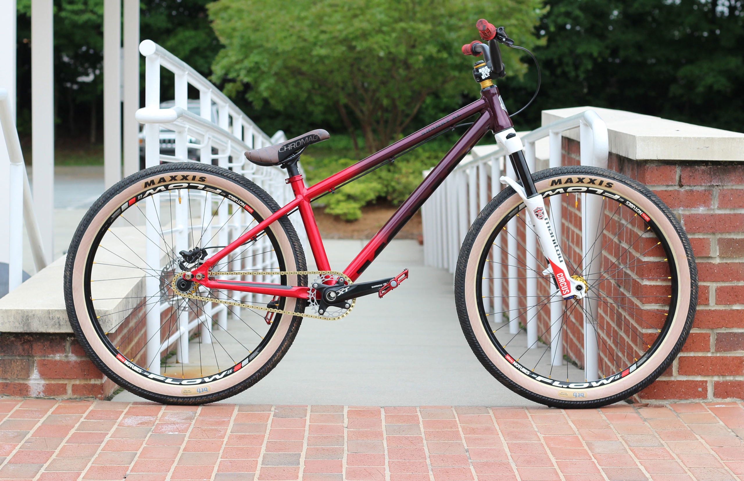 I don’t know about you but that 2015 Shonky paint job has to be one of my all-time favorites. Turns out Mooresville, NC local Adam Schaffer liked it too, and he picked this one up second hand and set about building this stunning DJ bike. Originally from Ohio, Adam rode bmx for a long time before making the switch over to MTB.