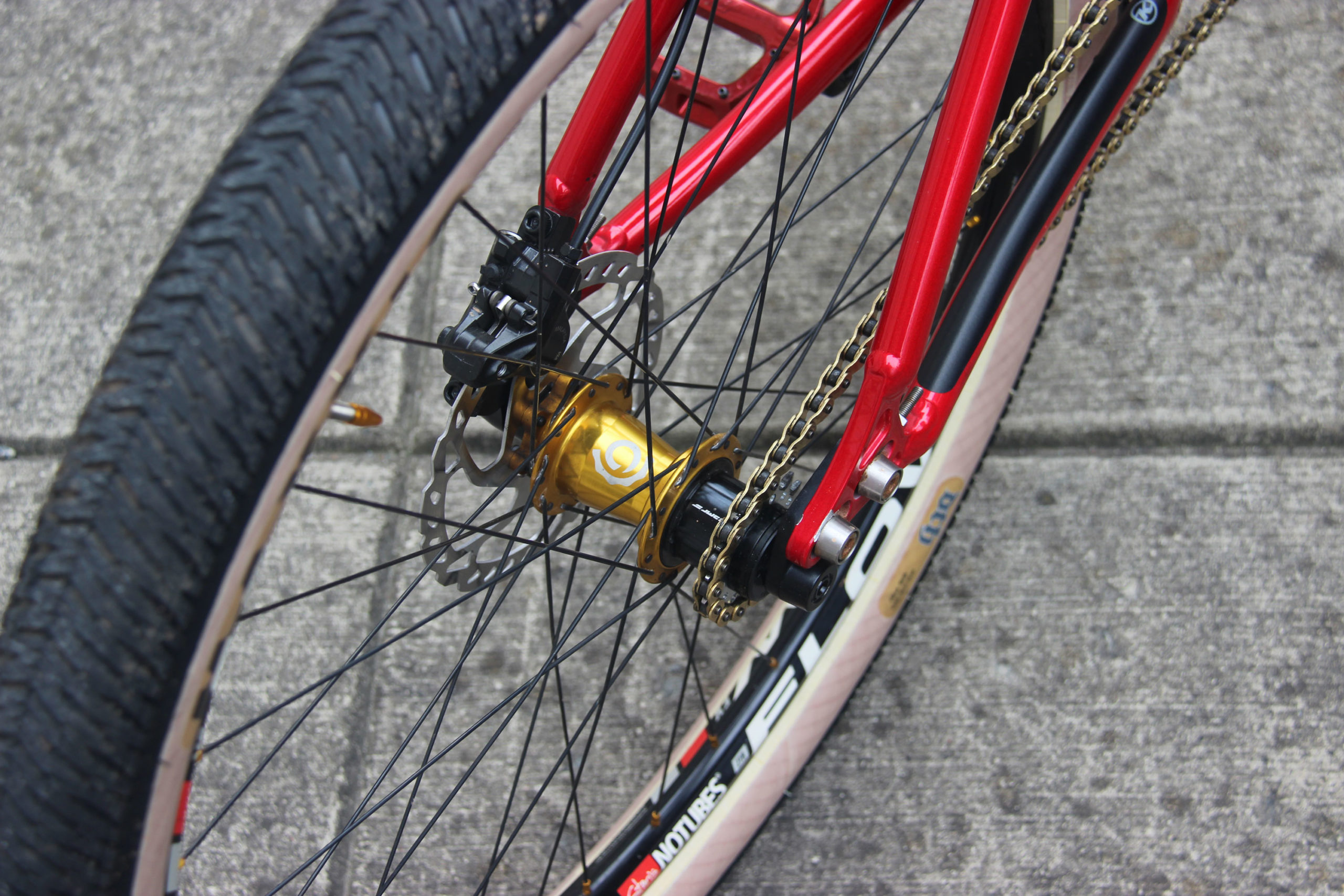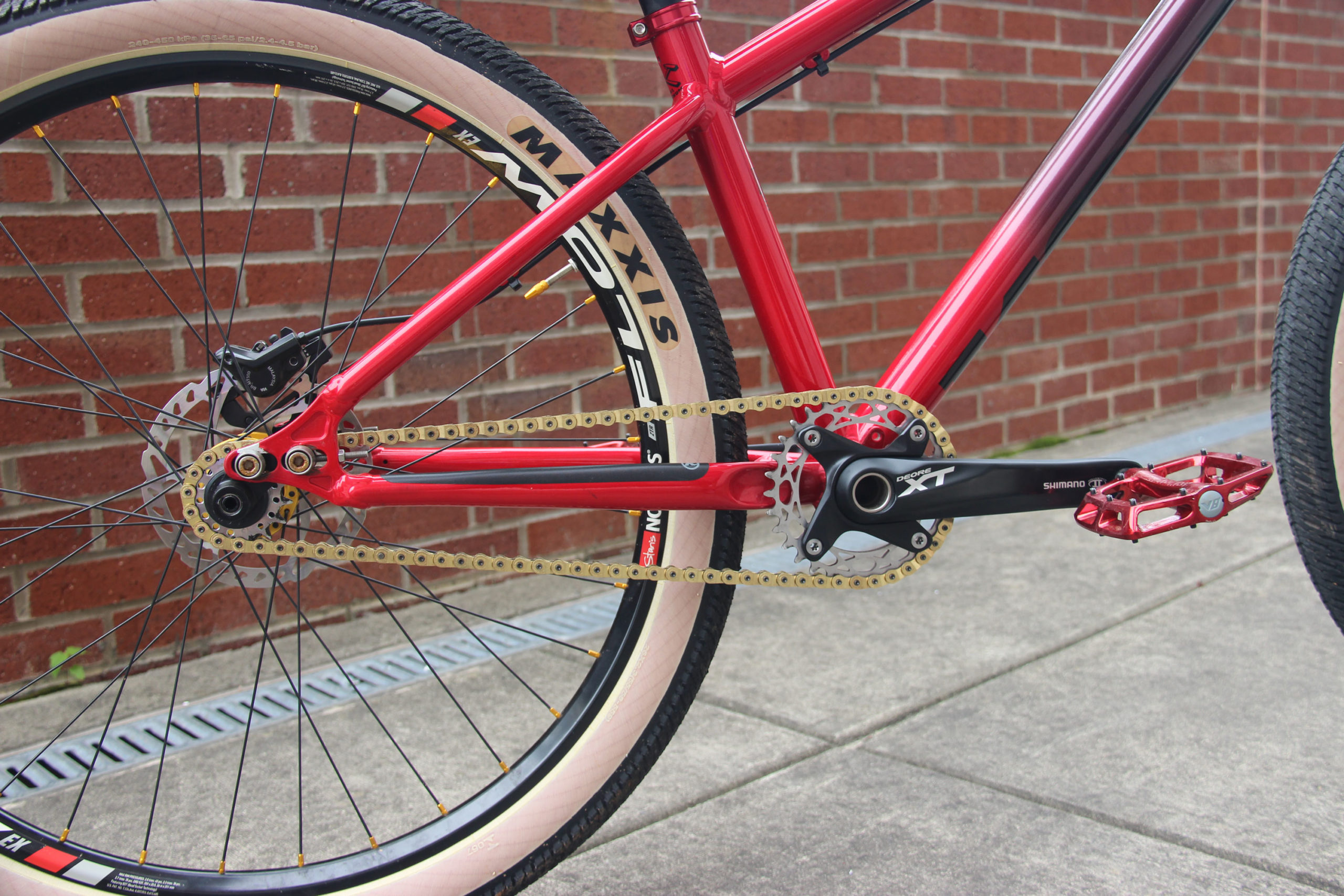 Adam had a set of XT Cranks laying around from another build that he mated with a 32t Niner Super Light chain ring and XT bottom bracket. The rear cog is a 17t Halo super thick cog. All put down through a Shadow Conspiracy Half Link Chain.