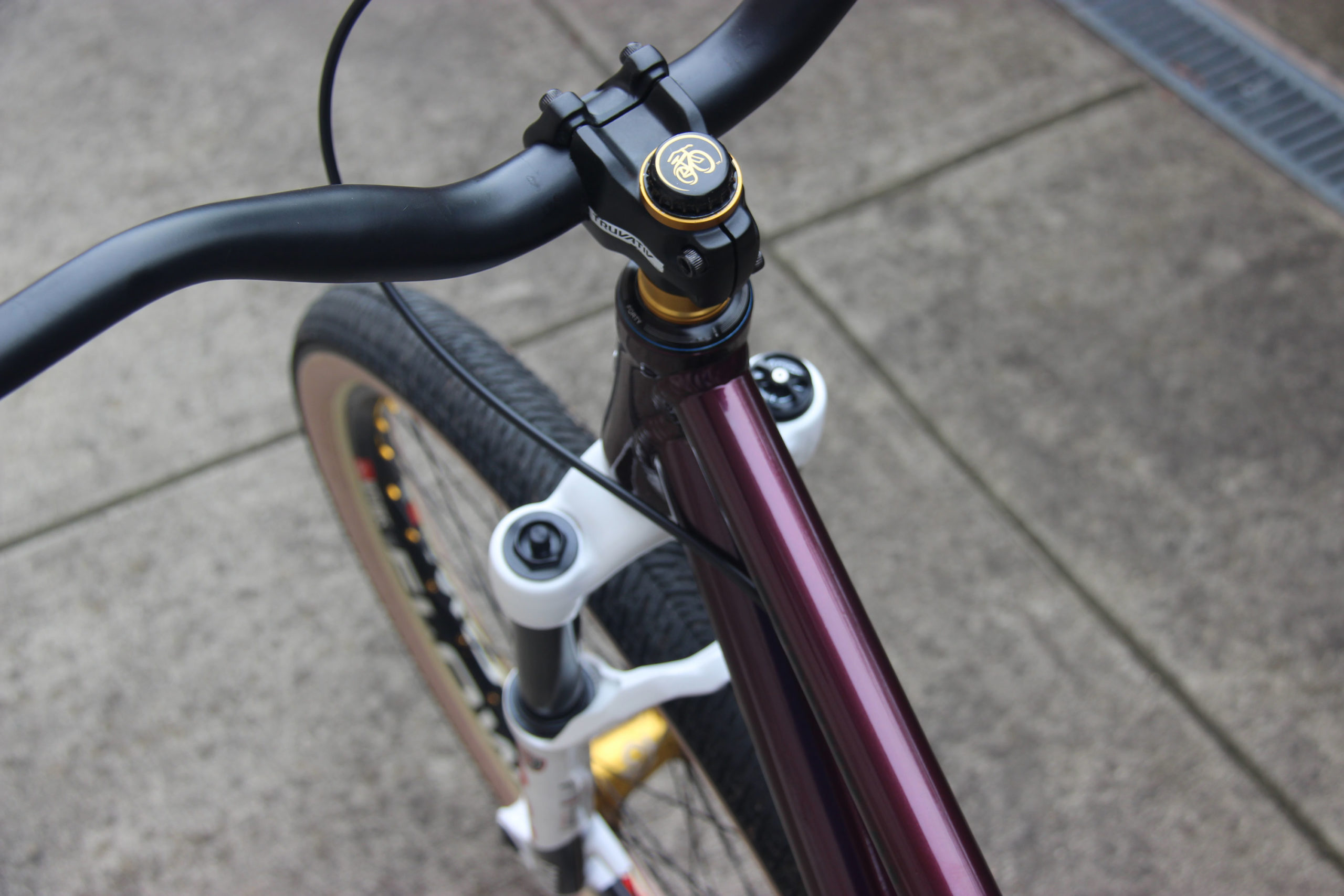 The cockpit is kicked off with a Cane Creek 40 headset which is complemented with Wolftooth headset spacers in gold, and Niner’s classic YRWYD (Your Ride What You Drink) bottle cap top cap with a New Belgium brewing gold bike. The Trutativ stem holds 80mm riser bars from Deity. DMR Deathgrips and a Shimano Deore brake round things out.