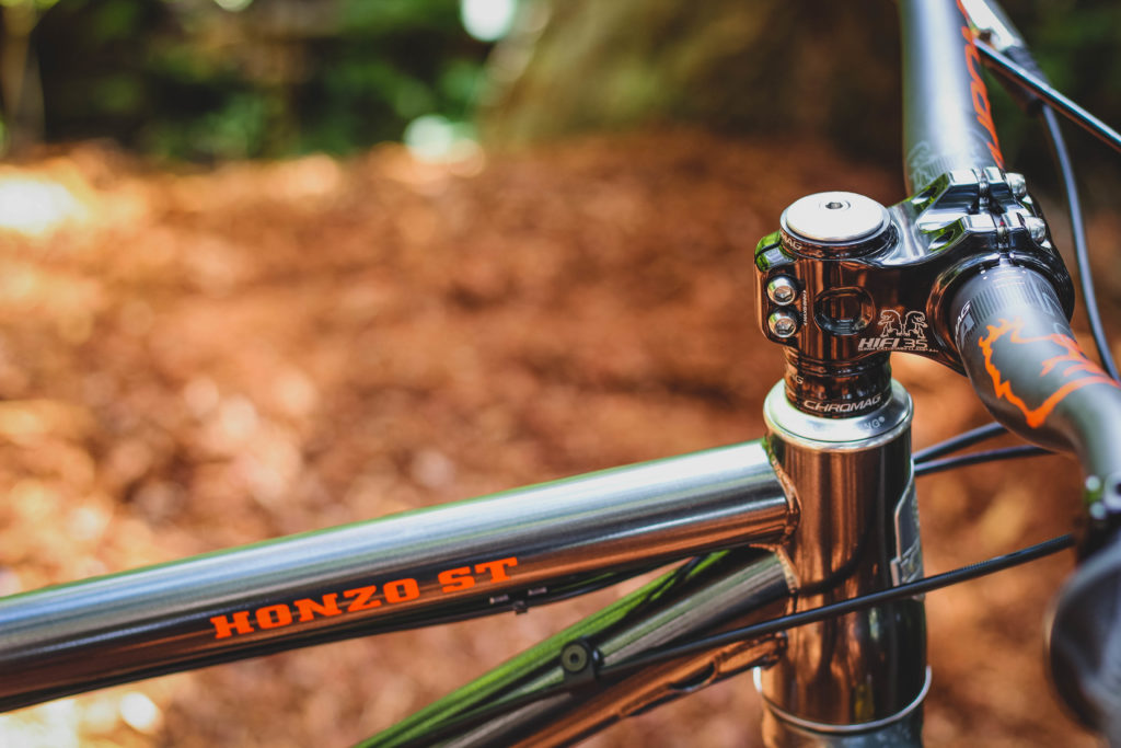Bailey from Goldstream Bicycles wanted to build himself a collectible Kona. Sensibly, he picked one of our limited-edition 30th Birthday Honzo STs as a base. We made 201 of these bikes this year and the dark chrome mirror finish is just pure bling. The resulting build is a balanced mix of steel and carbon and of old and new.