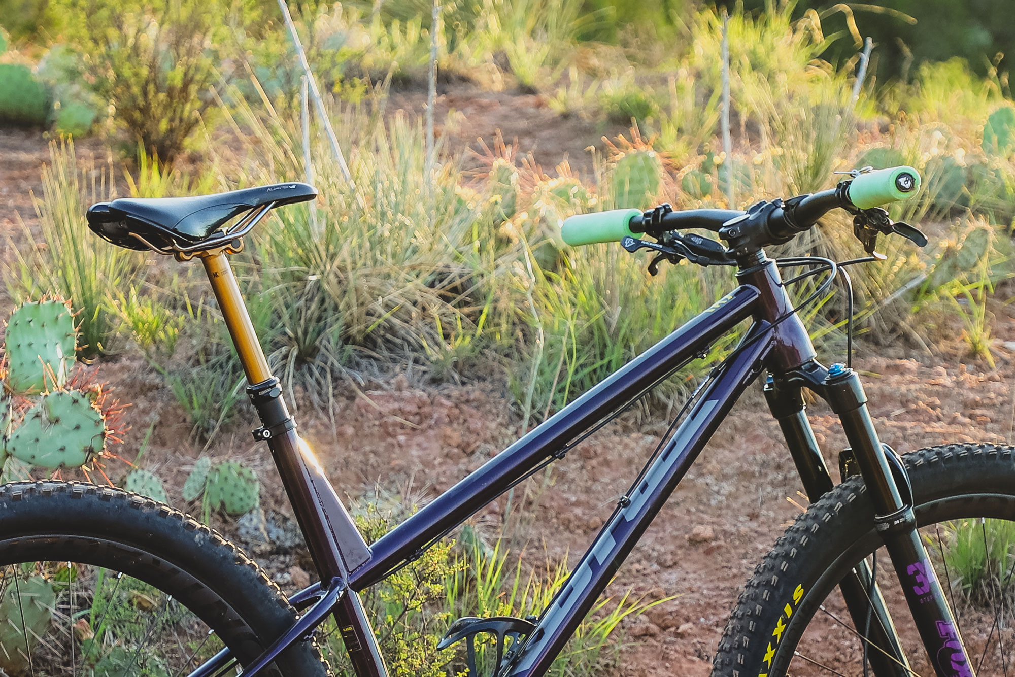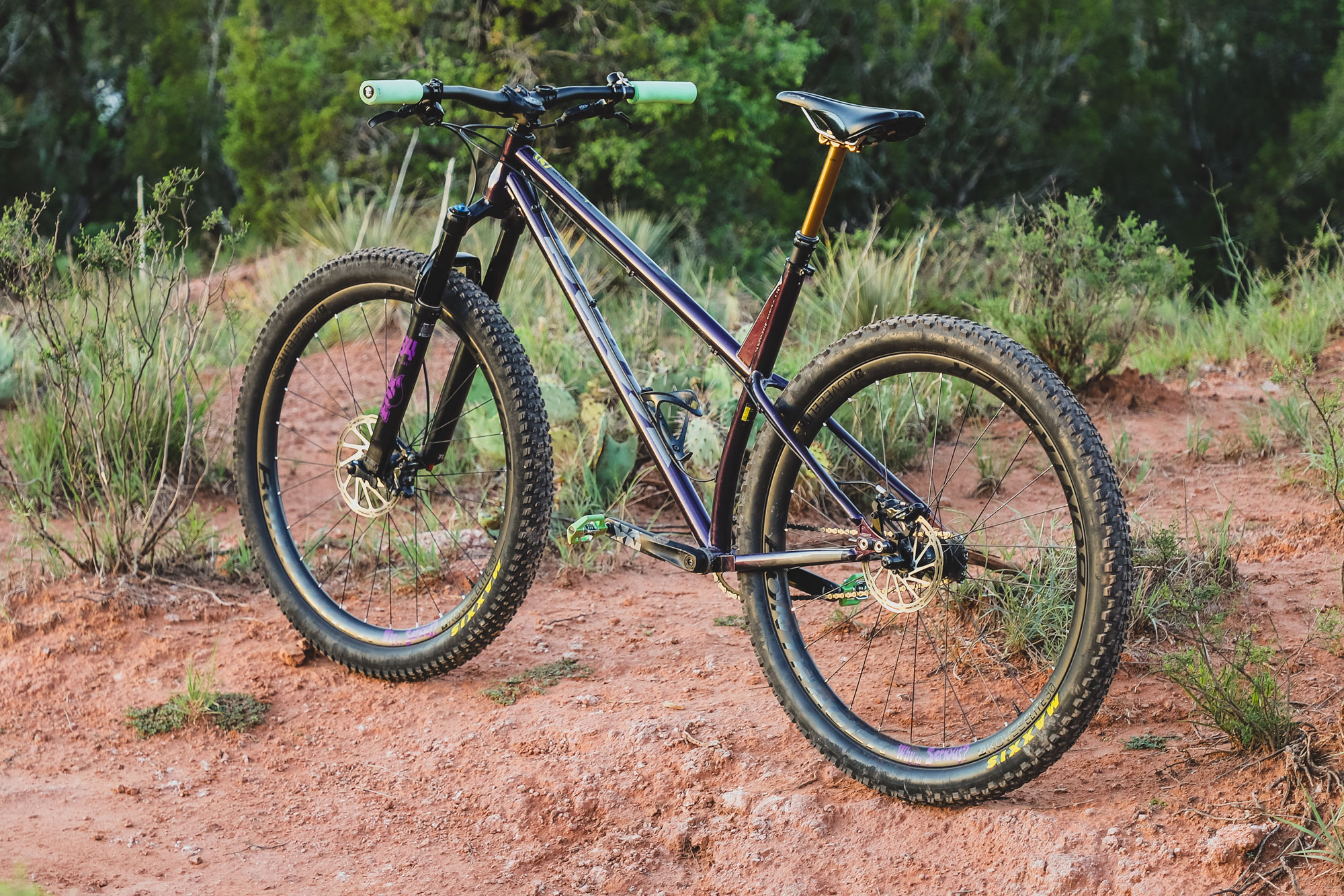 Fox 34 Step Cast fork with custom decals keep things comfy up the front, while Maxxis combo of a Rekon 29×2.6 front tire and Ardent 29×2.4 rear tire keep things planted. A set of Crank Brothers Candy pedals complete the build.