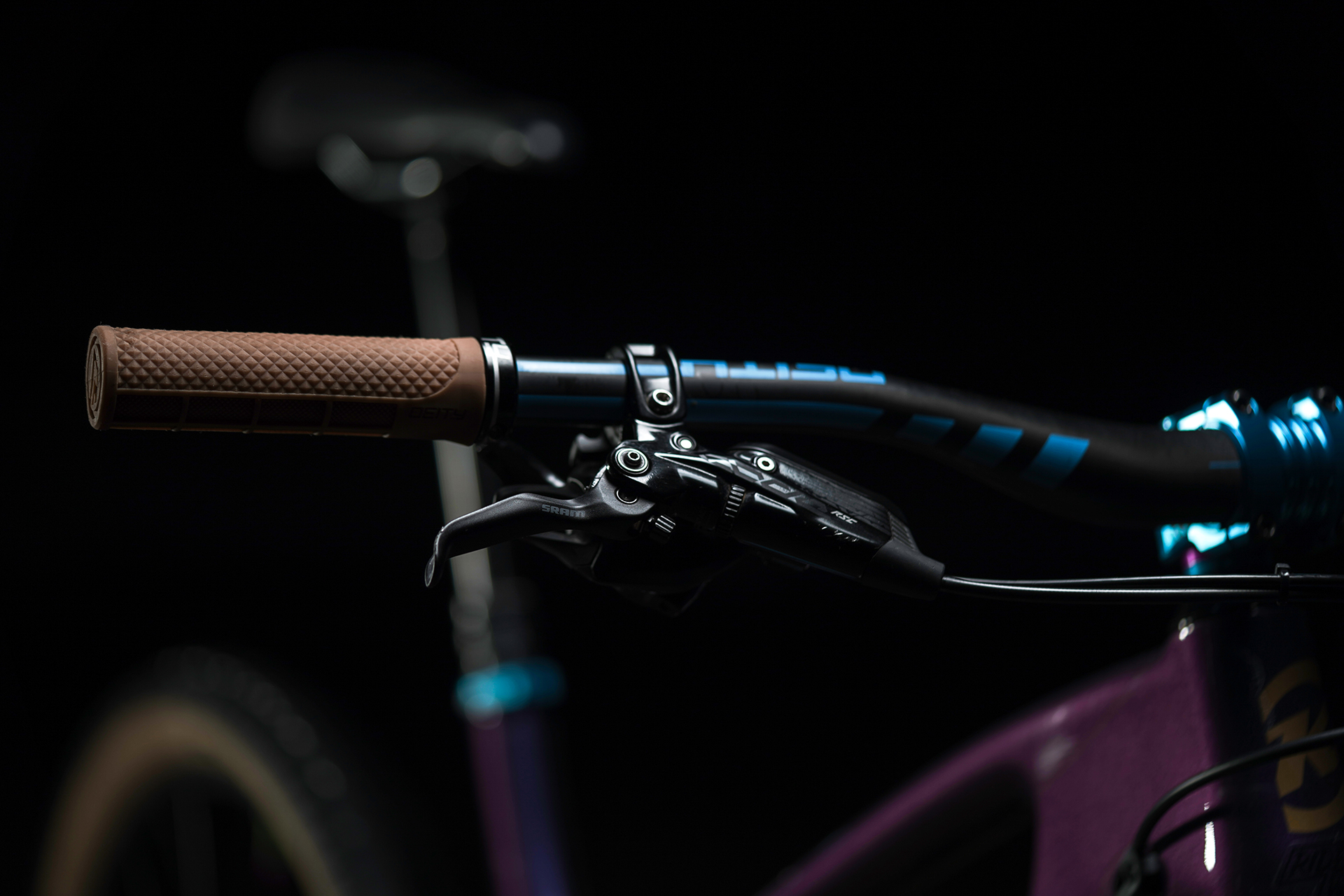 While the SRAM Code RSC stoppers have remained in place, Brandon has swapped the rest of the cockpit parts to Deity. The bars are the carbon Speedways and the grips are gum colored Lockjaws.
