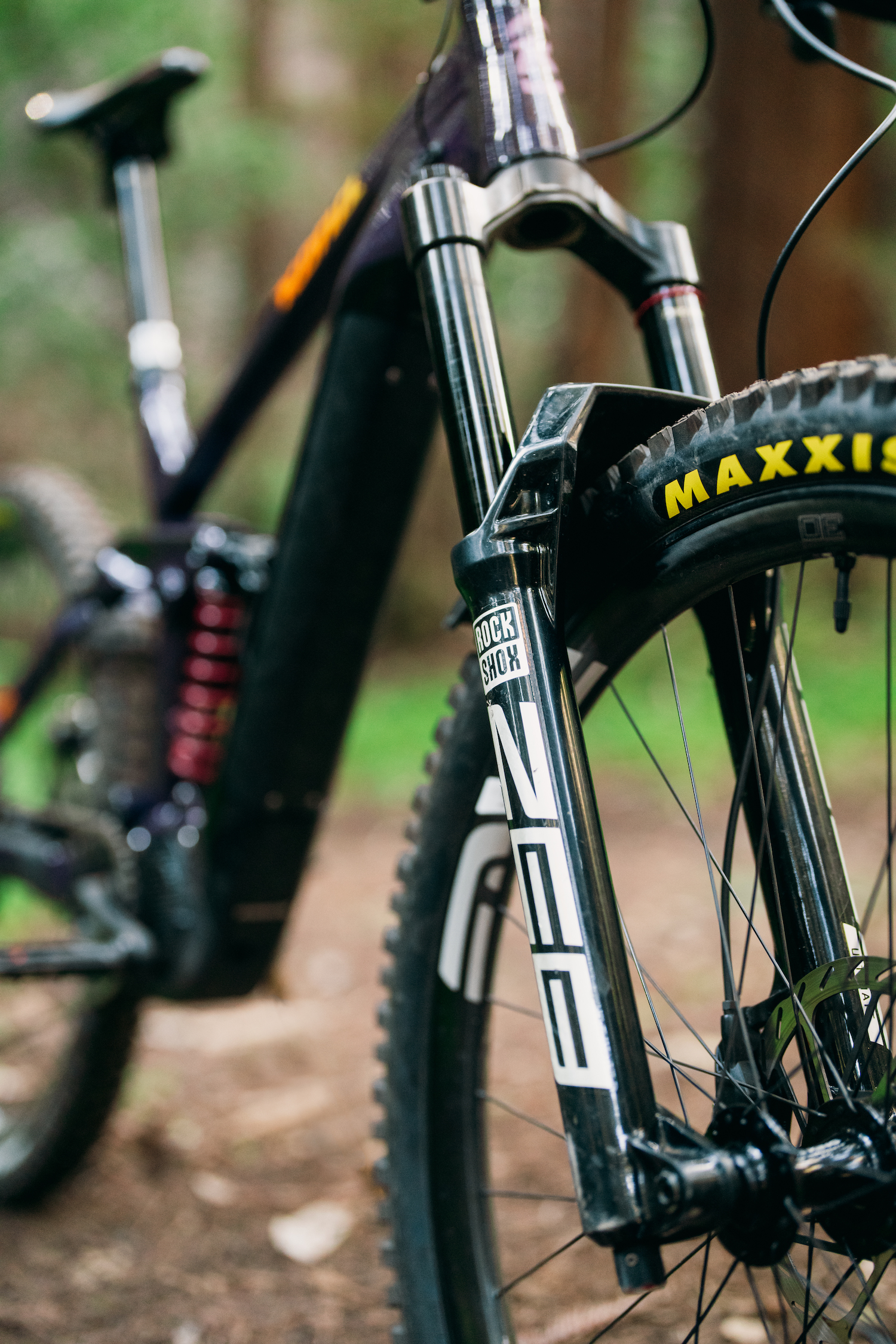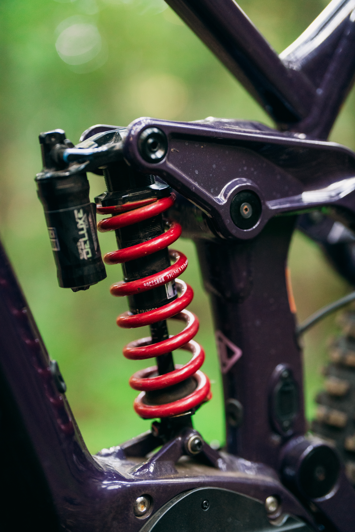 …and for the squishy bits, Caleb rocks the RockShox Zeb Ultimate 170mm Zeb in the front, paired with a Super Deluxe Ultimate Coil in the rear.