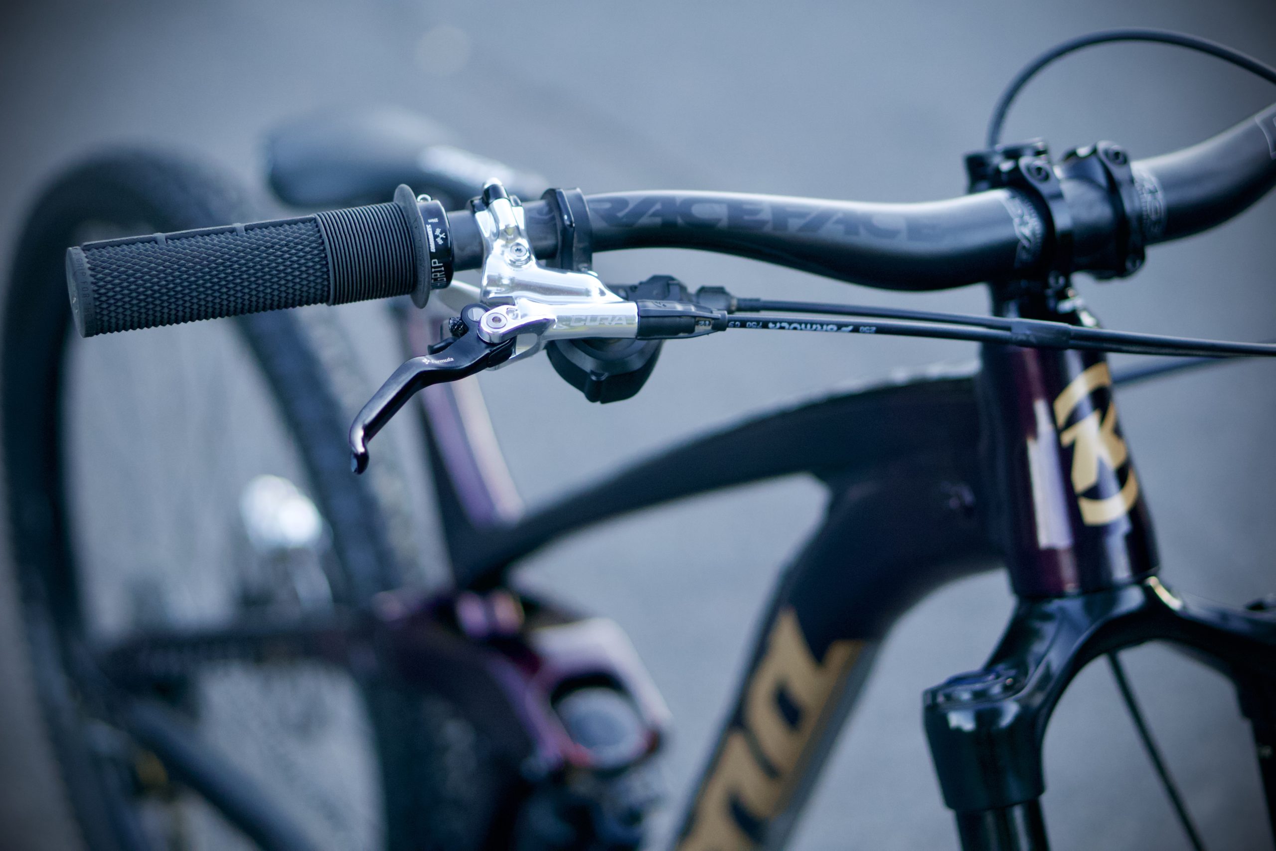 The cockpit of the bike sees a super short Raceface Turbine R stem matched to a Next R handlebar and DMR Deathgrips. A Next R carbon seatpost and Ergon SDH2 downhill saddle keep the touch points of the bike clean and functional with minimal cables. The front brake hydraulic line is run through the steerer tube of the fork for barspin and tailwhip capabilities.