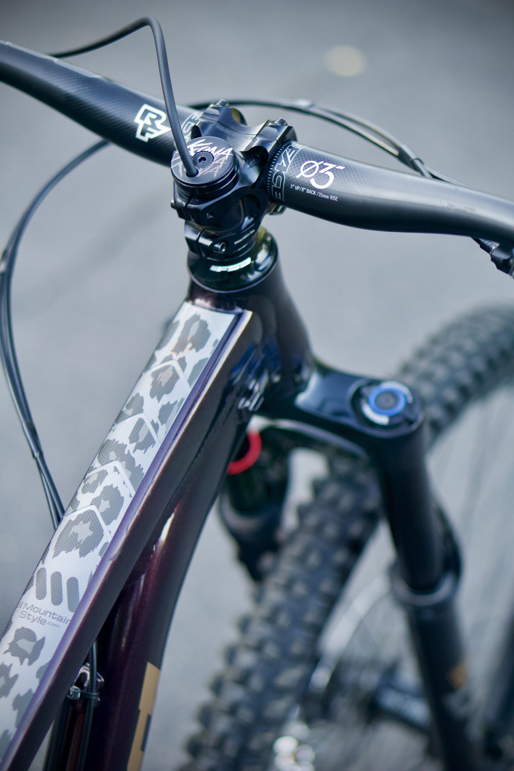 The cockpit of the bike sees a super short Raceface Turbine R stem matched to a Next R handlebar and DMR Deathgrips. A Next R carbon seatpost and Ergon SDH2 downhill saddle keep the touch points of the bike clean and functional with minimal cables. The front brake hydraulic line is run through the steerer tube of the fork for barspin and tailwhip capabilities.