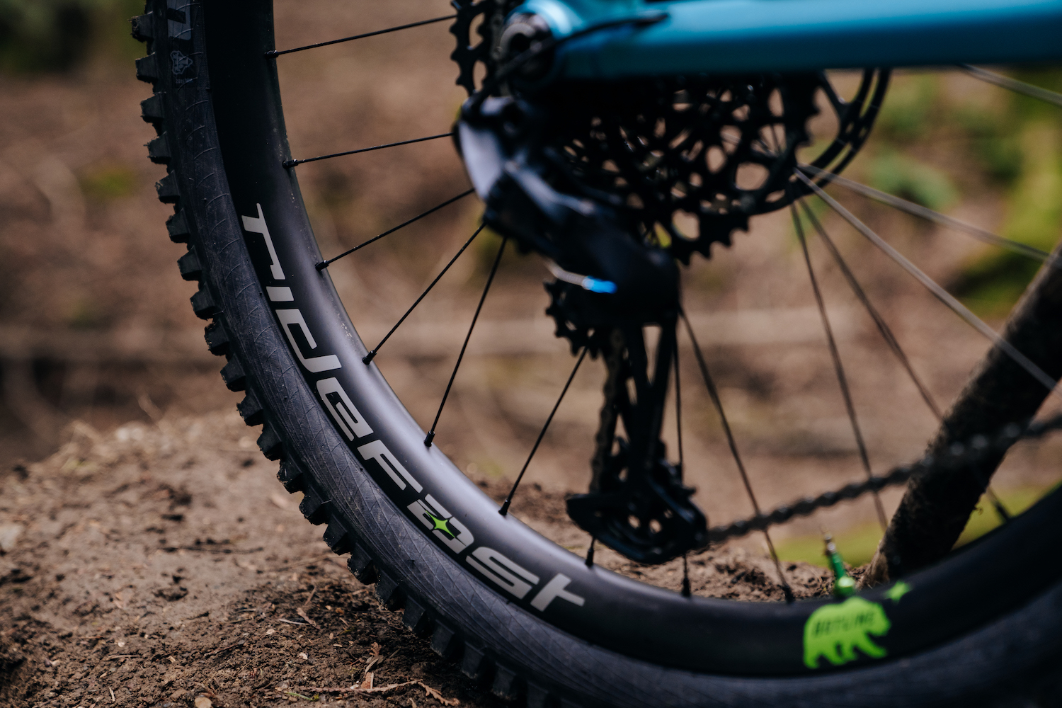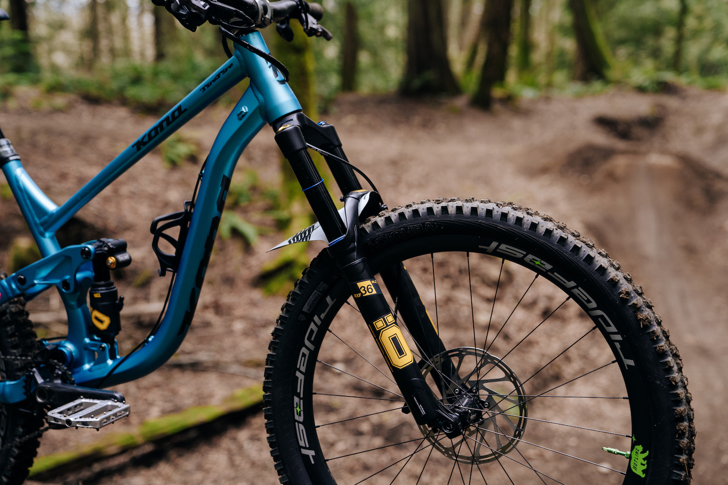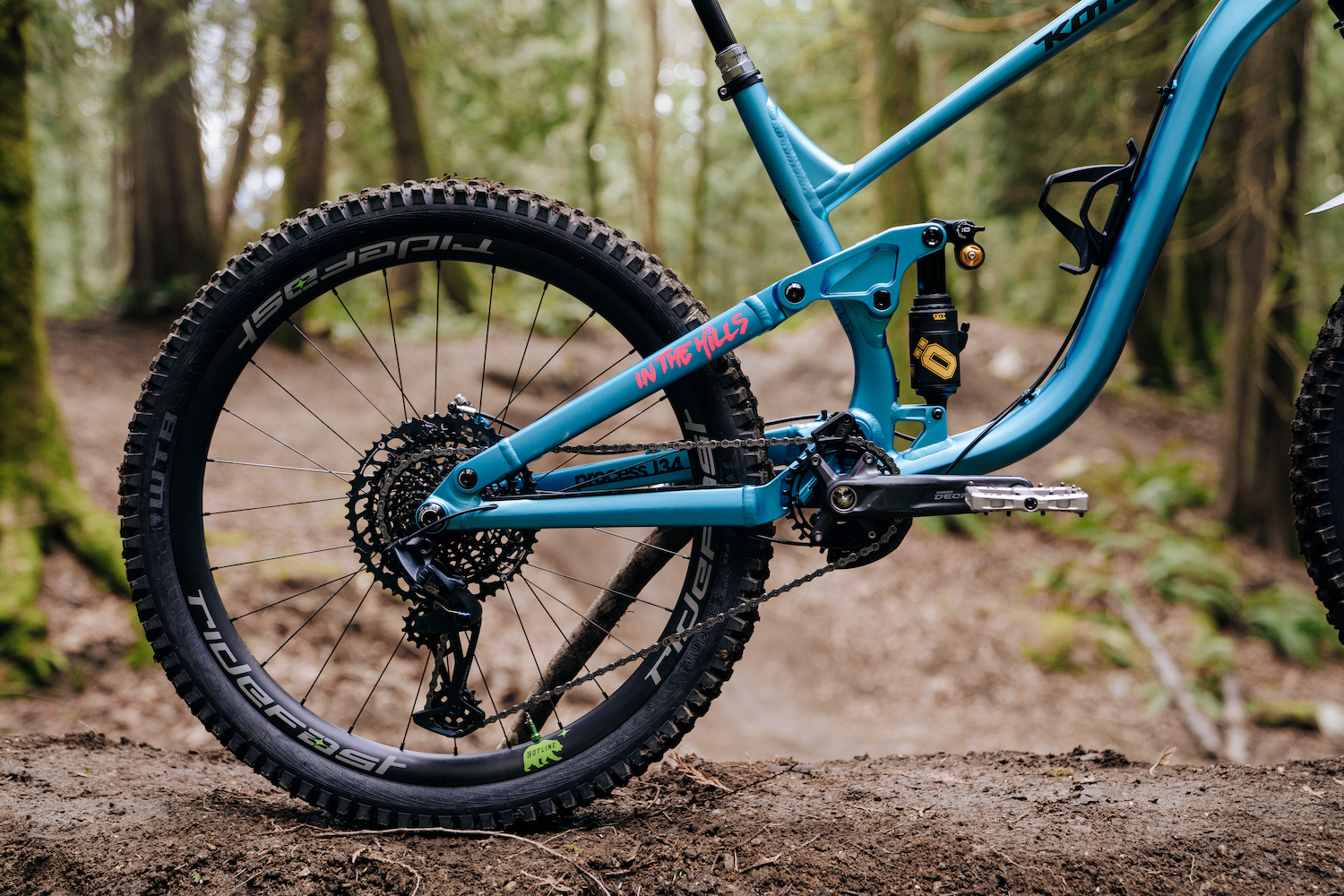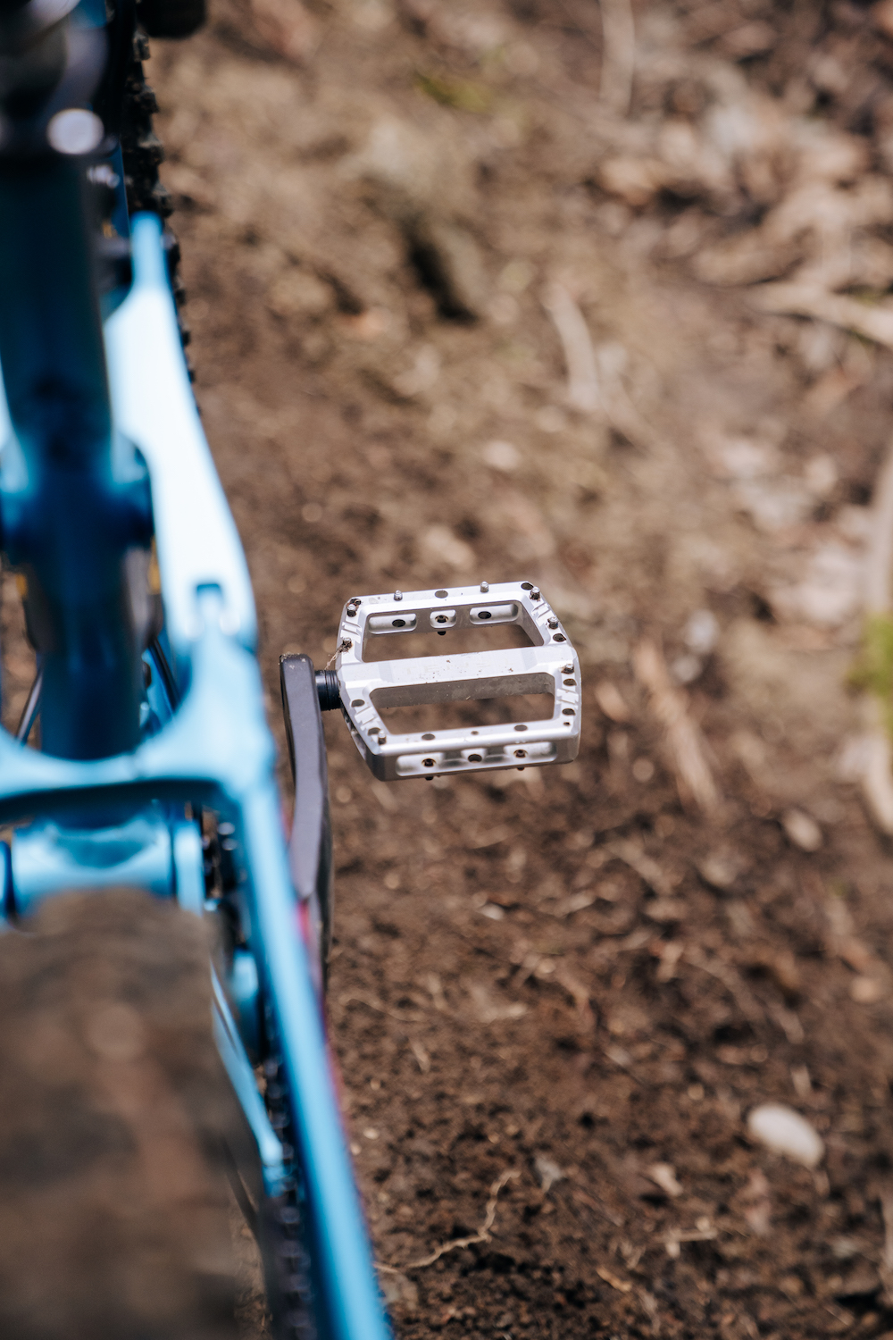 Cody is running a pedal cocktail of Sram’s GX drivetrain, Shimano Deore cranks, and silver Tenet Occult pedals.
