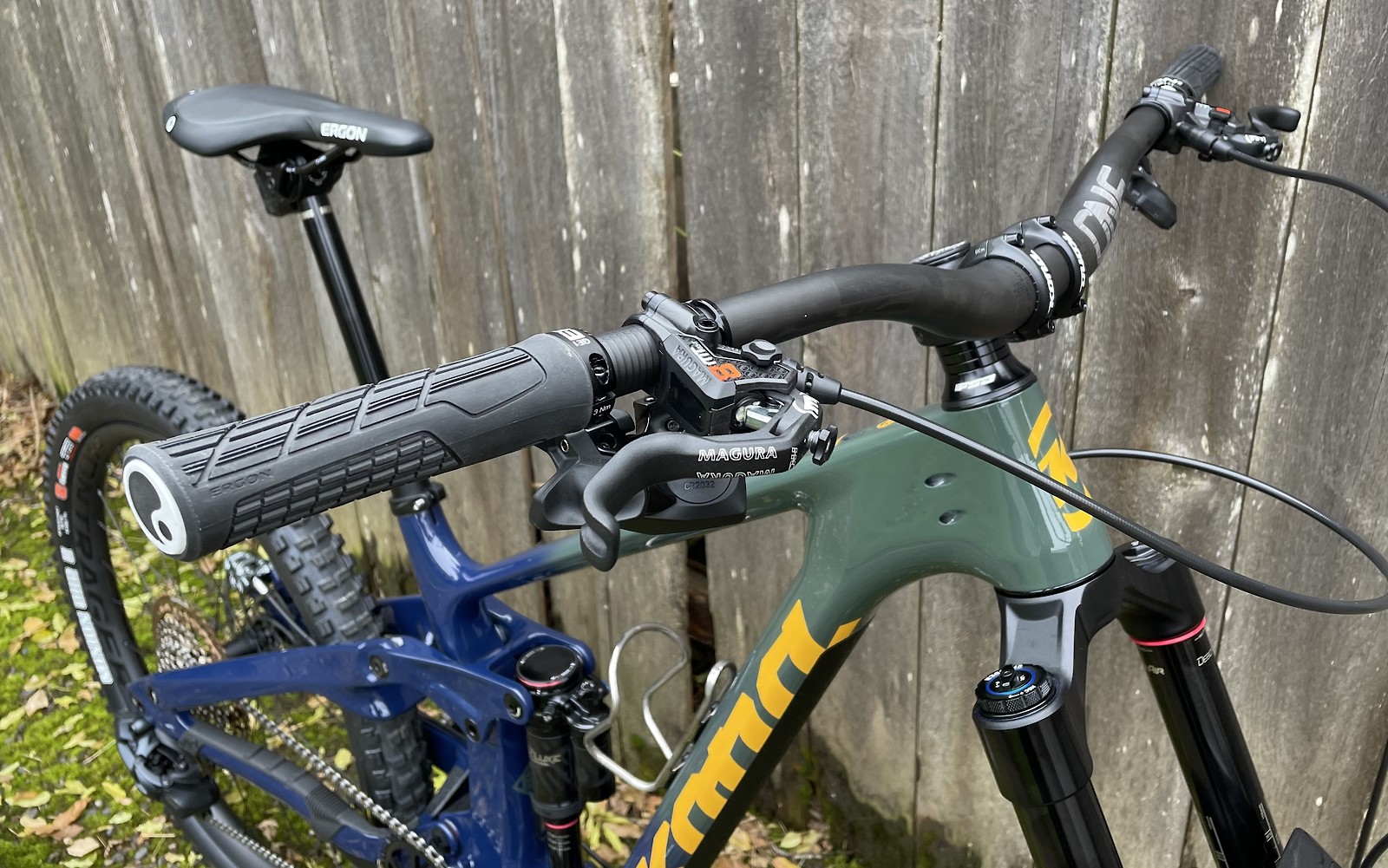 Up in the cockpit though, there are a bunch of custom changes. The stock Kona stem remains but it’s now clamping a OneUp Components 35mm handlebar in place that’s been trimmed to 760mm. Ergon slim GE1 Evo grips make certain that the contact points are comfortable and rock-solid while a set of powerful Magura MT7 Pro brakes mated to Storm HC rotors ensure the bike can stop on a dime. The saddle and seat post have also been swapped out, the stock options have been replaced with a Reverb AXS and Ergon SME3 Comp. A set of XTR pedals and a Wolftooth/King bottle cage round out this stunning build.