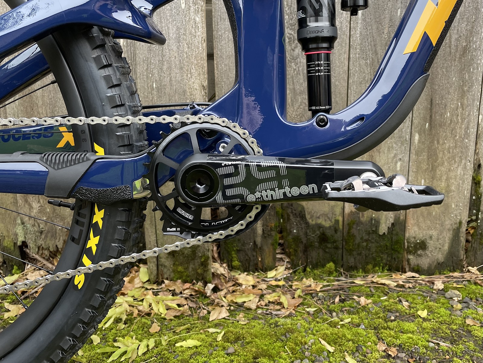 The drivetrain is an e*thirteen affair with LG1 Race Carbon cranks spinning on a match e*thirteen BB and sporting a 32t SL Guidering. A Blackspire Crusher chain guide keeps the drive train protected.