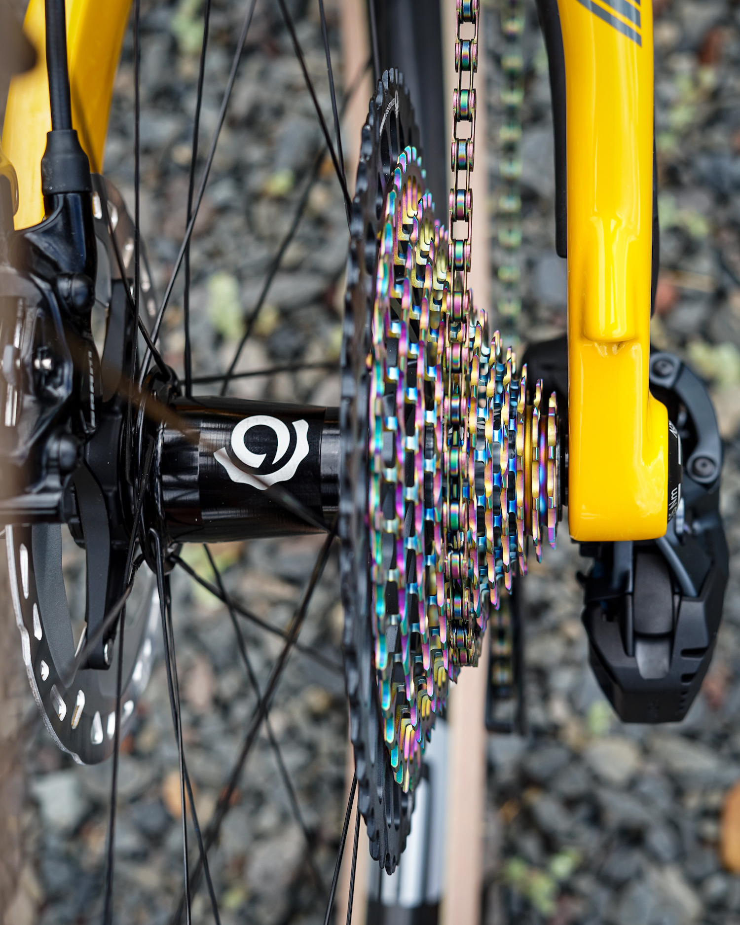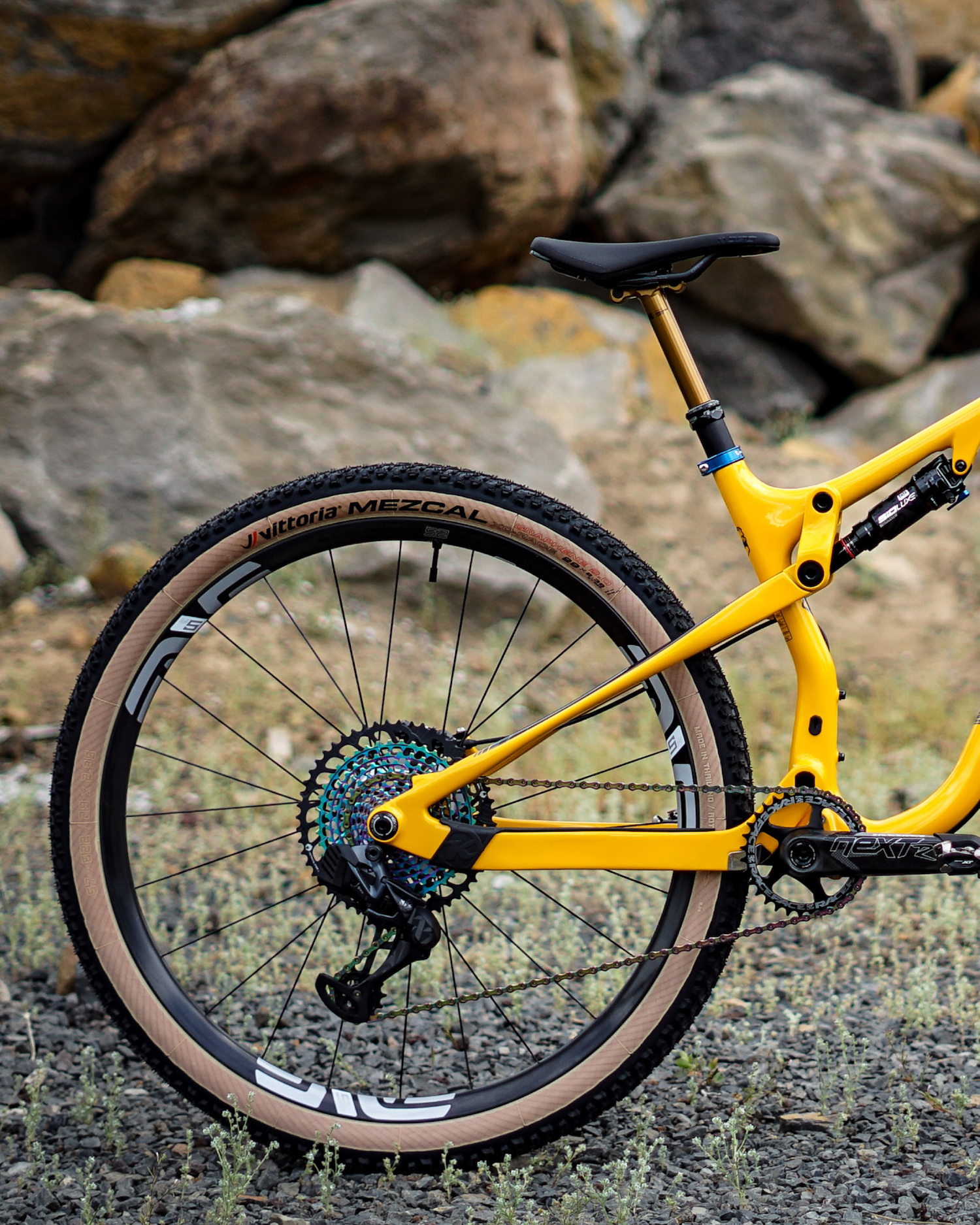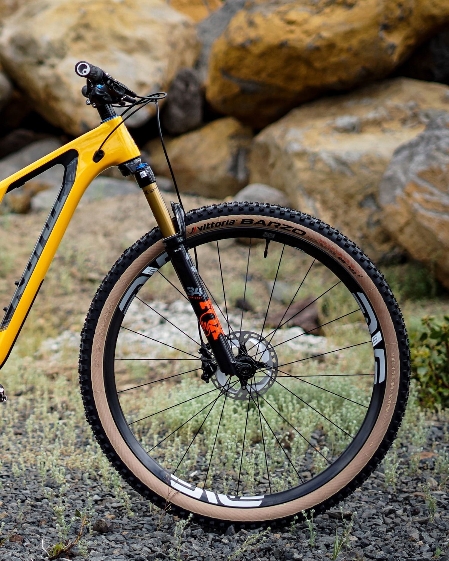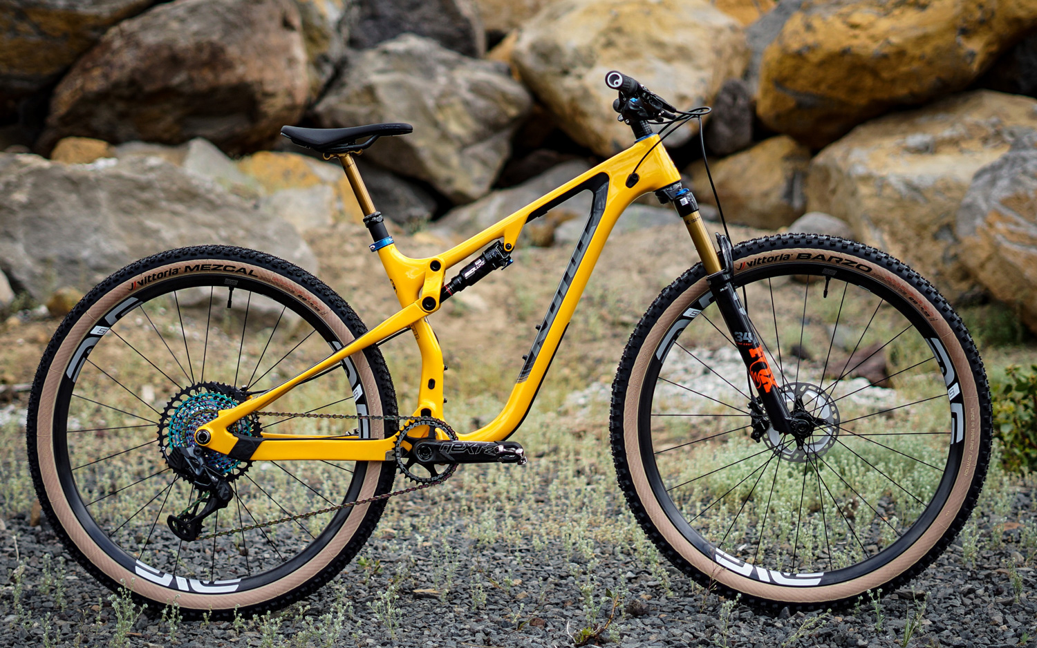 The hubs are Industry 9’s on Enve M5 rims. The front tire is a Vittoria Barzo and the rear is a Vittoria Mezcal.