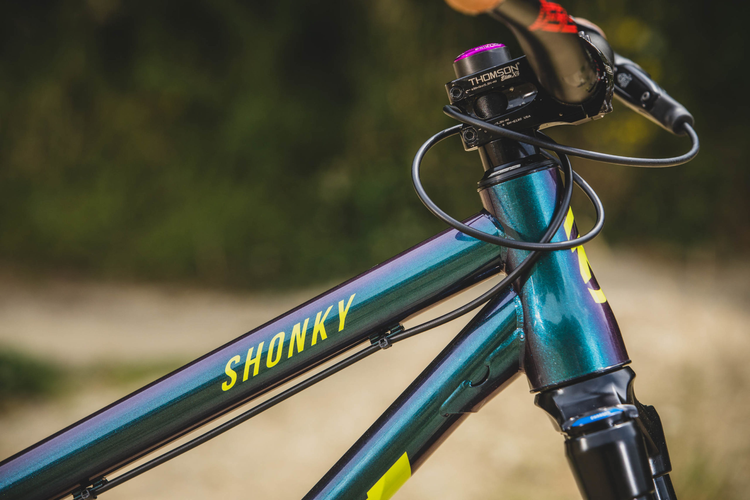 Bike Thieves Suck. We featured Elliot‘s original Shonky back in 2017 as one of our early dream builds. Since then he had refined the build, swapping out the fork for a Rock Shox Pike DJ, the tires for Maxxis DTH’s and the hubs for a matching set of Chris Kings. In fact, he’d had the new Chris King built wheels for less than a week when the bike was stolen from his home. After insurance promptly paid out, he went about sourcing kit, some from parts bins like the crank, pedals, stem and bars and some new. The finished result is Elliot’s Dream Shonky V2.