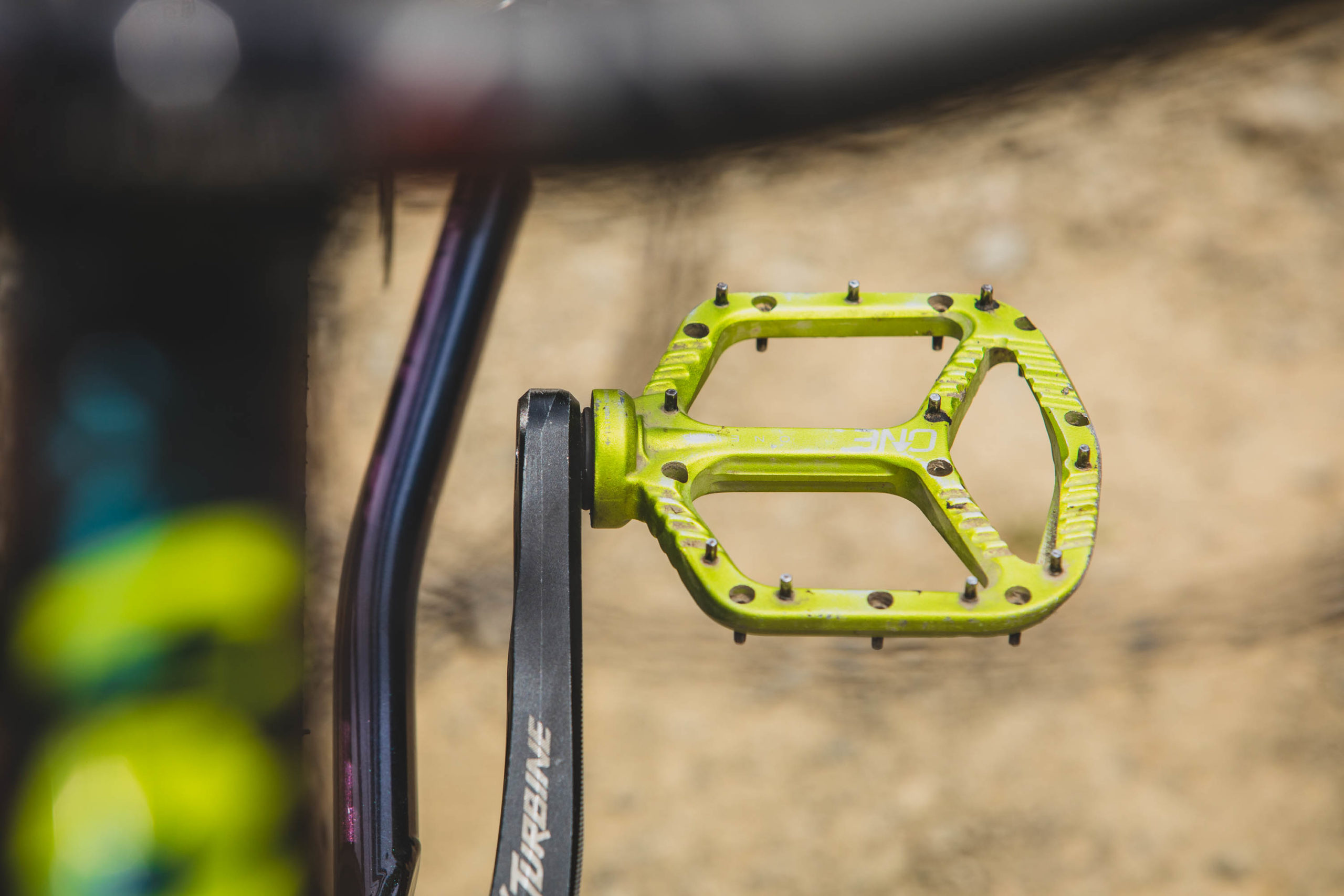 OneUp’s alloy pedals provide ample grip for Elliot’s waffle soles and occasionally, his shins.