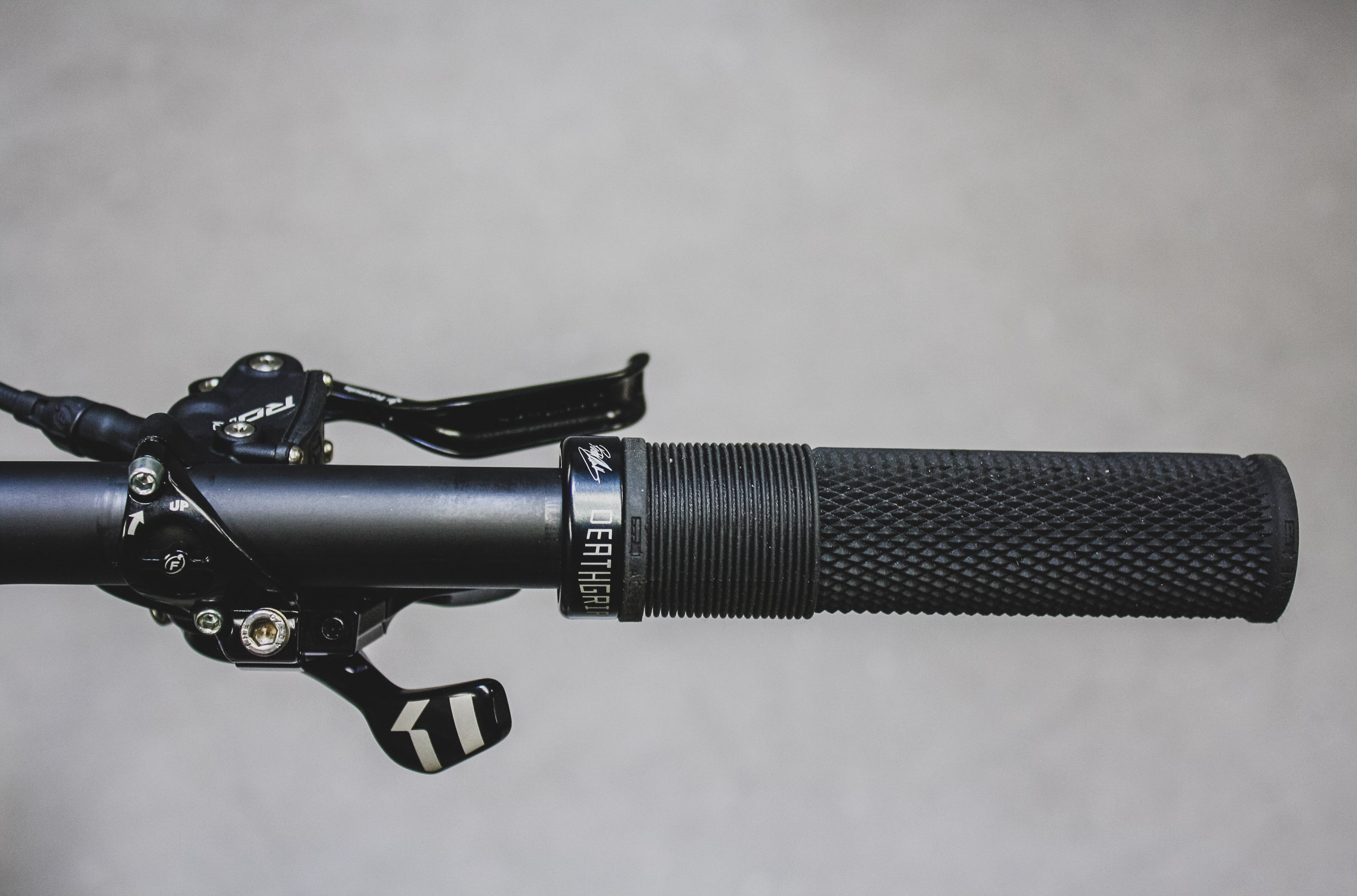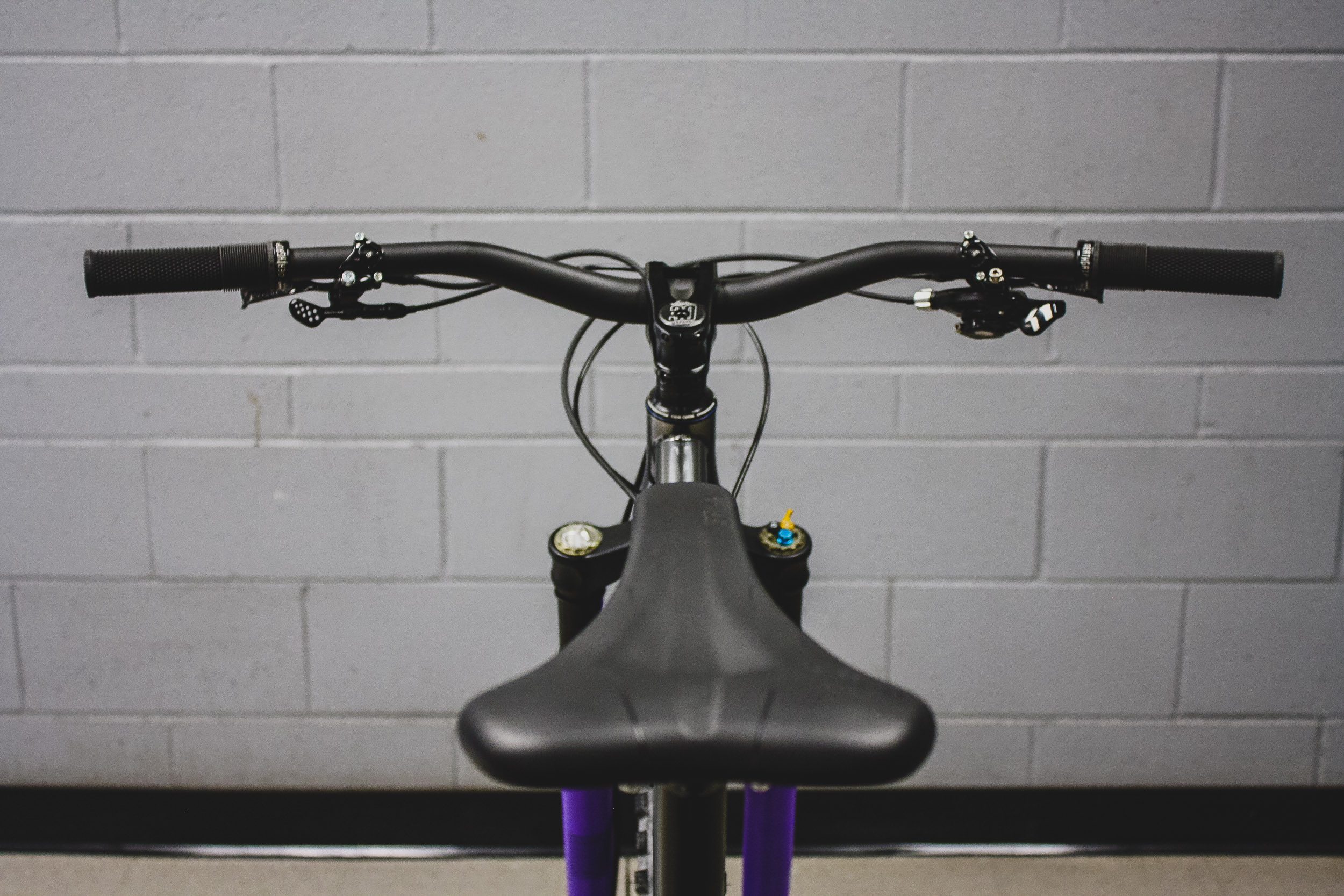 The saddle and bars are both from a German company SQlab. I wanted to try some of their stuff including this carbon bar that had much more backsweep (12+degrees) supposedly putting wrists and elbows in more natural positions, but I had read that you wanted a pronounced lever blade as not to slide off on descents. So too the “Race Day” gummy DMR grips.