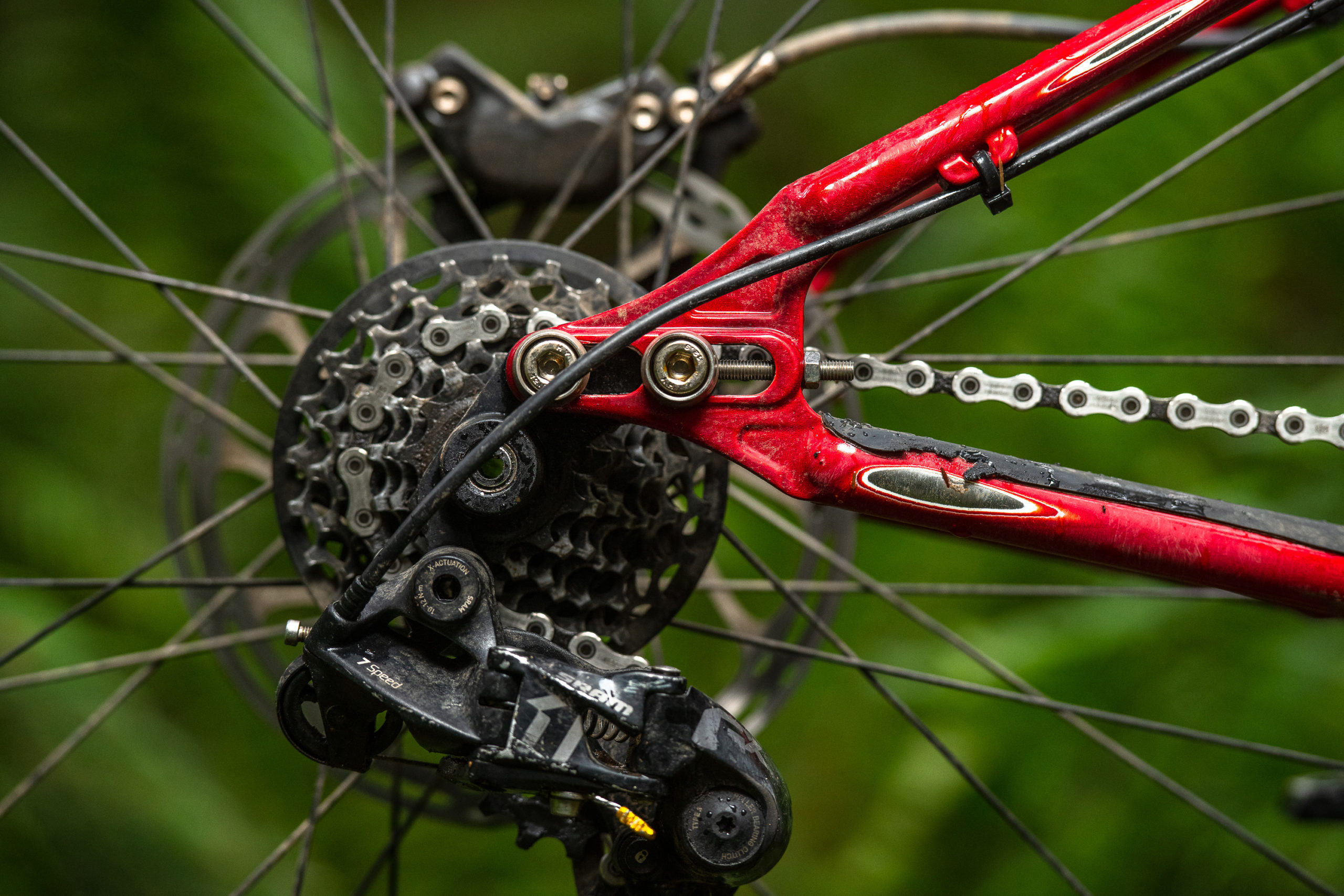 Out the back Finn has opted for a SRAM GX DH rear derailleur and a SRAM GX DH 7 speed cassette. Finn is a big dude, the frae is XL and hes opted for to run the sliding dropouts in their longest setting.