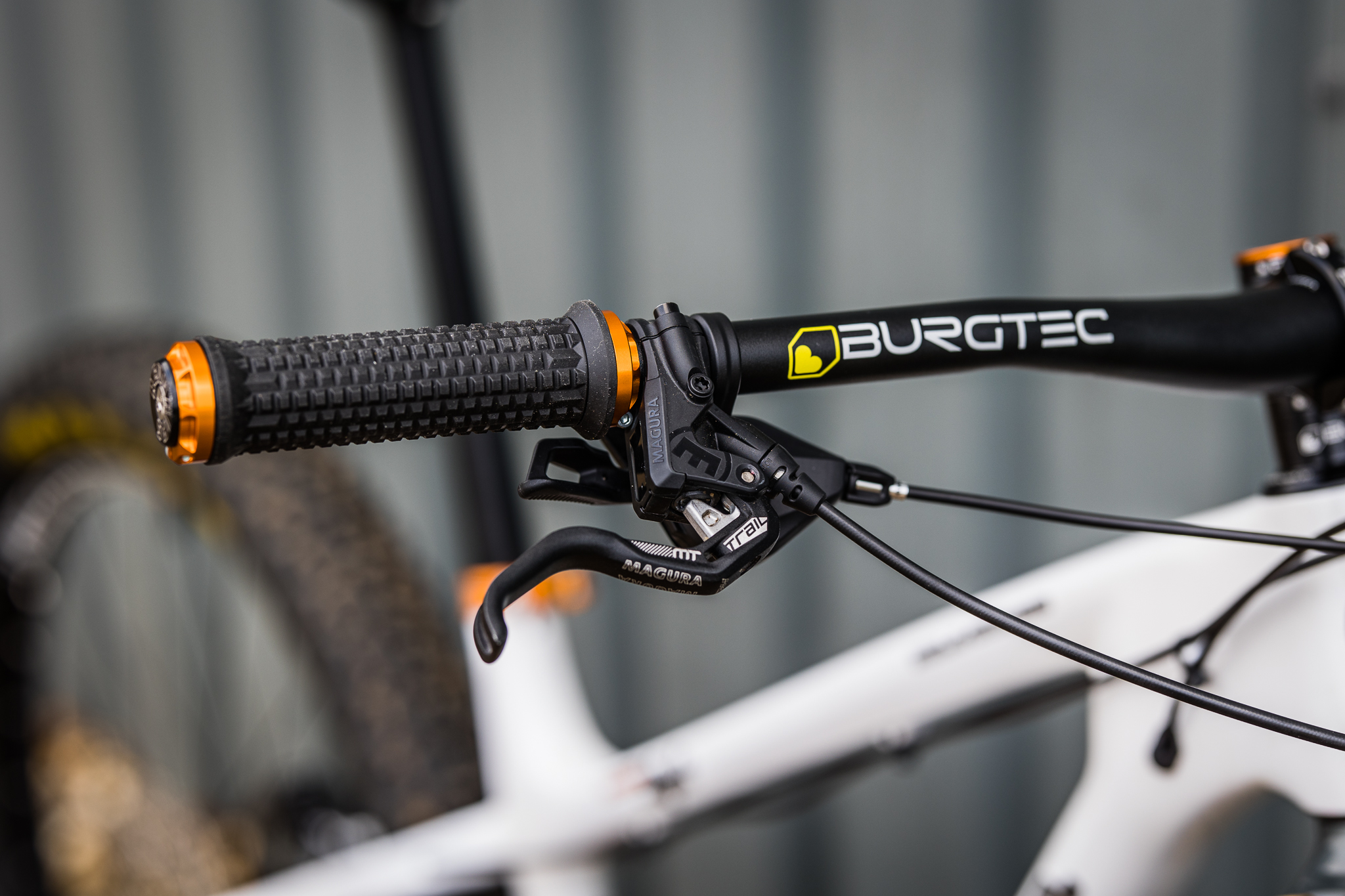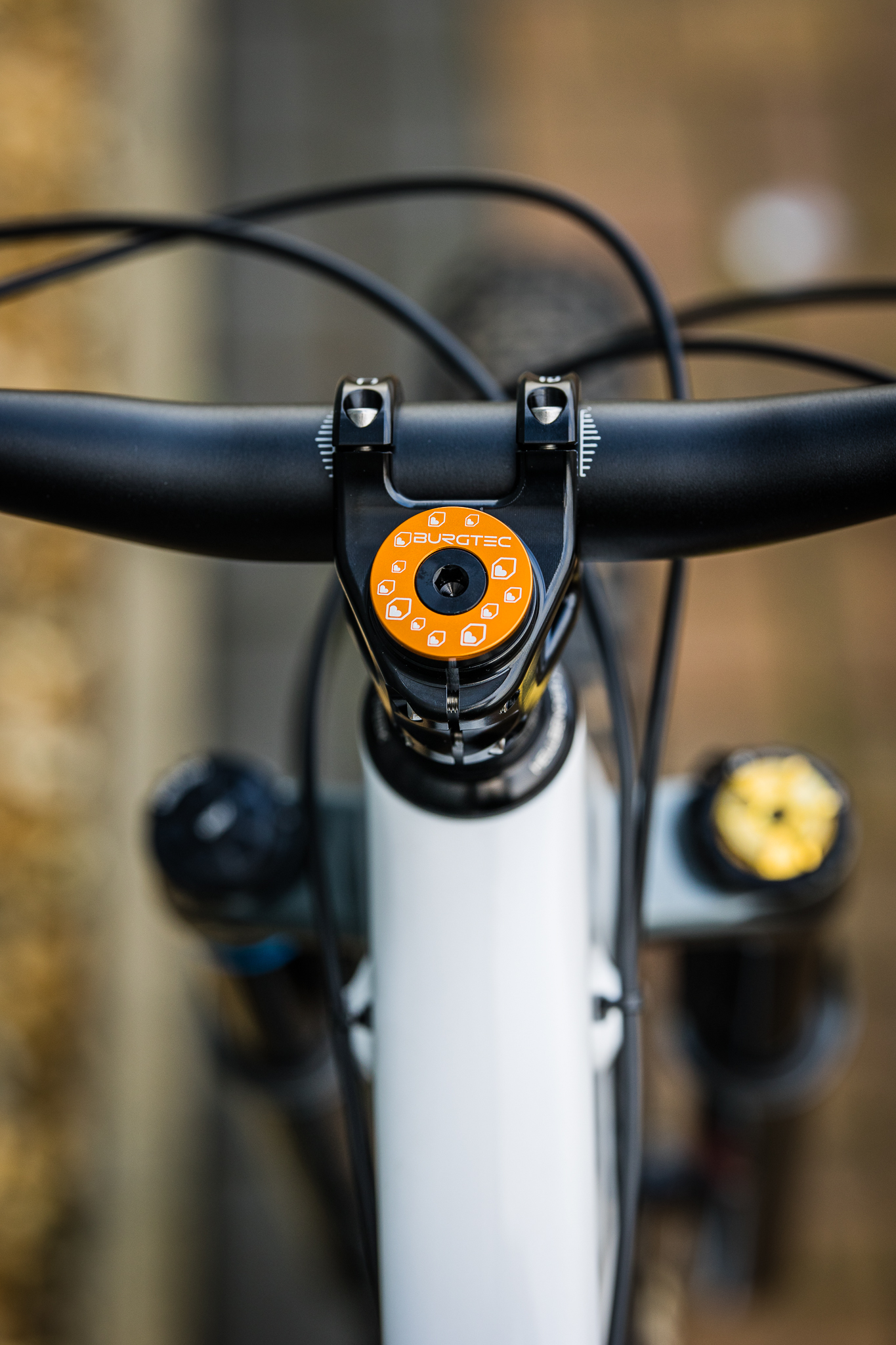 A Burgtec stem and bar combo spin in a Cane Creek Hellbender headset while Rev suspension grips keep things cushioned just the way David St. Hubbins would want them. Magura MT Trails take care of stopping duties.