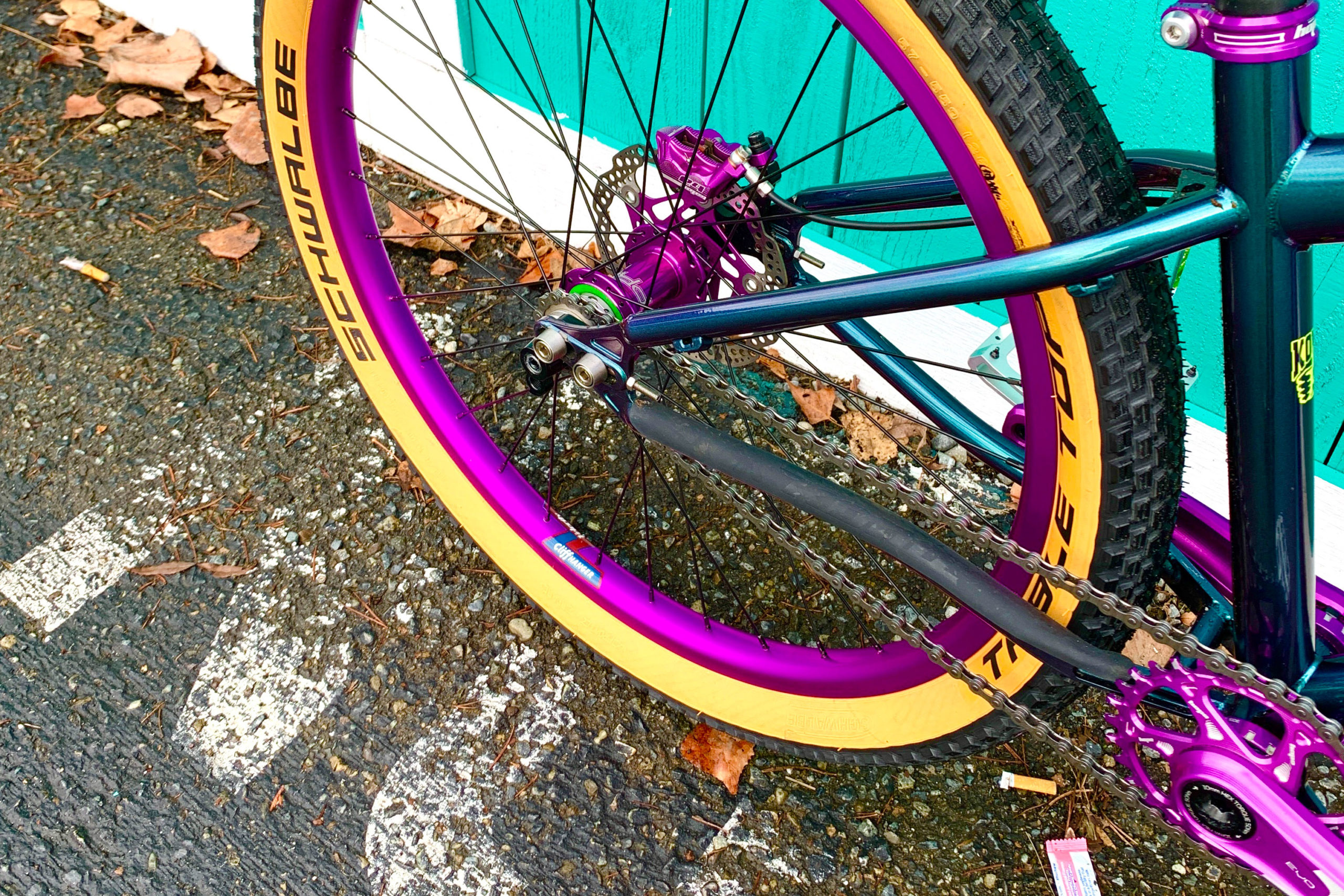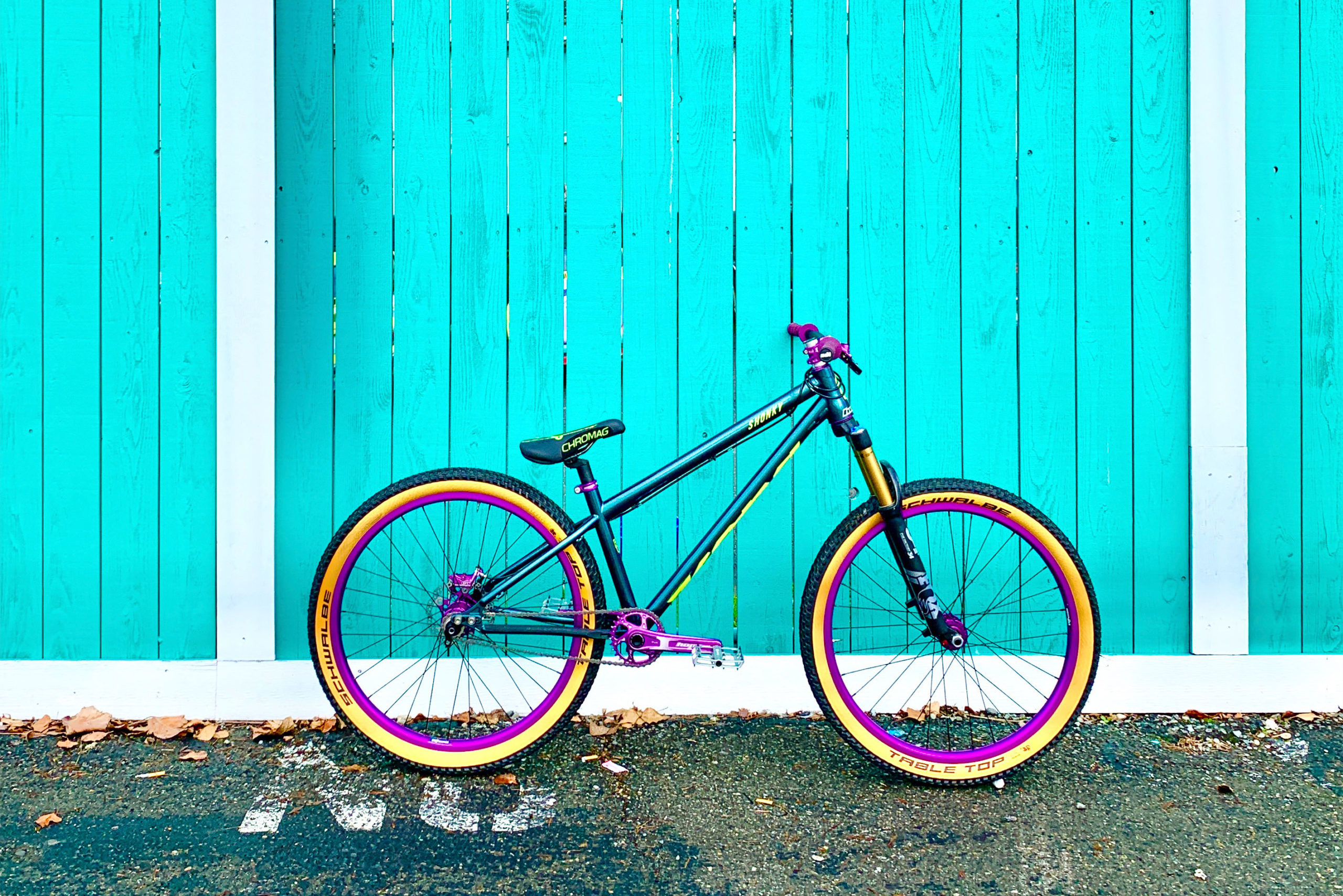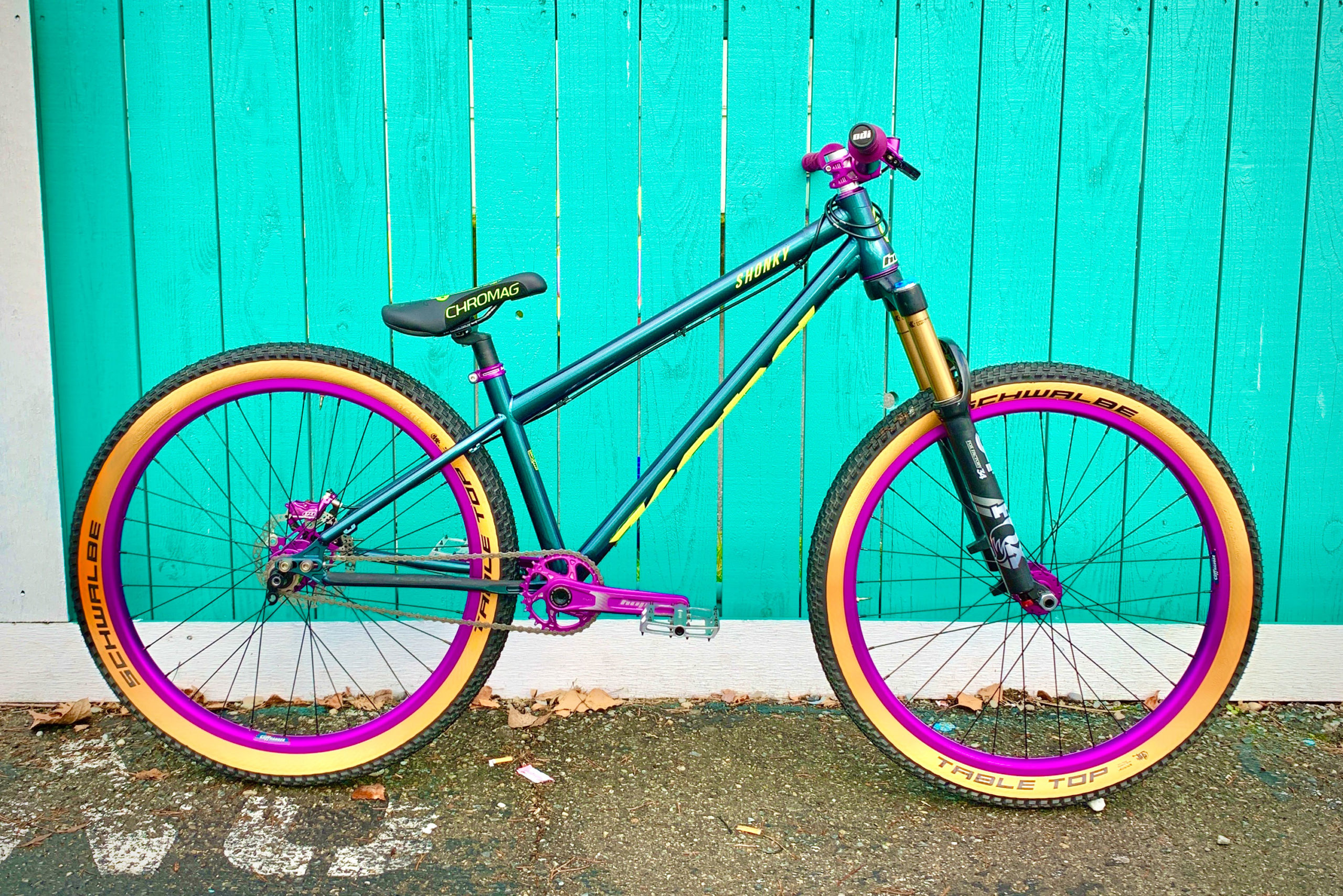 “I have a Big Honzo ST, and that thing is fantastic, so I had to go with a Shonky. This is the first bike that I have built for myself from the frame up so, yeah I may have gone a little over the top, but whatever. I feel like this is OK to do on a dirt jumper! The paint has purple in it so it just made sense. I also didn’t want it to fall apart, and I plan on crashing quite a bit on this thing. I know the frame can take it. I just wanted the components to hold up as well.