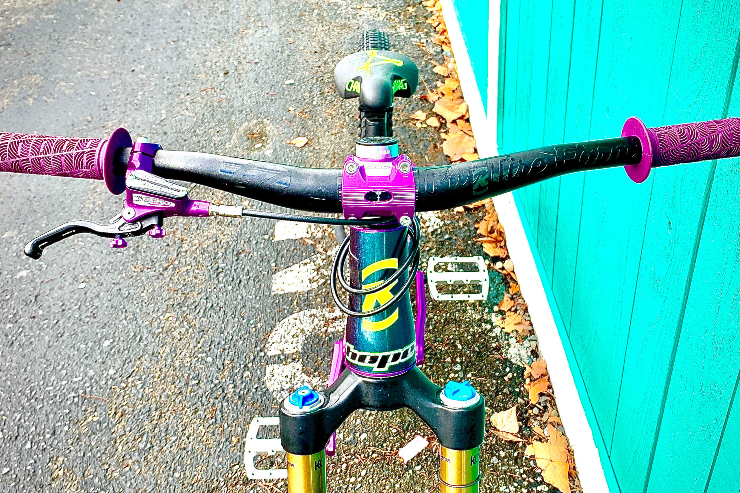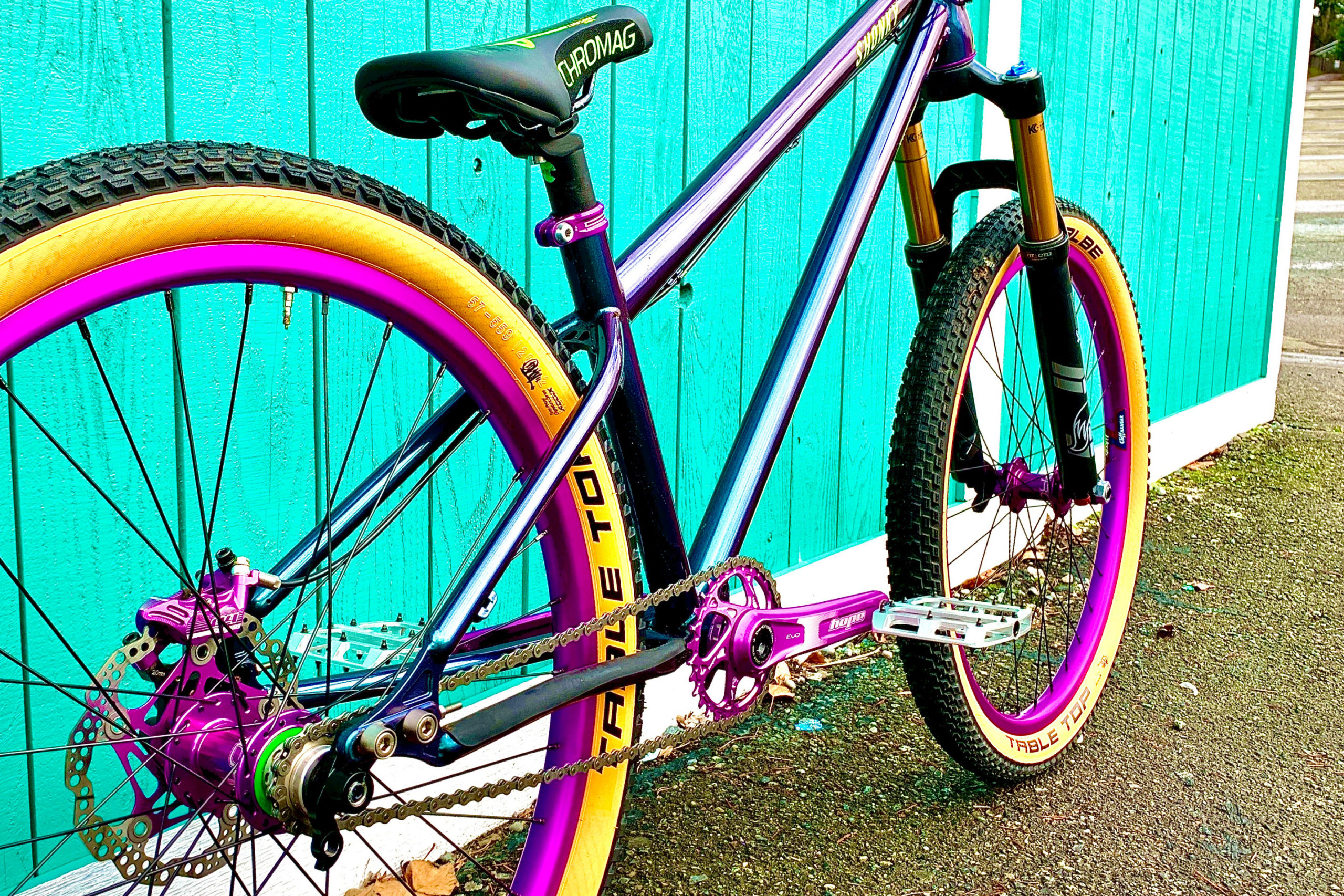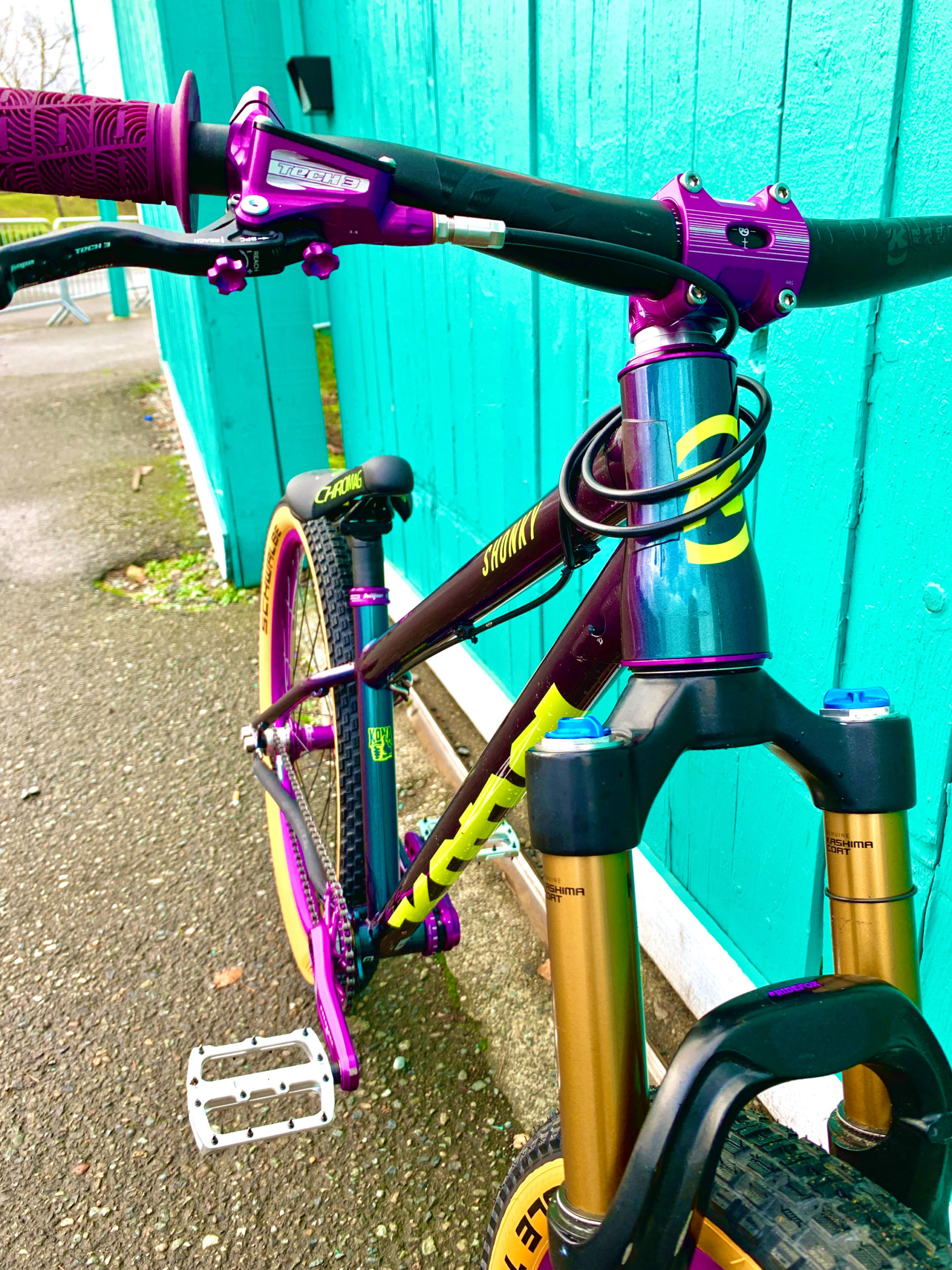 “I have a Big Honzo ST, and that thing is fantastic, so I had to go with a Shonky. This is the first bike that I have built for myself from the frame up so, yeah I may have gone a little over the top, but whatever. I feel like this is OK to do on a dirt jumper! The paint has purple in it so it just made sense. I also didn’t want it to fall apart, and I plan on crashing quite a bit on this thing. I know the frame can take it. I just wanted the components to hold up as well.