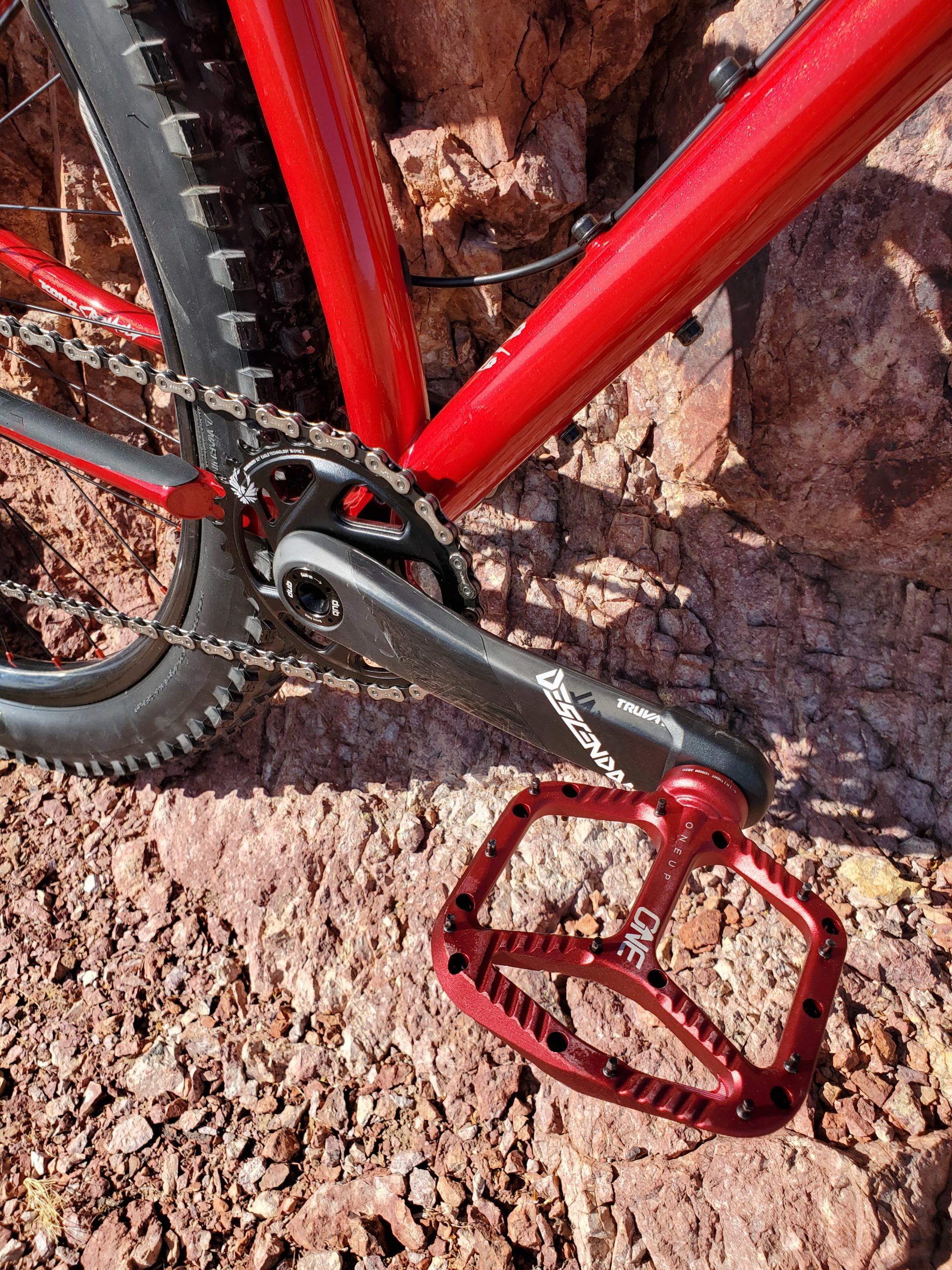 Some classic carbon SRAM Descendant cranks combined with OneUp’s alloy pedals power the ESD…
