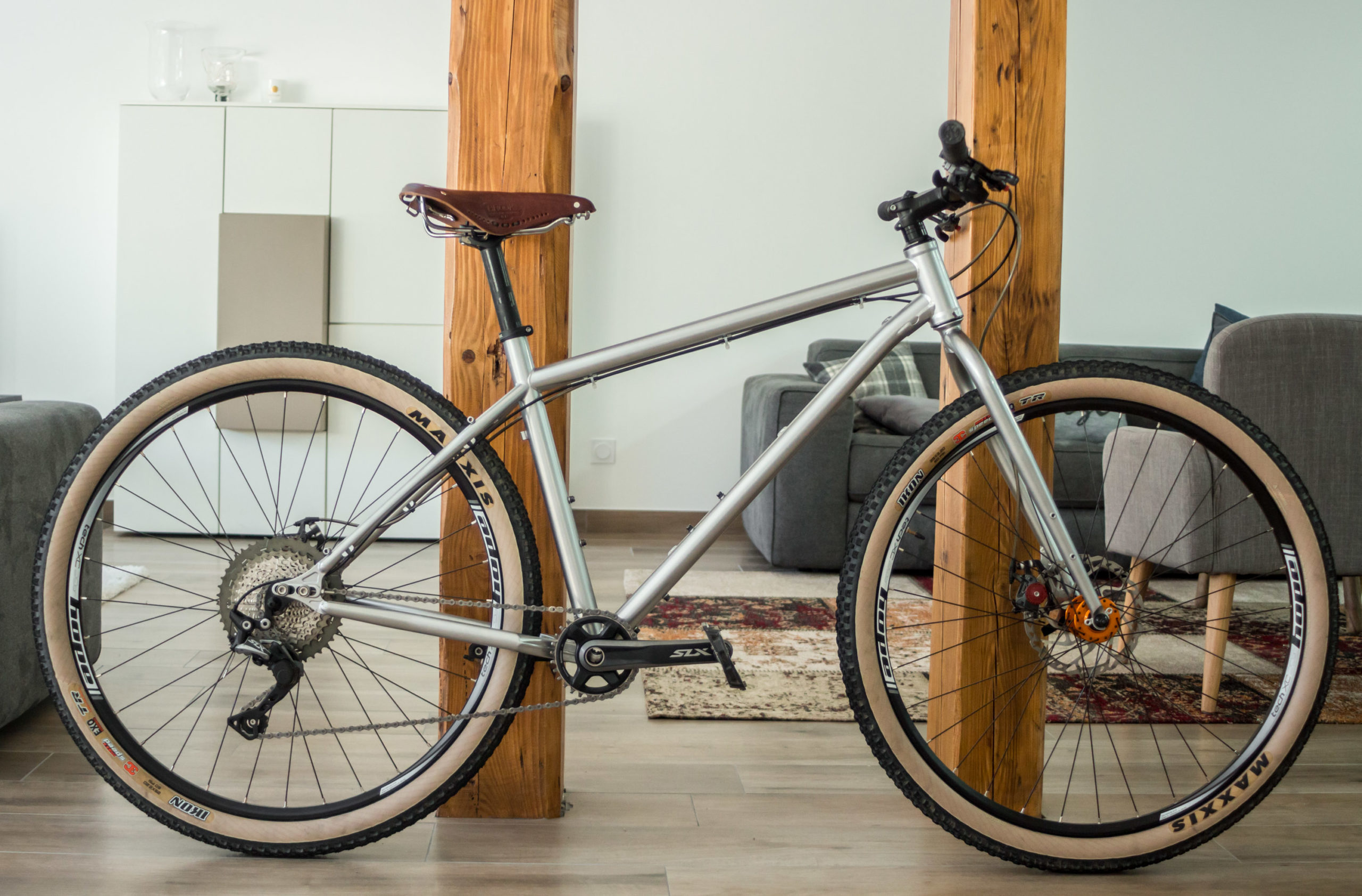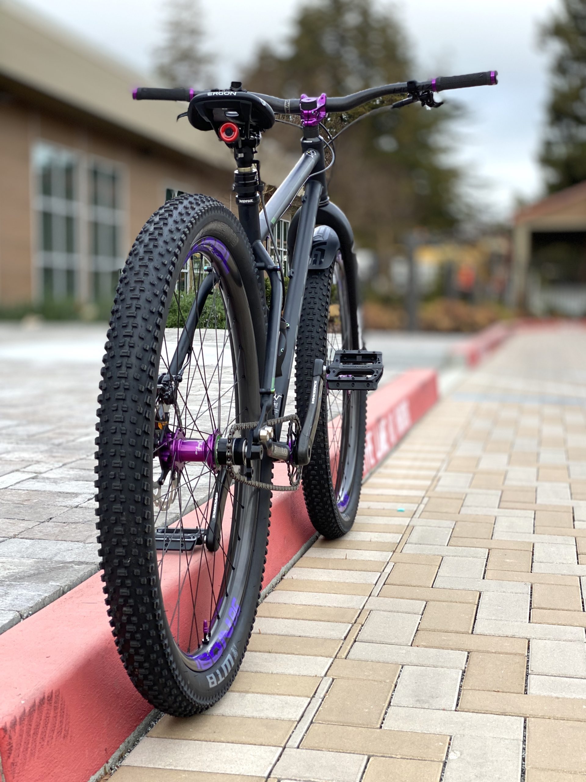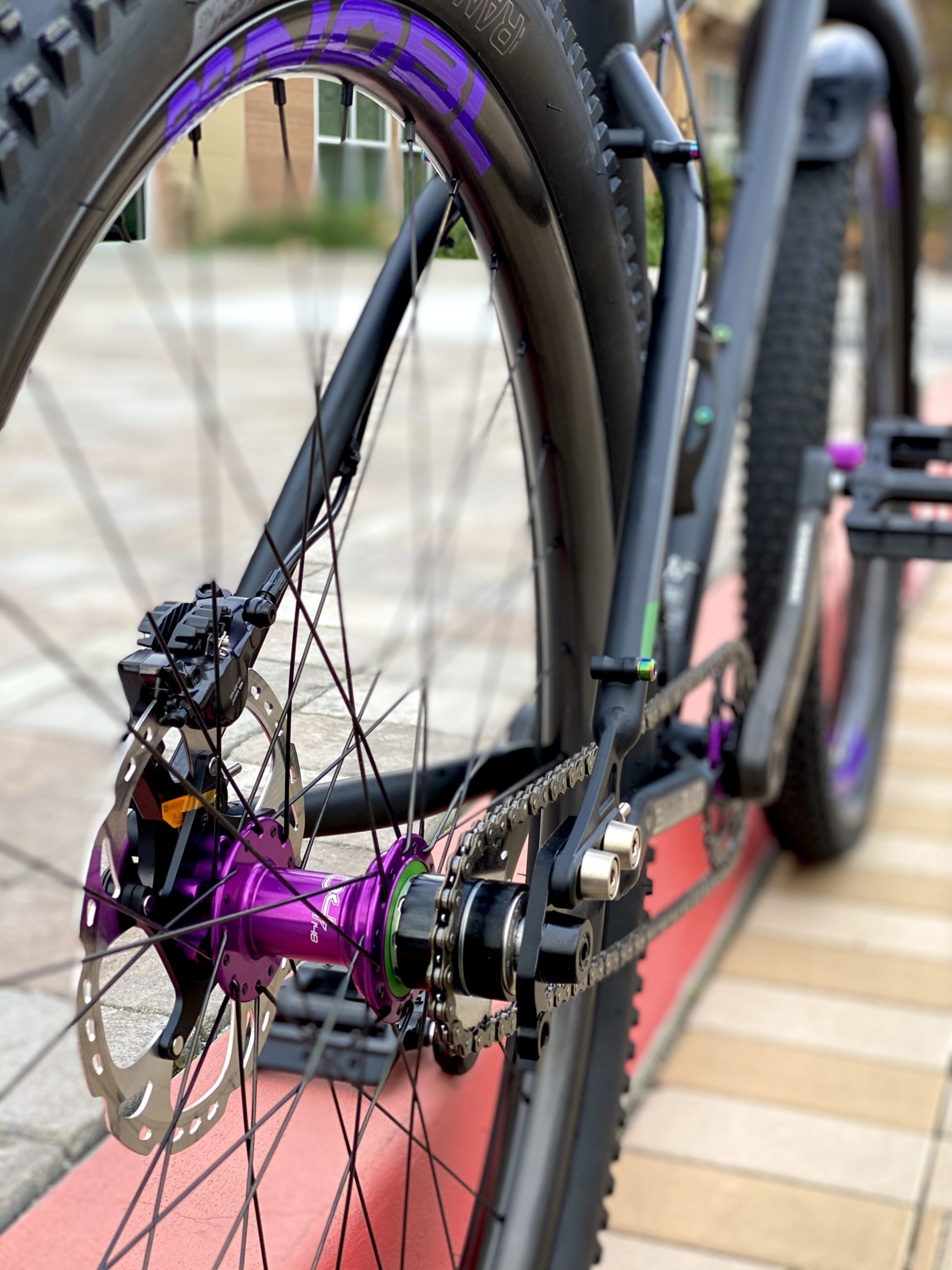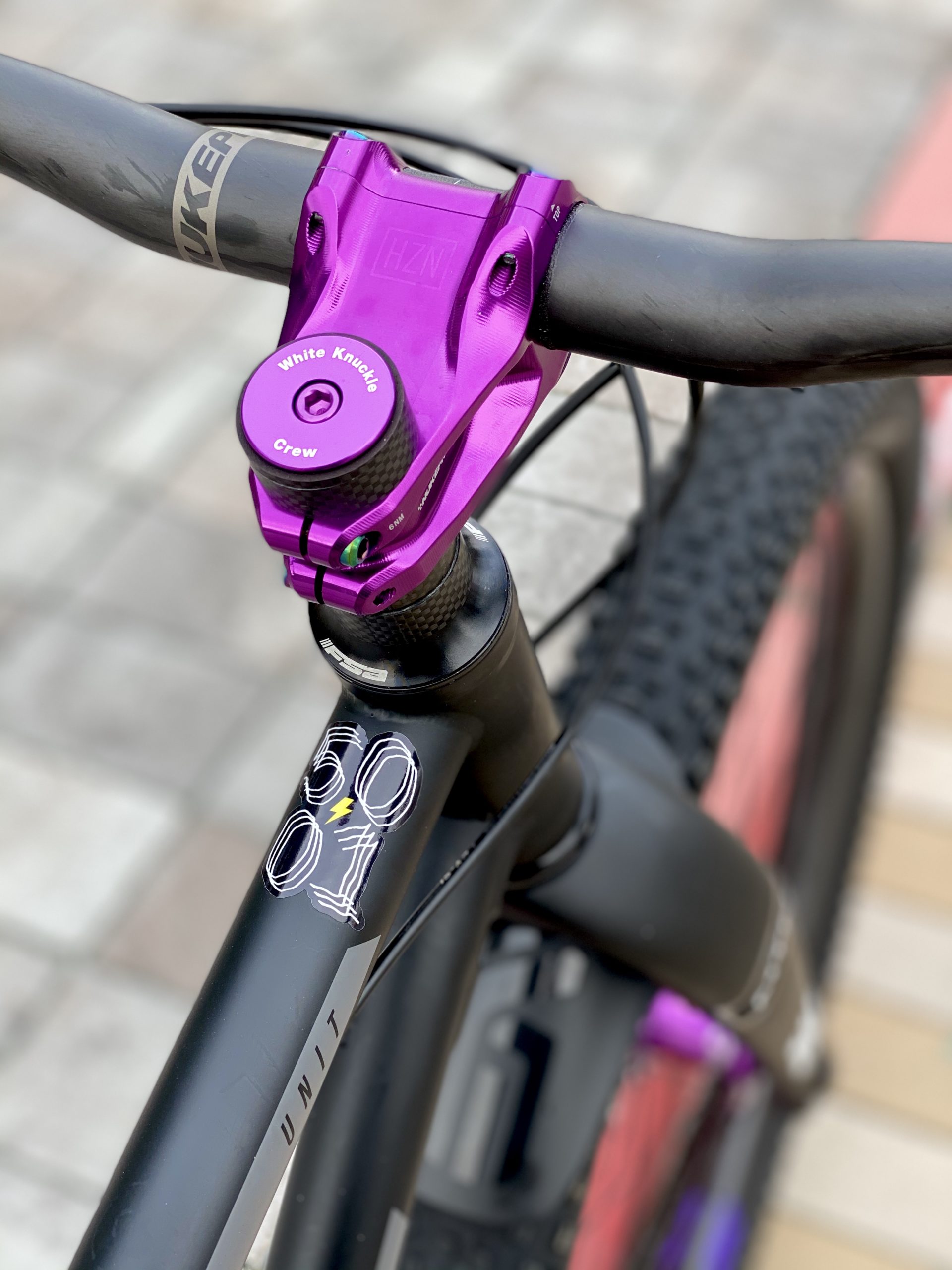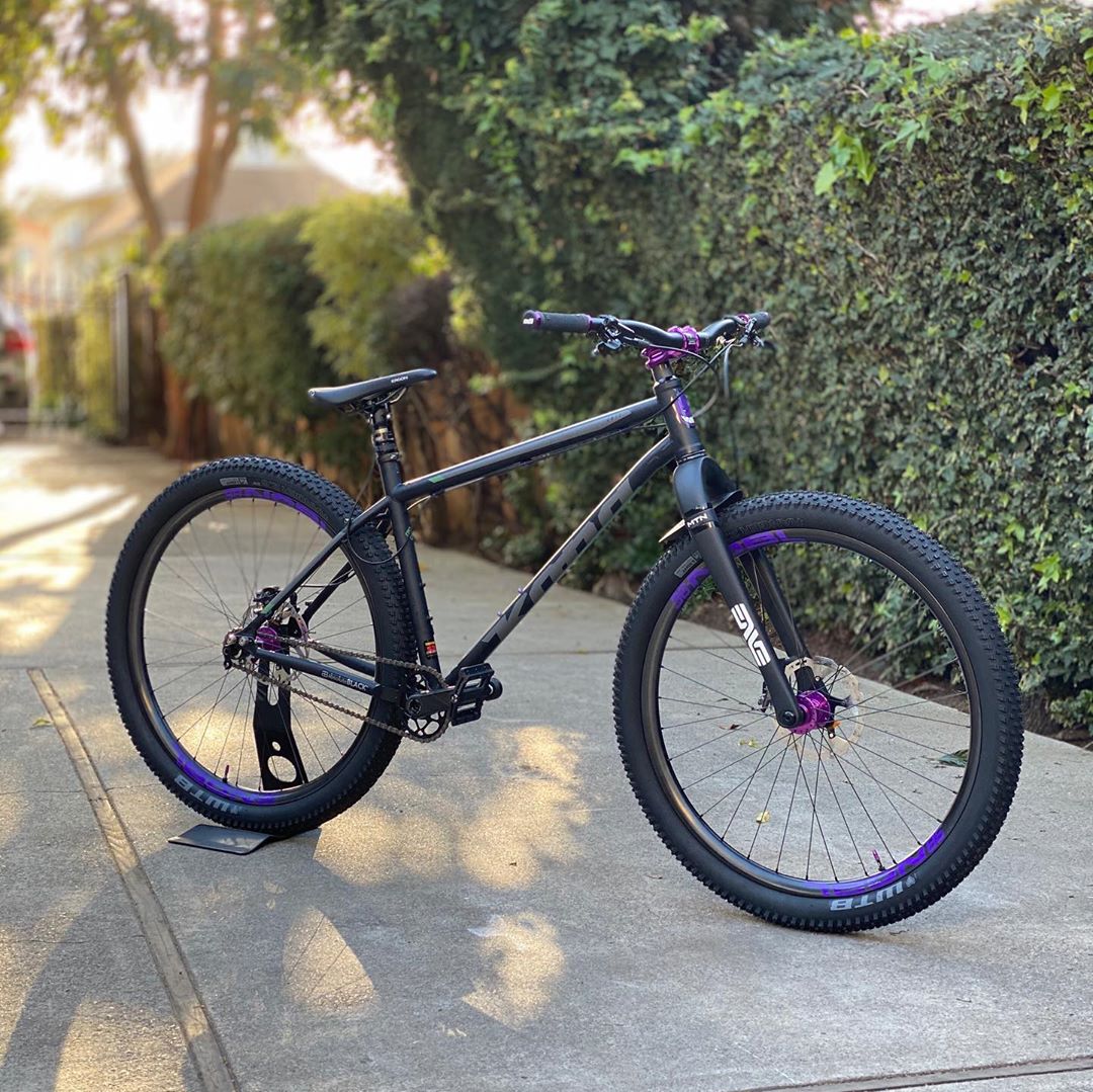 Looking at George Young’s Instagram feed clearly shows that he suffers from an addiction to building dream bikes. His feed is choc-full of them, the most recent one, is this stealthy black Kona Unit. Georges unit is a real mix of old and new, the Reynolds 520 frame is sporting a carbon ENVE Mountain fork and a set of NOBL TR38 wheels, there’s an assortment of anodized purple parts from Hope (the hubs), Nukeproof (stem) and ODI.