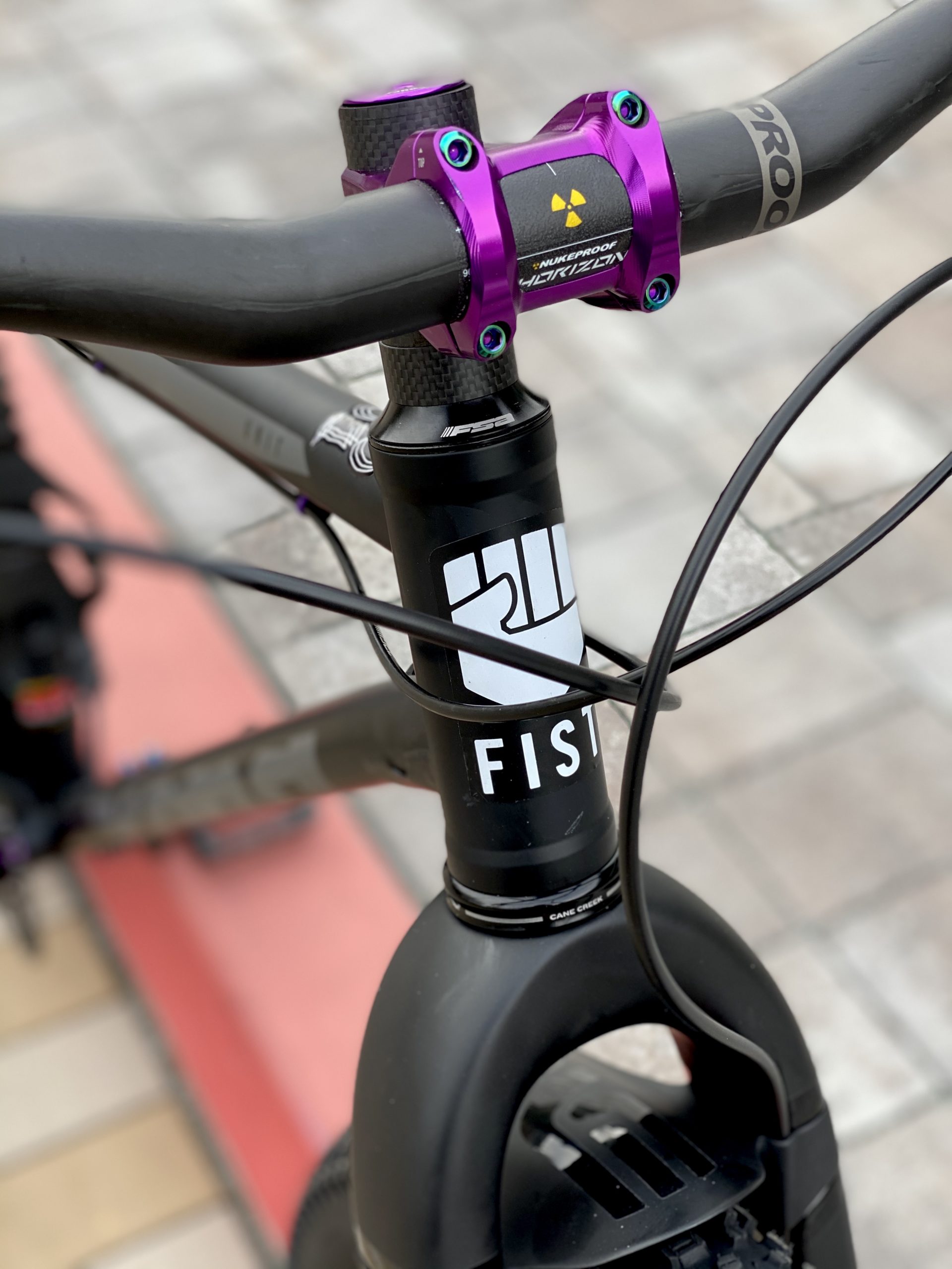 Here’s some more carbon, attached to that svelte looking Nukeproof stem is one cool Nukeproof Horizon handlebar.
