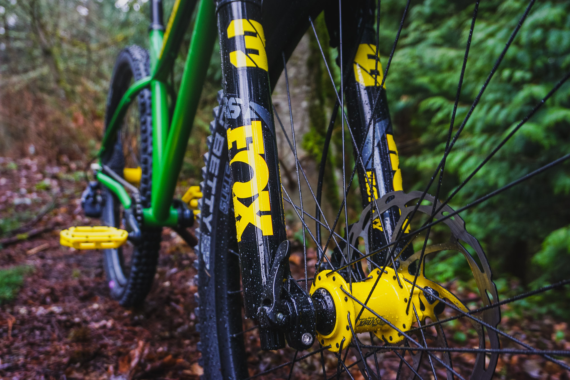 Suspension wise up you’ll find a custom decal’d Fox Factory Grip2 36 fork up front. The wheels are Stans Flow MK4 rims laced to yellow Onyx Hubs. The rims are shod with Schwalbe Magic Mary / Big Betty combo.