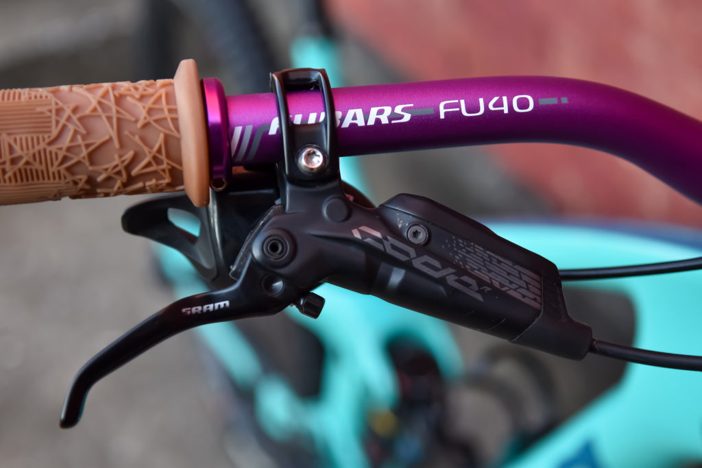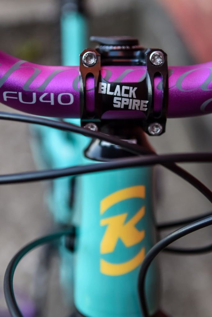 I chose an anodized purple Chromag FU40 riser bar to dial in the riding position and highlight the playful nature of this bike. I mounted it with a short Blackspire Components stem and slid on a set of USDA Prime Sensus Meaty Paws grips.