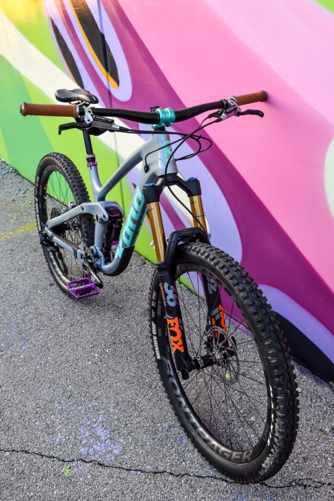 I then swapped out the stock wheels for a custom set built by my buddy James at Broomwagon. I strapped strong, lightweight Roval Traverse Carbon rims to Industry Nine 101 hubs. The quick engagement on the hubs is clutch for ratcheting through some southeastern gnar. Plus, after some training, the distinctive buzz helps our trail dog Stevie follow us down the mountain and find us if we get separated.