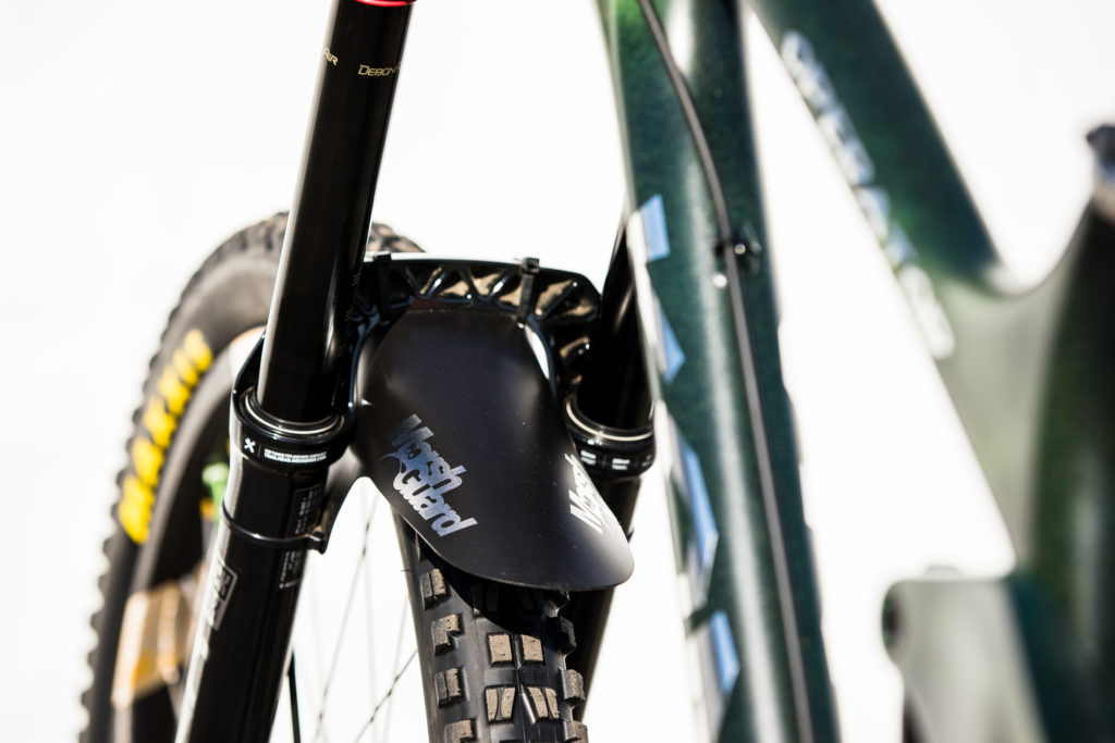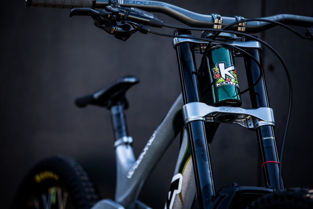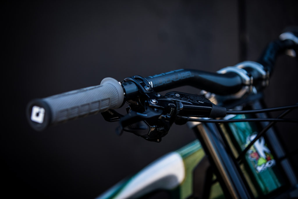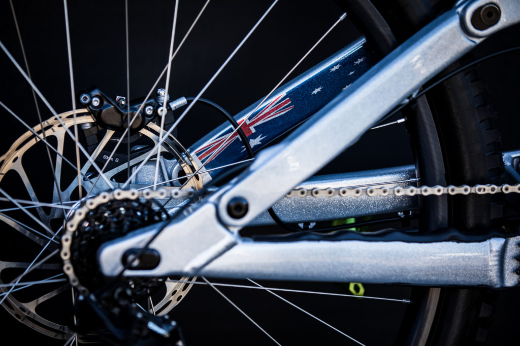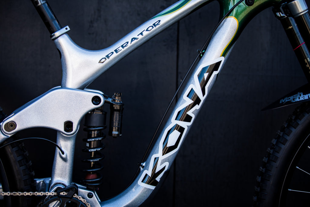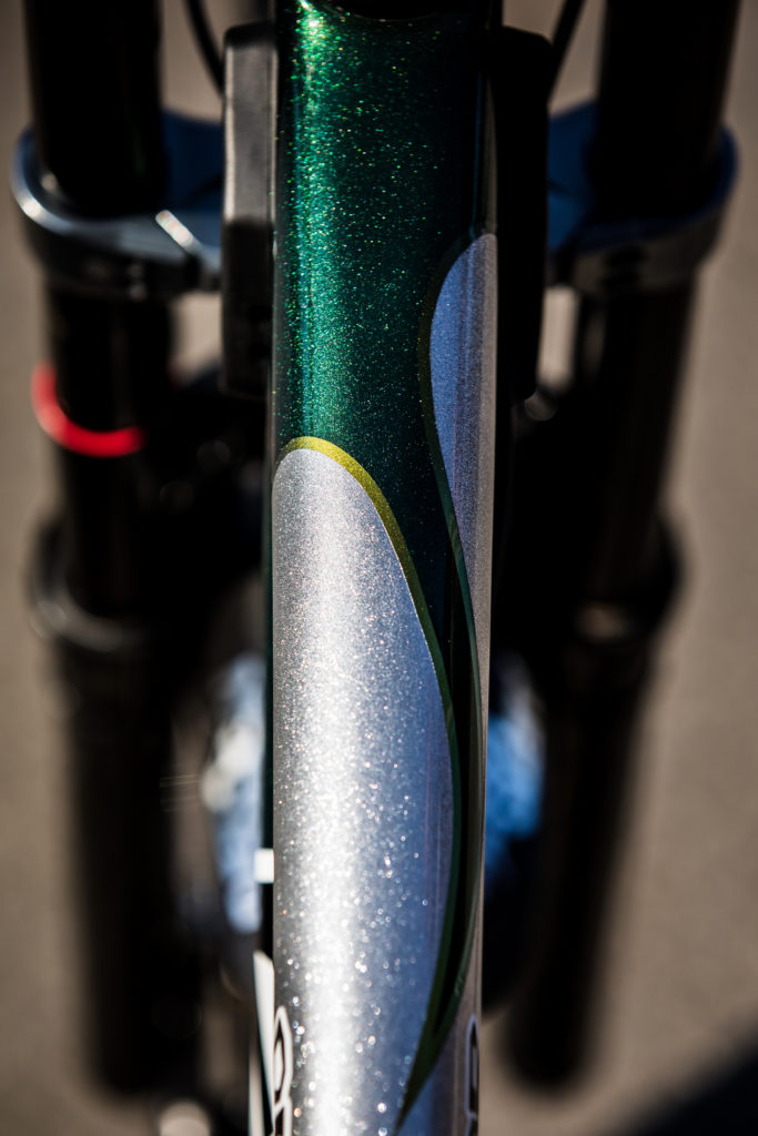 While Pat at Impact Designs was busy working on Connors bike, team mechanic Alex Pleasant was busy stripping and painting Jackson Frew’s bike as well as polishing every single bolt to produce this stealthy forest green and silver rocket, complete with throwback 98′ graphics to boot.