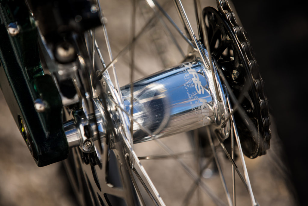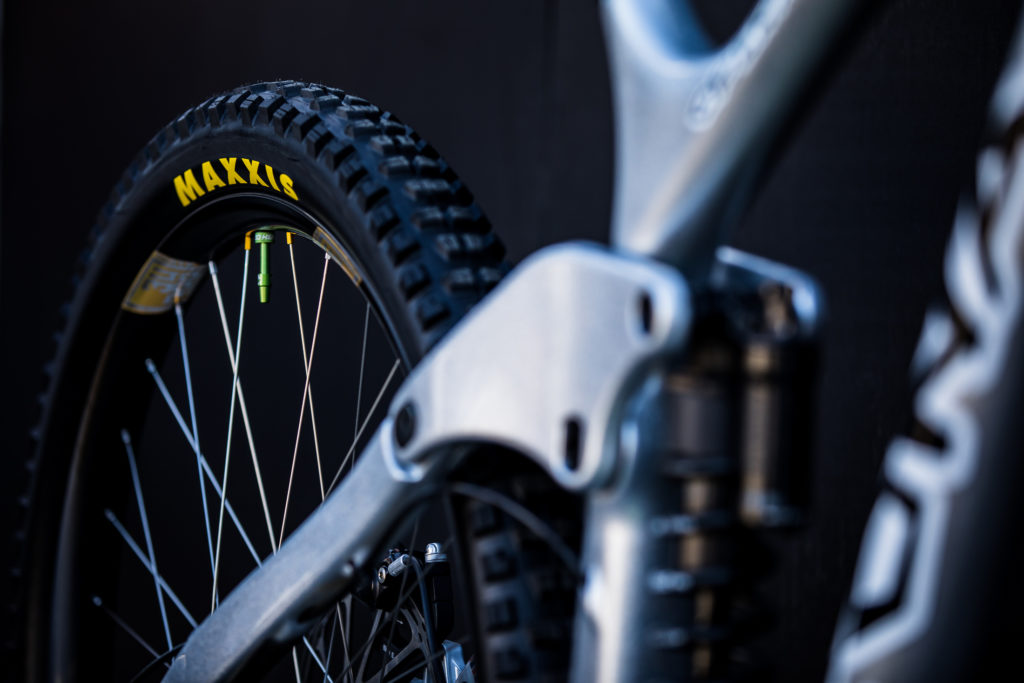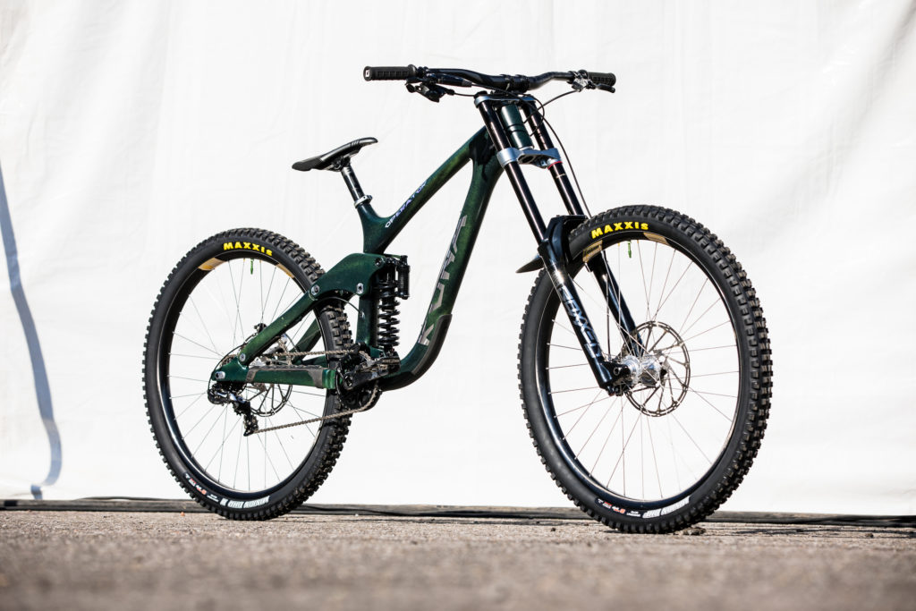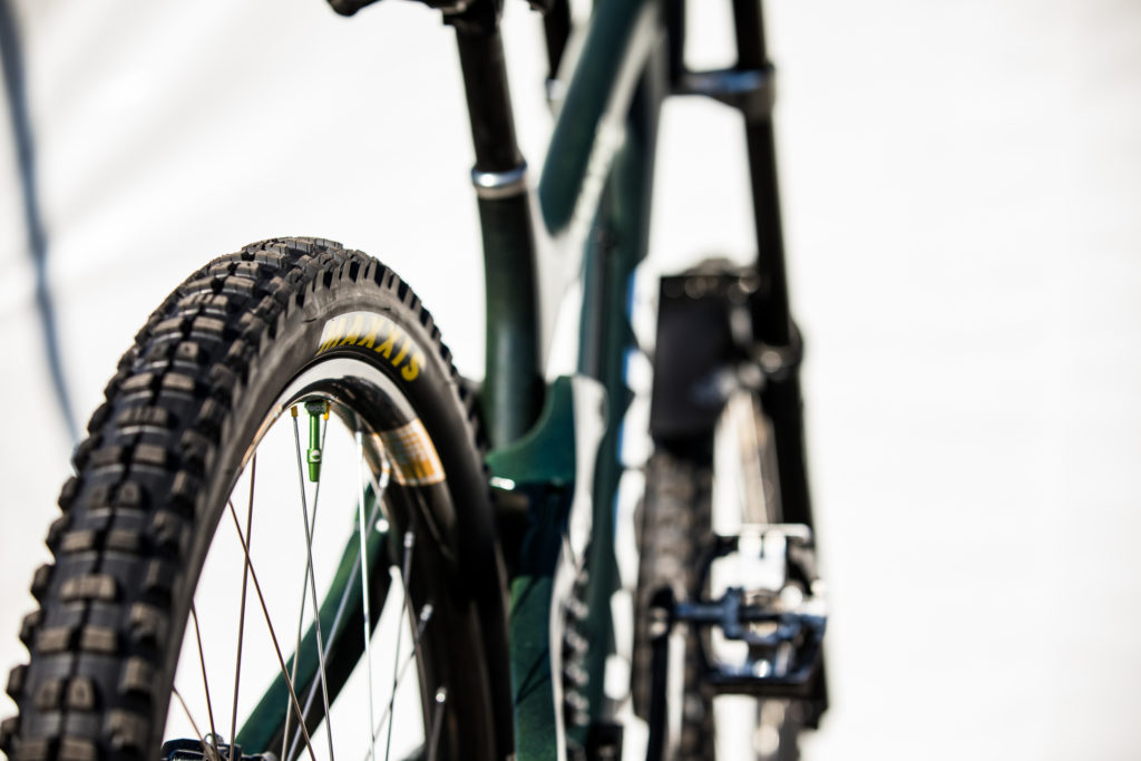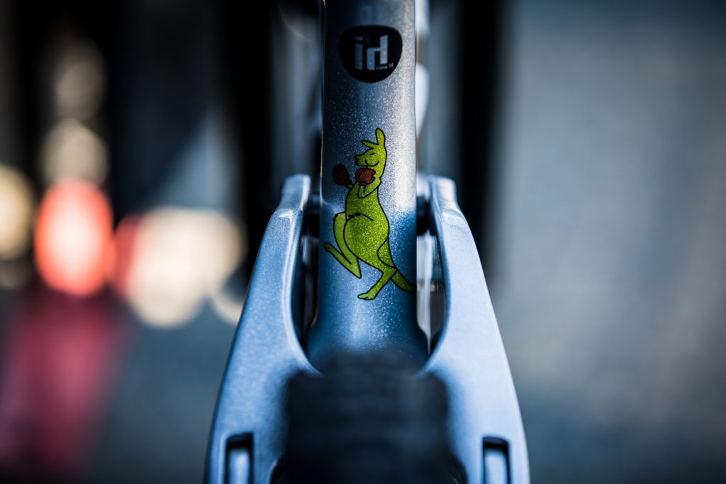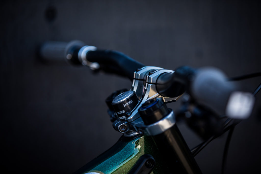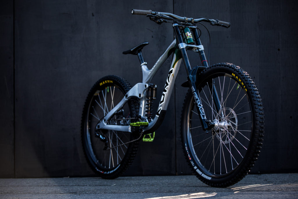 While Pat at Impact Designs was busy working on Connors bike, team mechanic Alex Pleasant was busy stripping and painting Jackson Frew’s bike as well as polishing every single bolt to produce this stealthy forest green and silver rocket, complete with throwback 98′ graphics to boot.