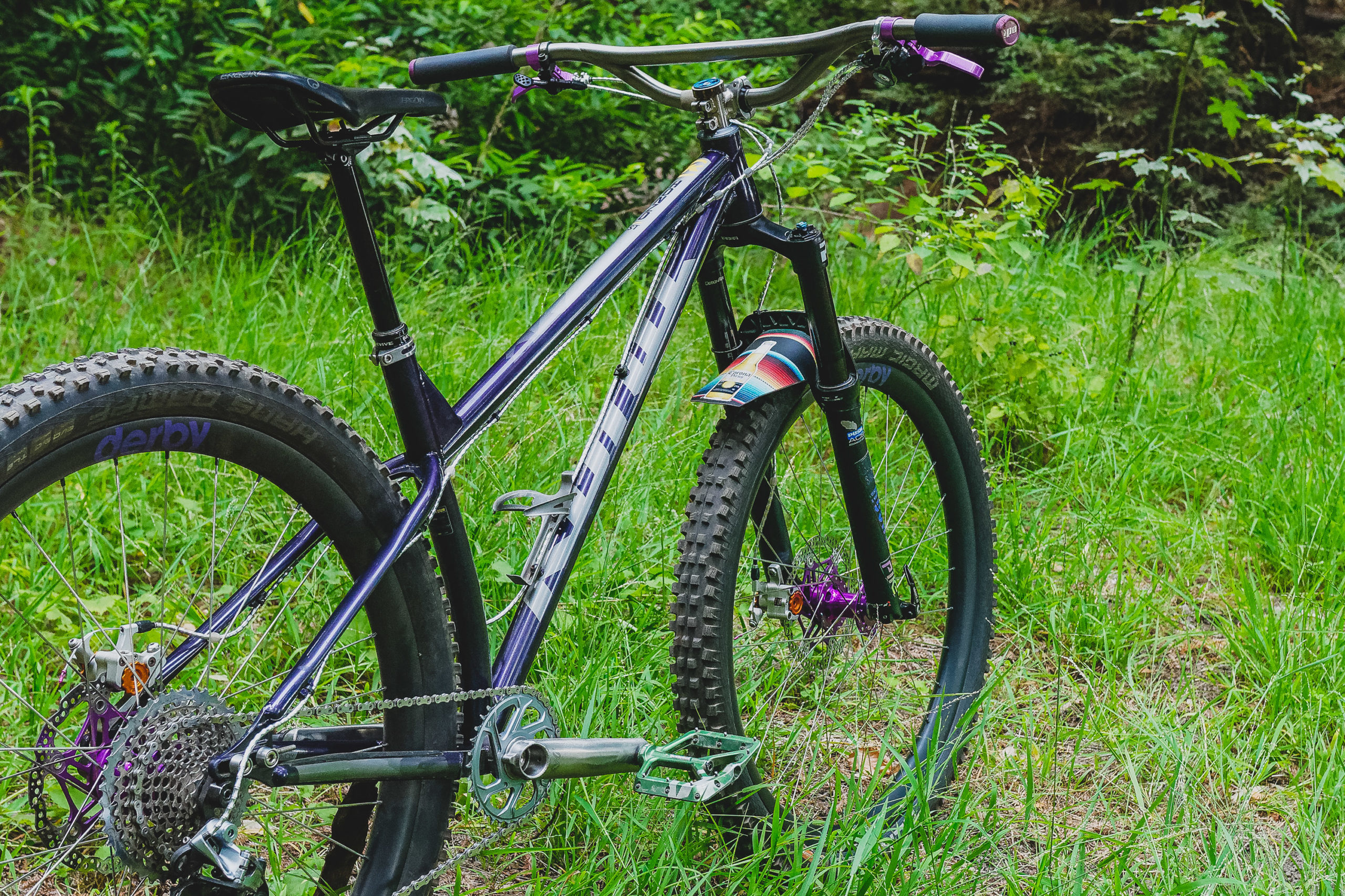Some classic Derby carbon rims are laced to a set of Phil Wood hubs while a matching purple Hope floating rotor aids in slowing this rig down. The custom stickered Pikes are sporting a Push Industries HC97 Compression System.