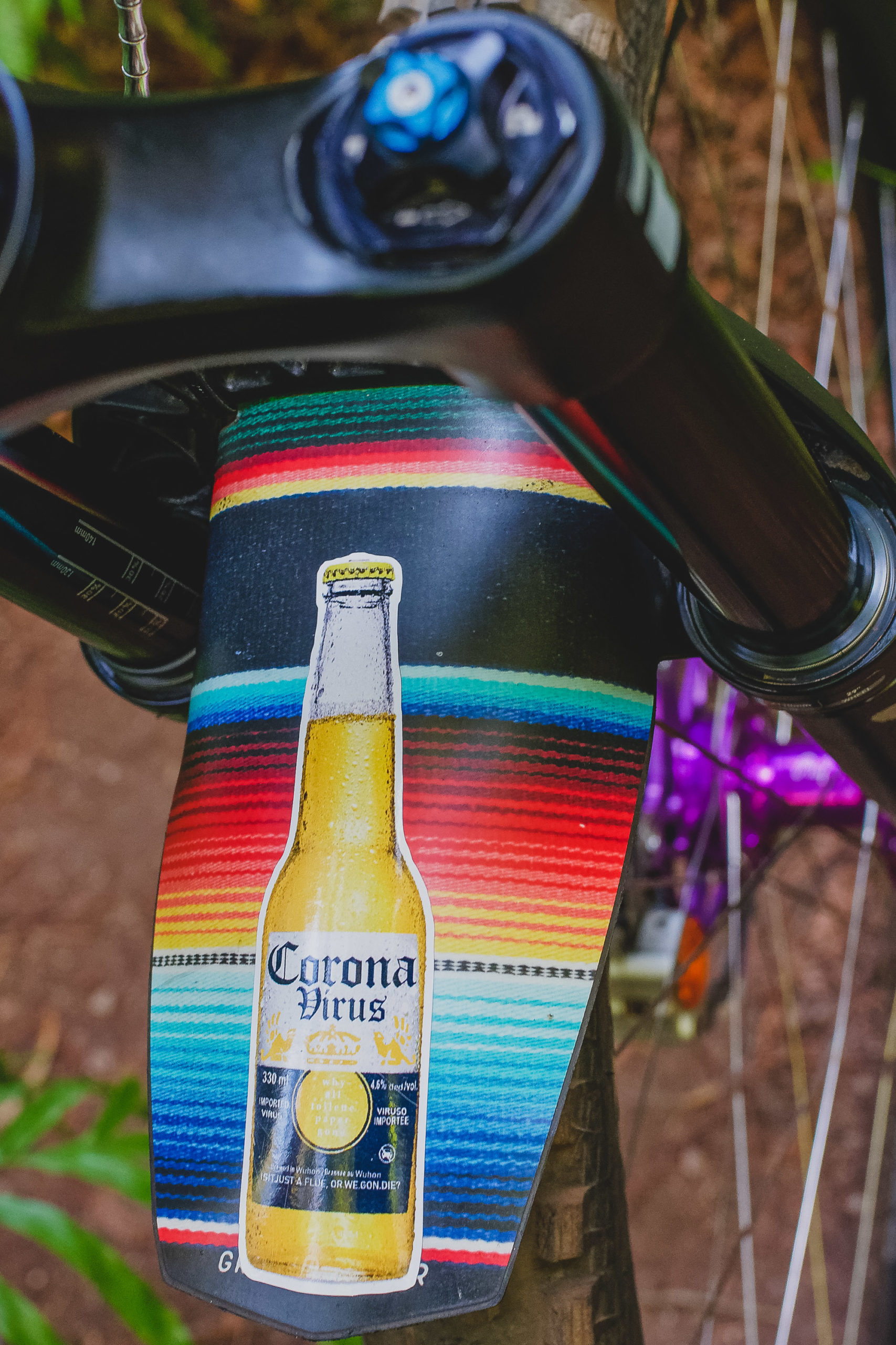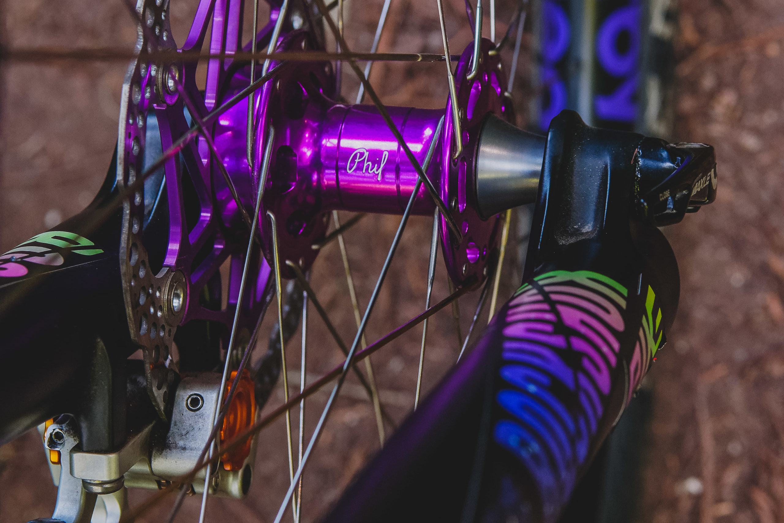 Some classic Derby carbon rims are laced to a set of Phil Wood hubs while a matching purple Hope floating rotor aids in slowing this rig down. The custom stickered Pikes are sporting a Push Industries HC97 Compression System.