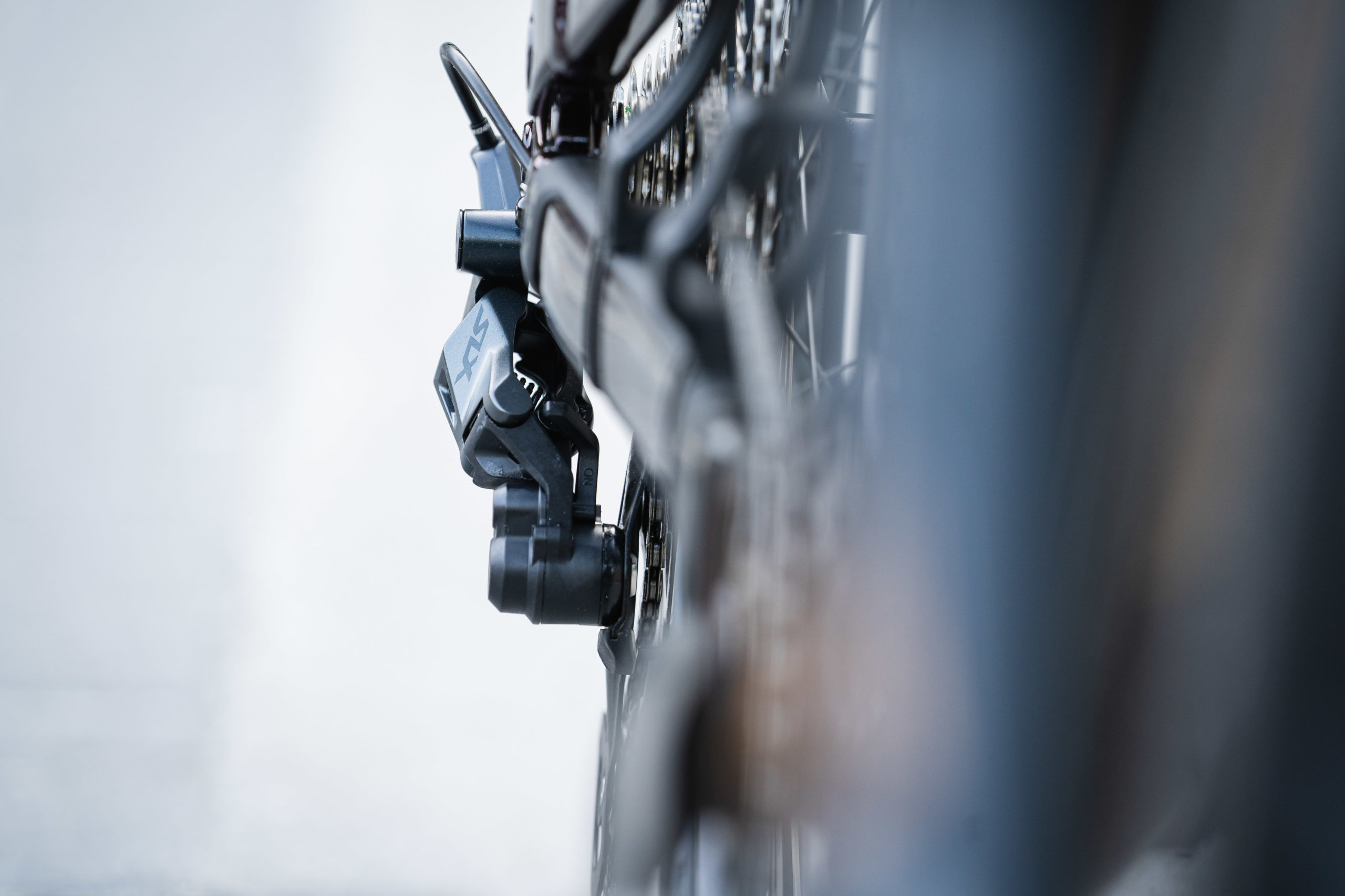 That 12-speed SLX rear derailleur tucks in out of the way.