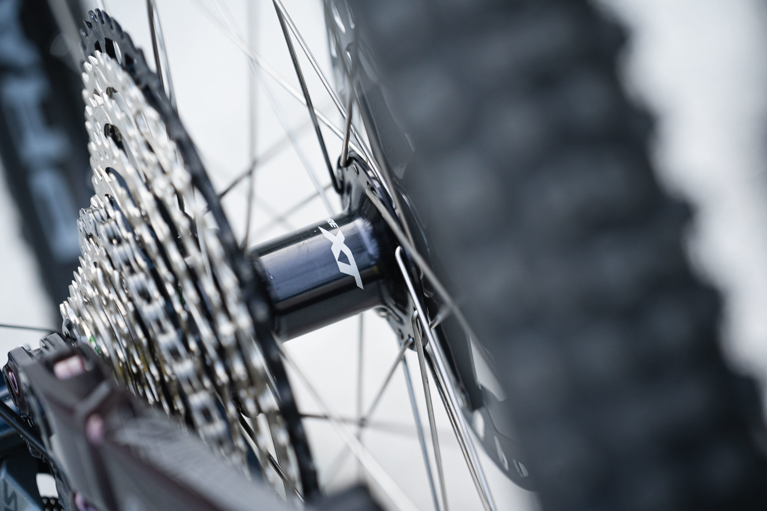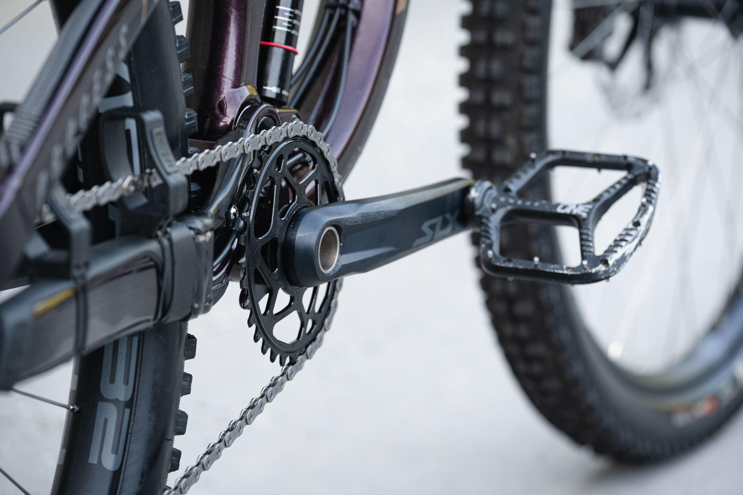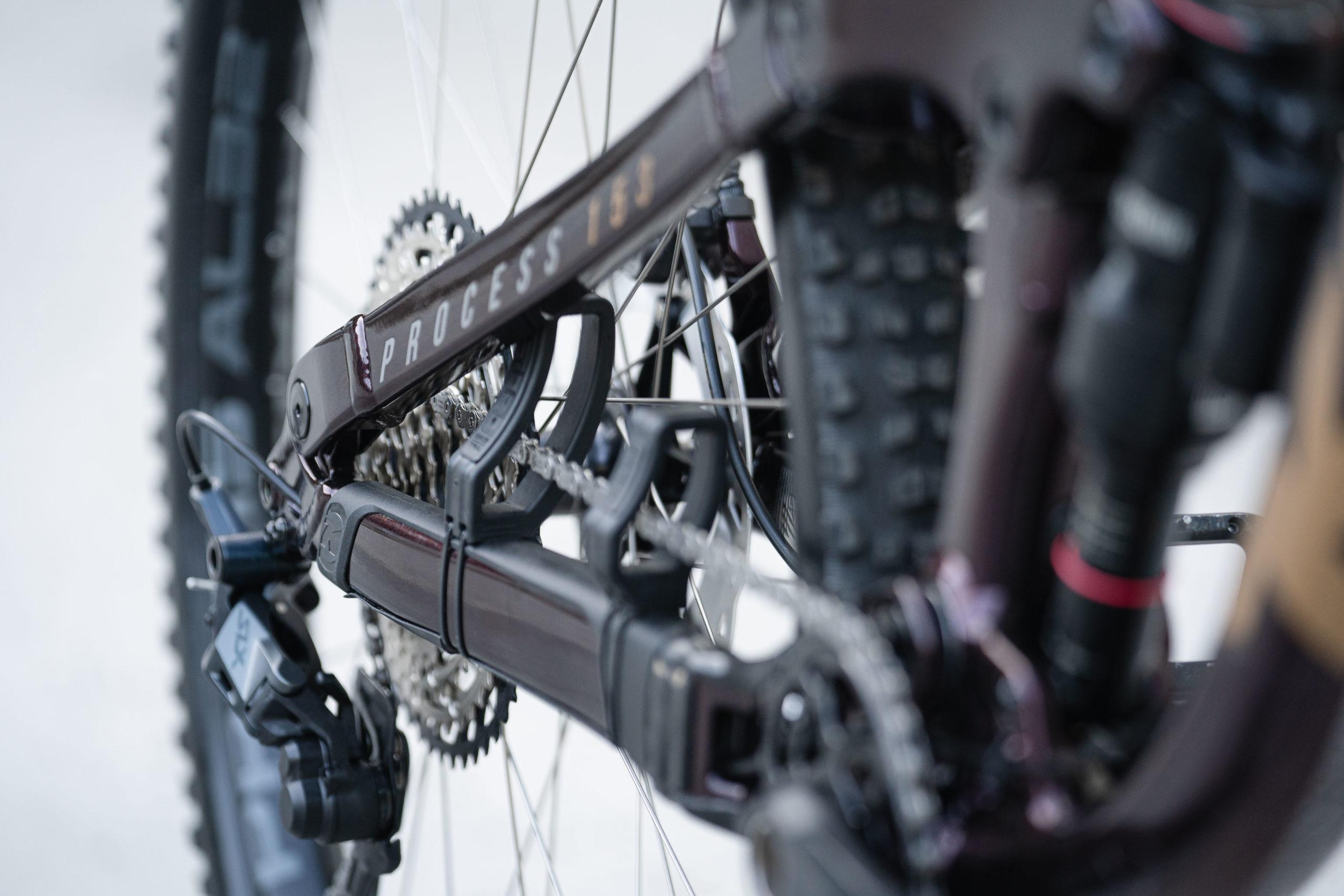 That 12-speed SLX rear derailleur tucks in out of the way.
