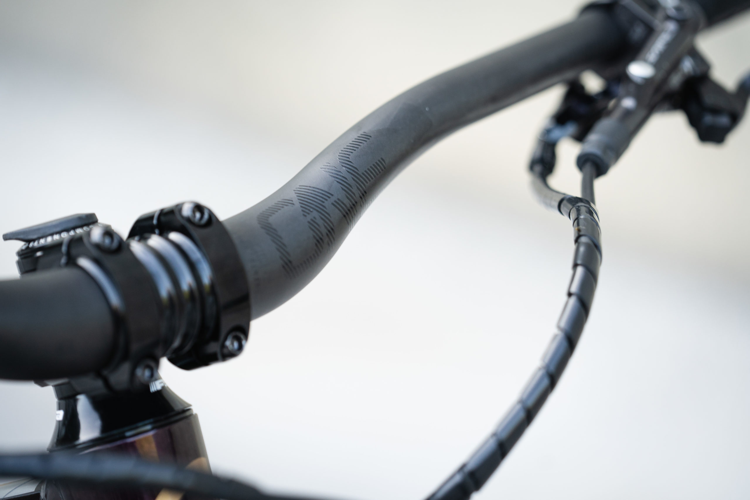 How rad do tidy cables look! A Deity stem holds OneUps 35mm rise carbon bar in place while Shimano’s powerful Saint stoppers take care of braking.