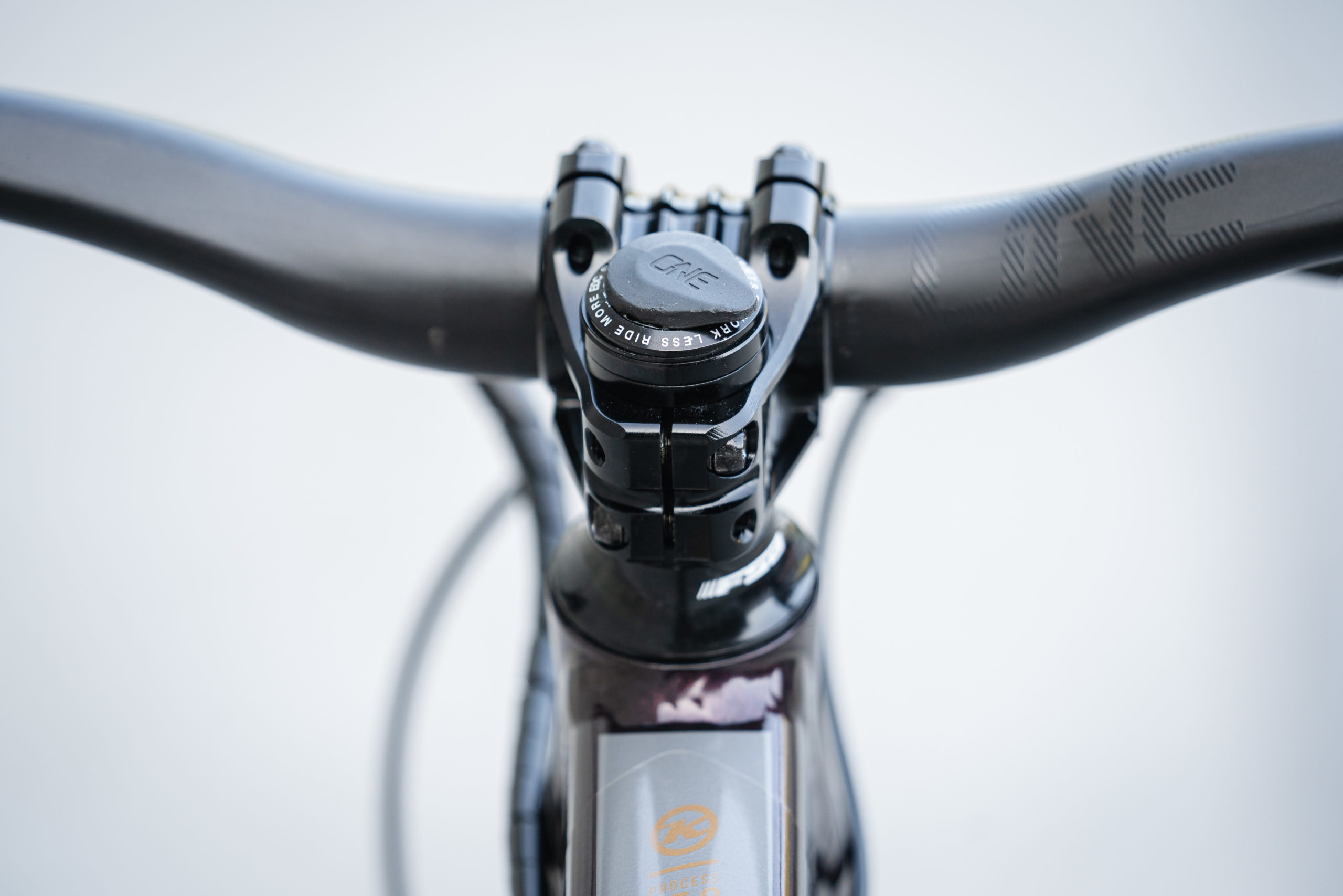 OneUp’s classic EDC tool is tucked away in the bikes steerer tube.