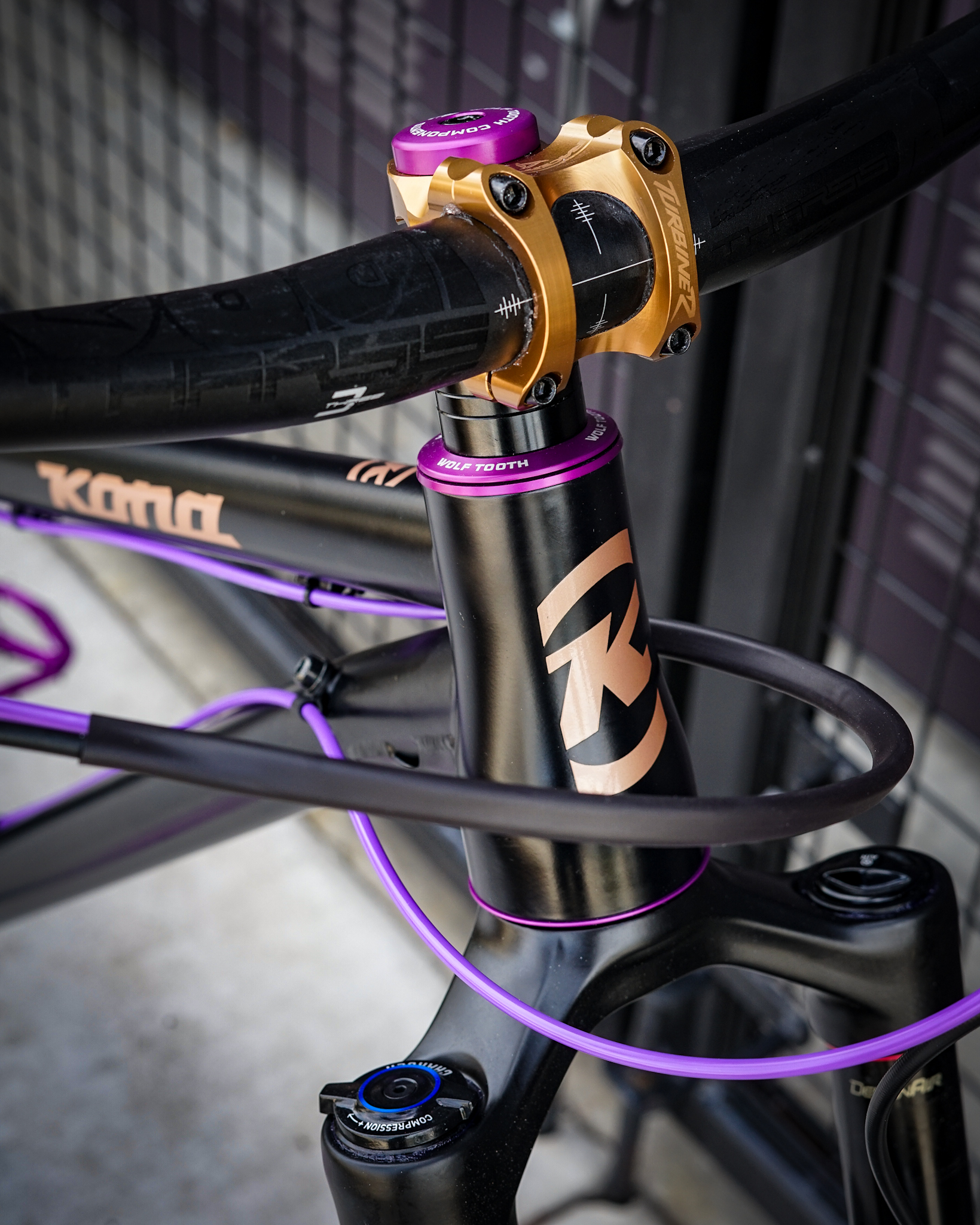 A Wolf Tooth headset ensures that the Race Face Turbine R stem and Pro Tharsis handlebar spin smoothly.