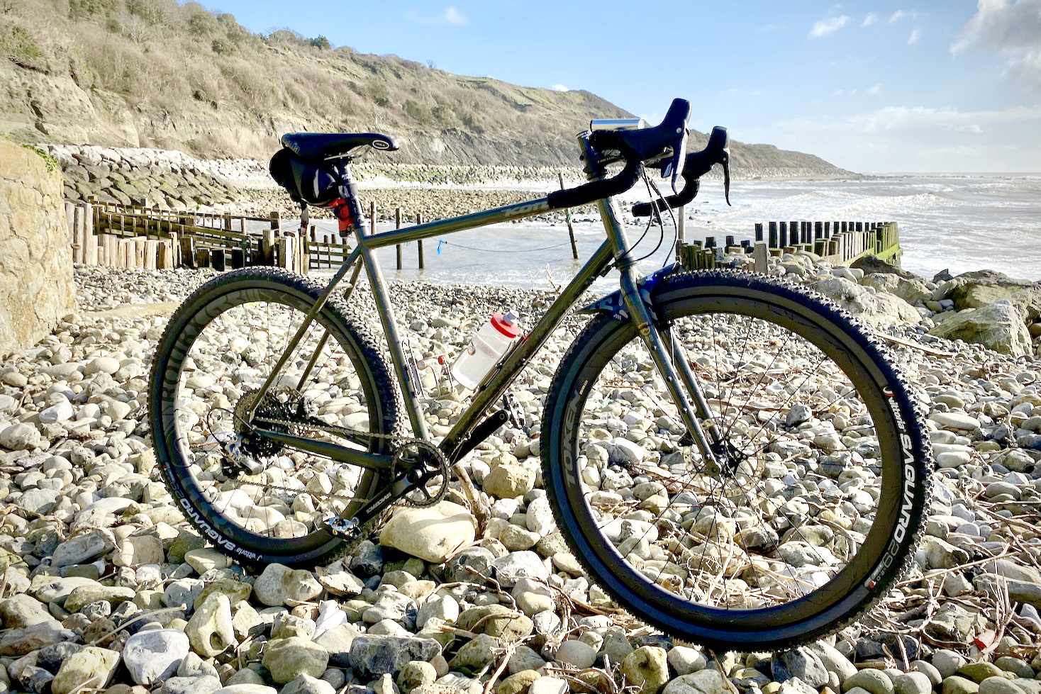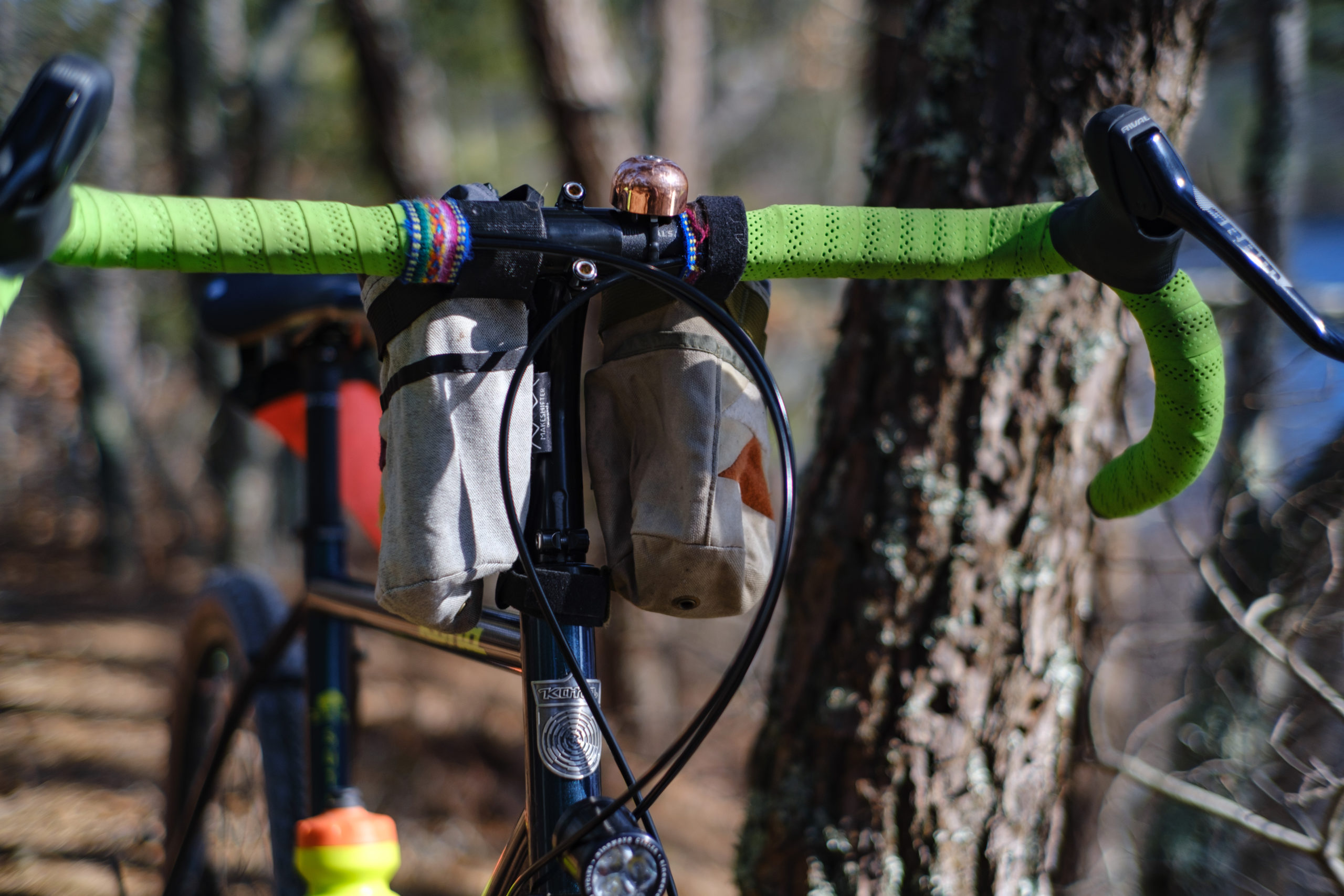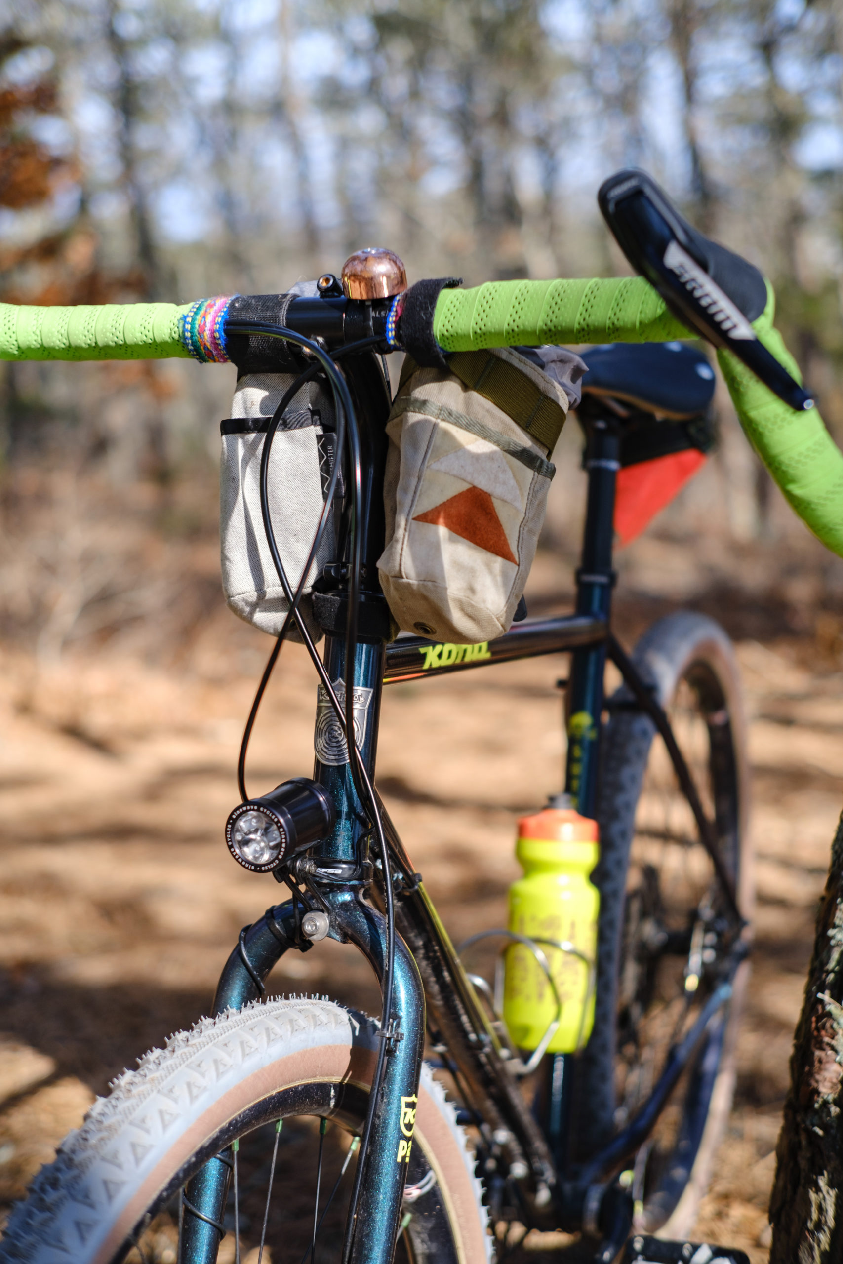 I swapped out the stock seat with a Brooks Cambium All Weather for stylish, gruntle cradling undercarriage support. Cockpit enhancement came via a Velo Orange ‘LD’ gooseneck stem thrusting upwards into Salsa’s new ultra-wide 52CM Cowchipper Deluxe bars, a combo that keeps my chest open and shoulders squared for yoga breathing in a nice upright position. I like a little squish at the ol’ contact points, so I engorged my Cowchippers with a double layer of Bar Fat and luxuriously wrapped ‘em in soft-touch Fizic tape.