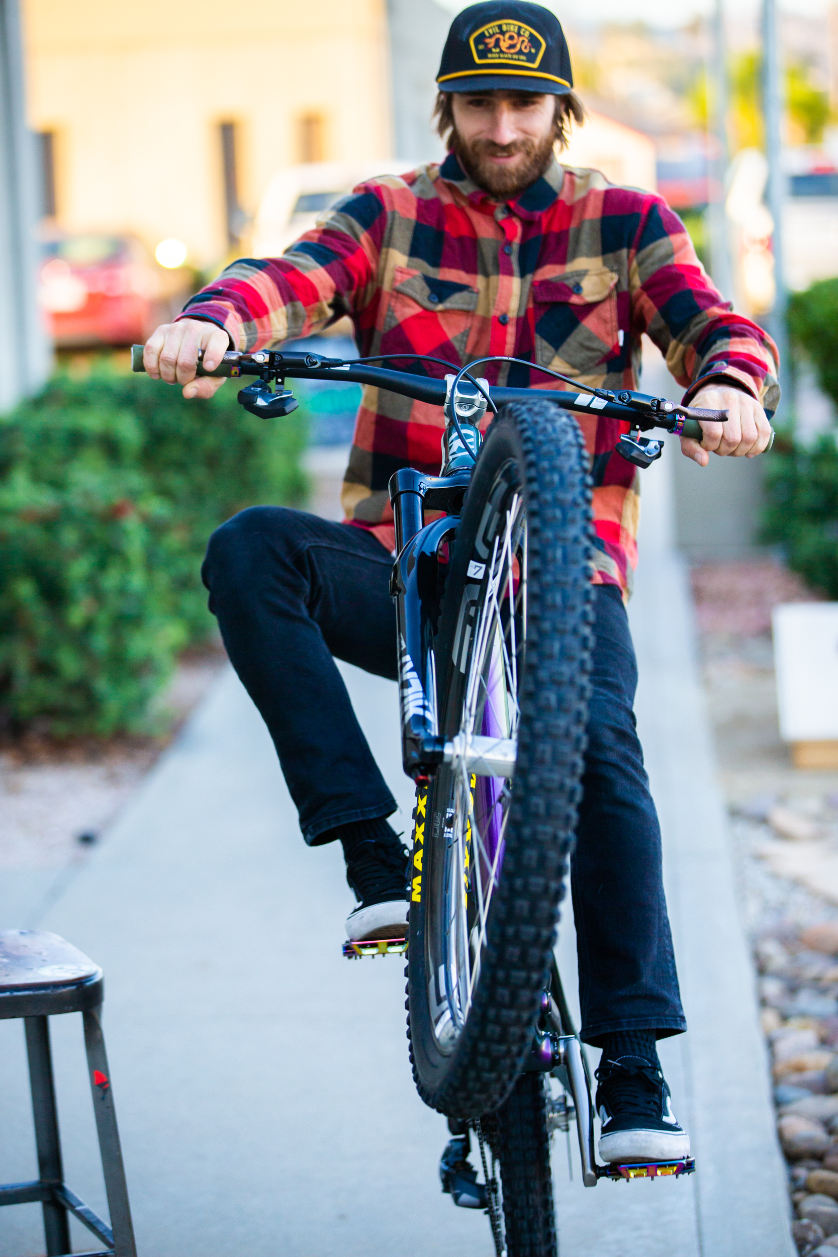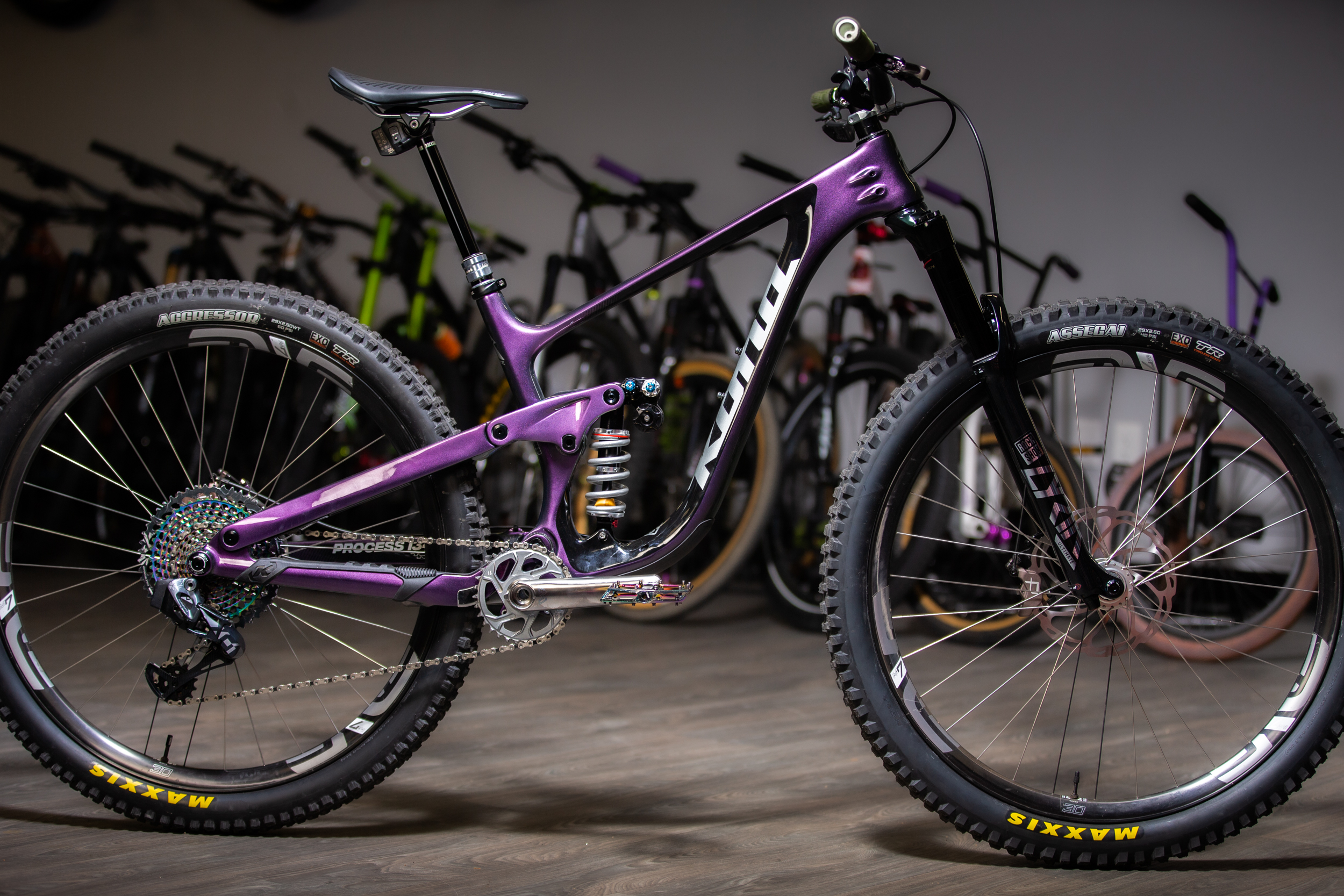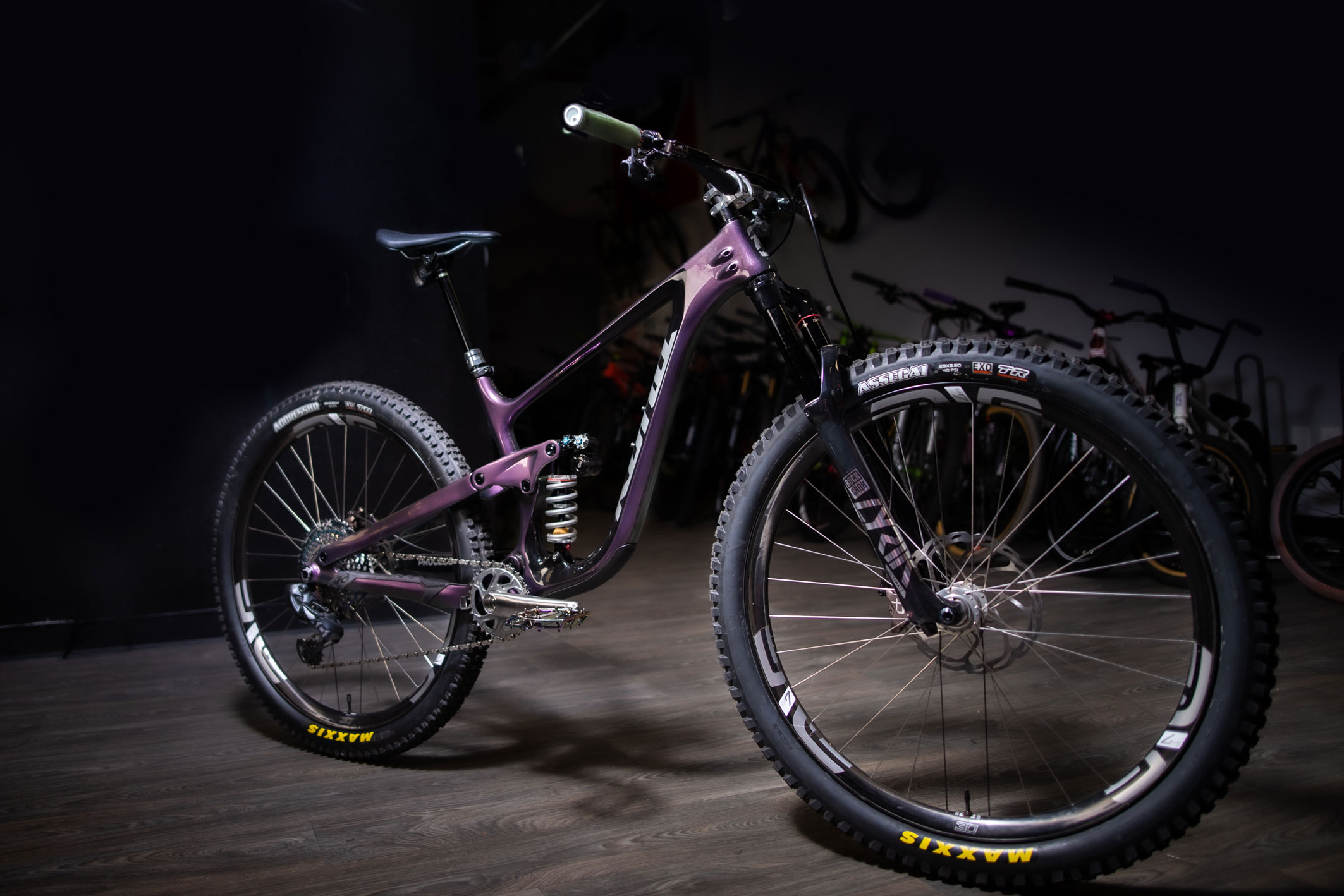 The bike rolls on Onyx hubs laced to ENVE M7 rims. The wheels are shod in Maxxis rubber with a 2.5 Aggressor out back and a 2.6″ Assegai up front. The build is completed with a AXS SRAM 175mm Reverb, Ergon GD1 Evo Factory grips and a set of Hayes Dominion A4 brakes.