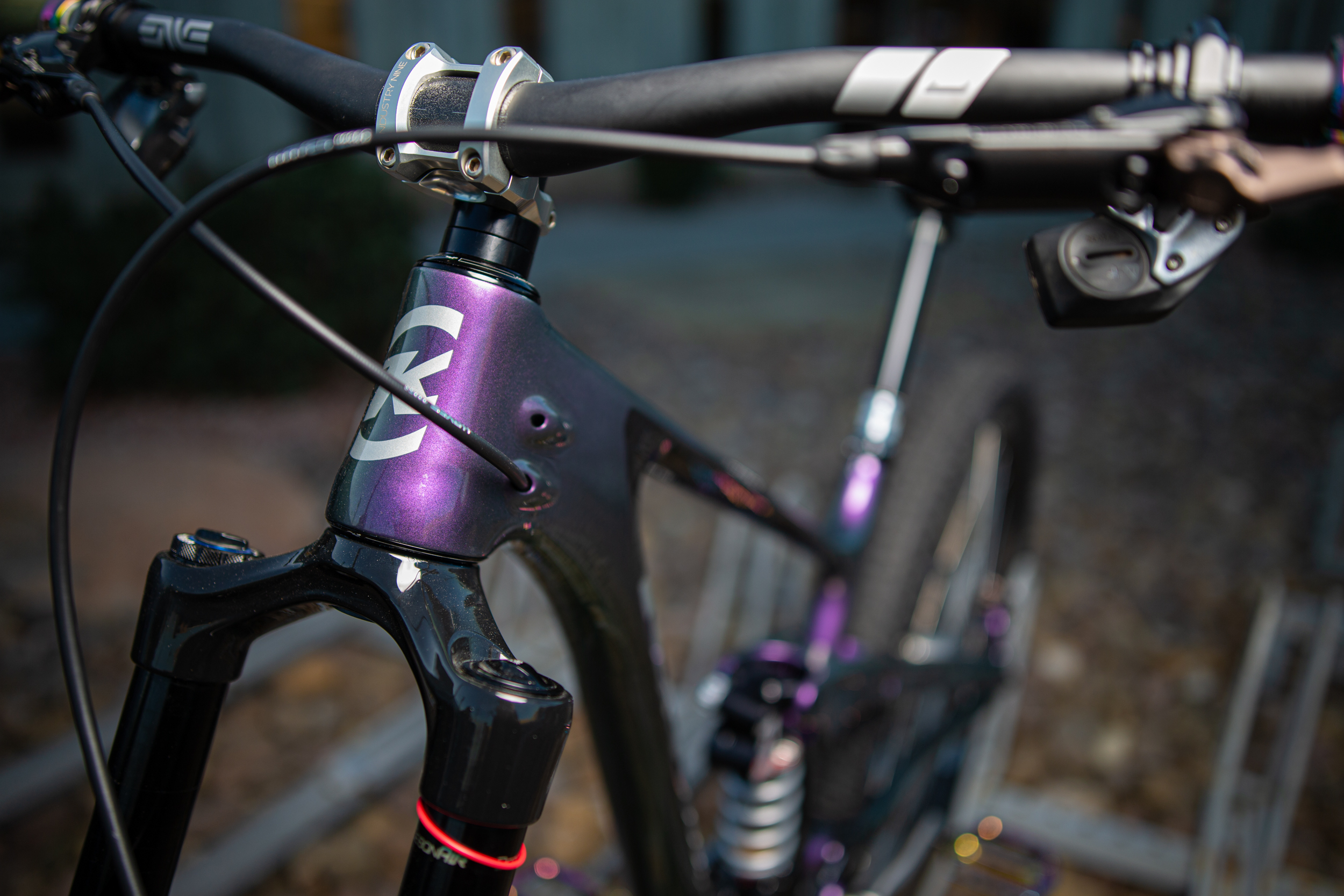 The front end of the bike is built around 150mm Lyrik Ultimate. The handlebar is an ENVE M6 mounted on a Industry Nine stem.