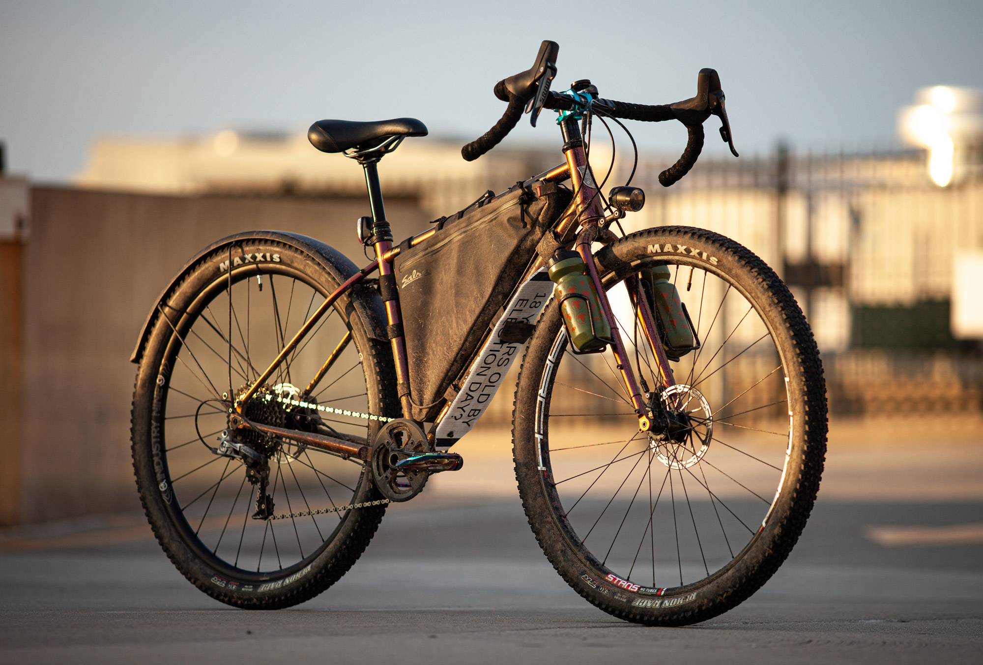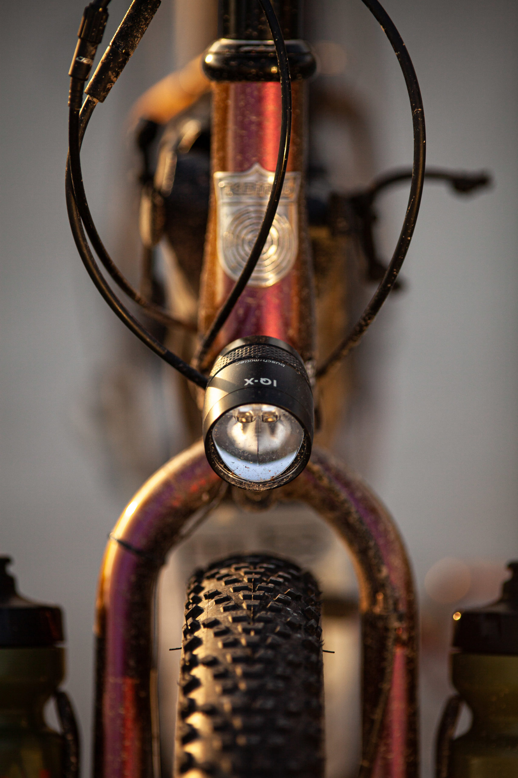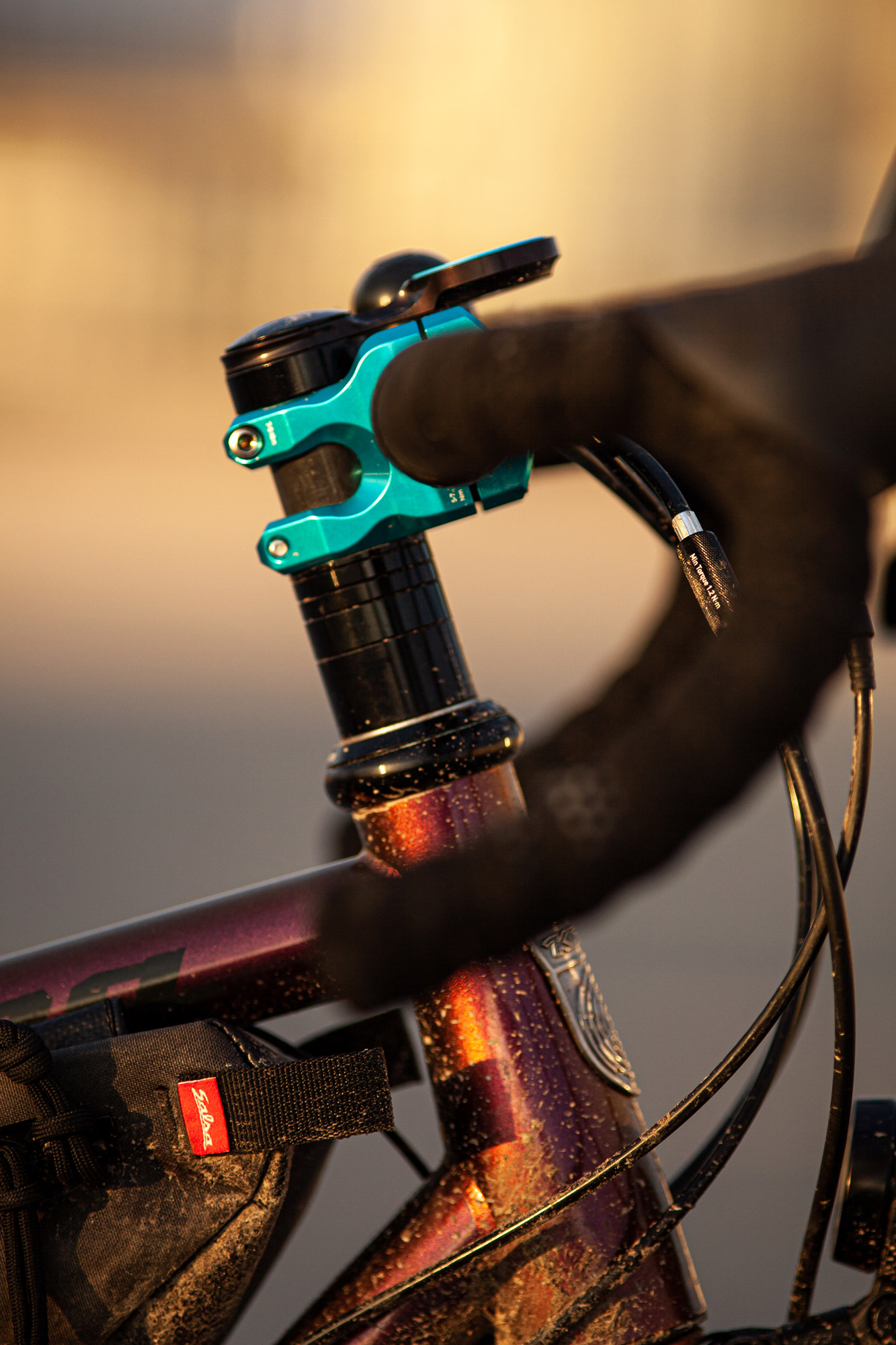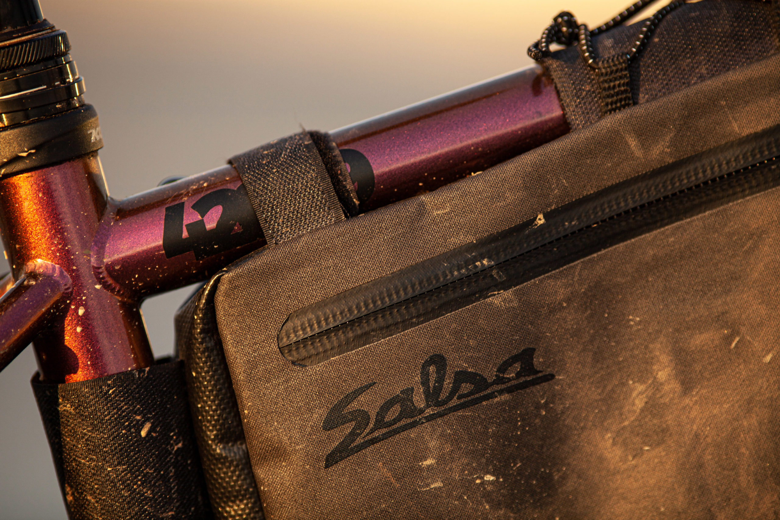 An off the shelf Salsa EXP frame bag perfectly fits the Sutra ULTD’s front triangle, while a home made cor-flute mud guard keeps the bag clean and communicates a public service announcement.