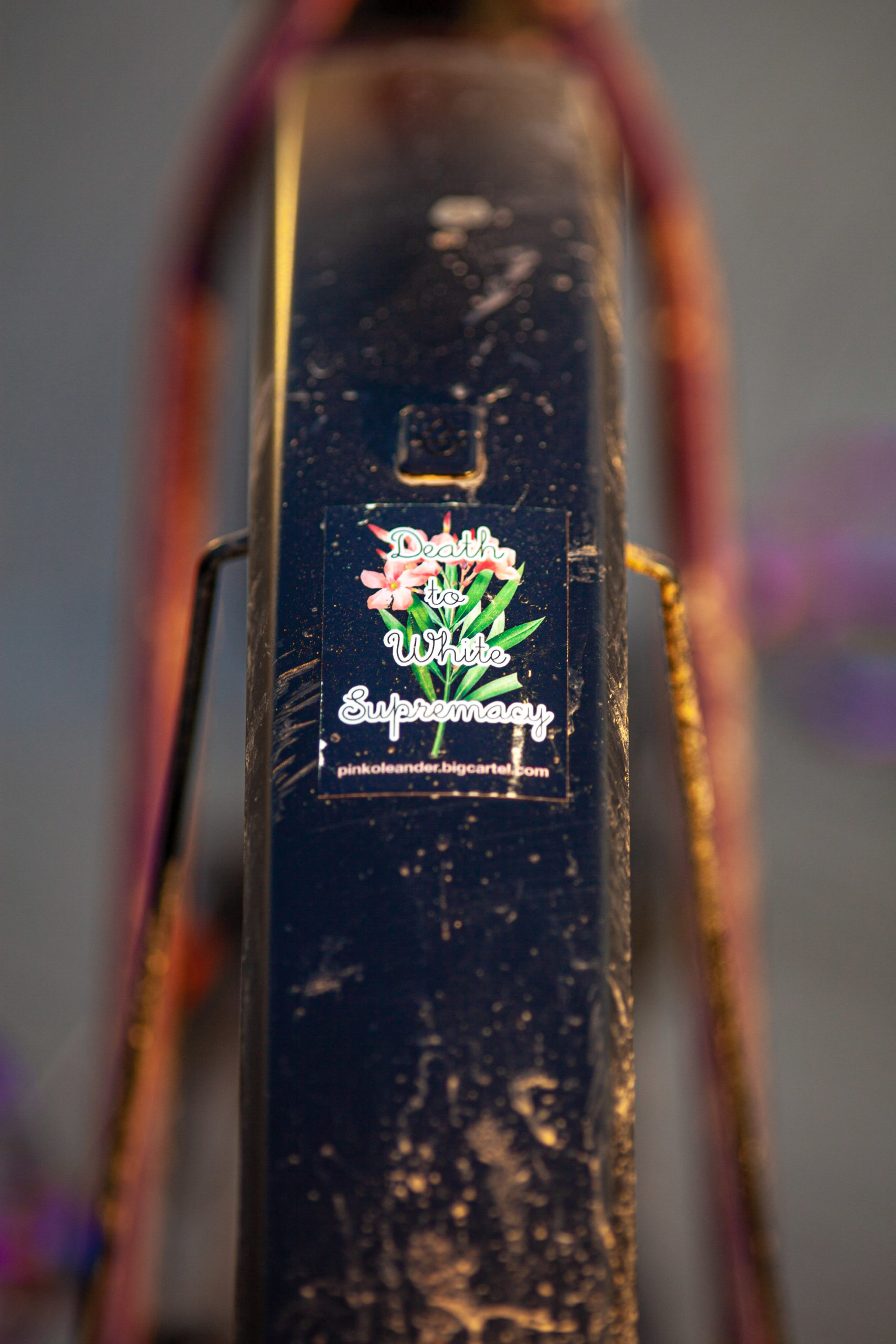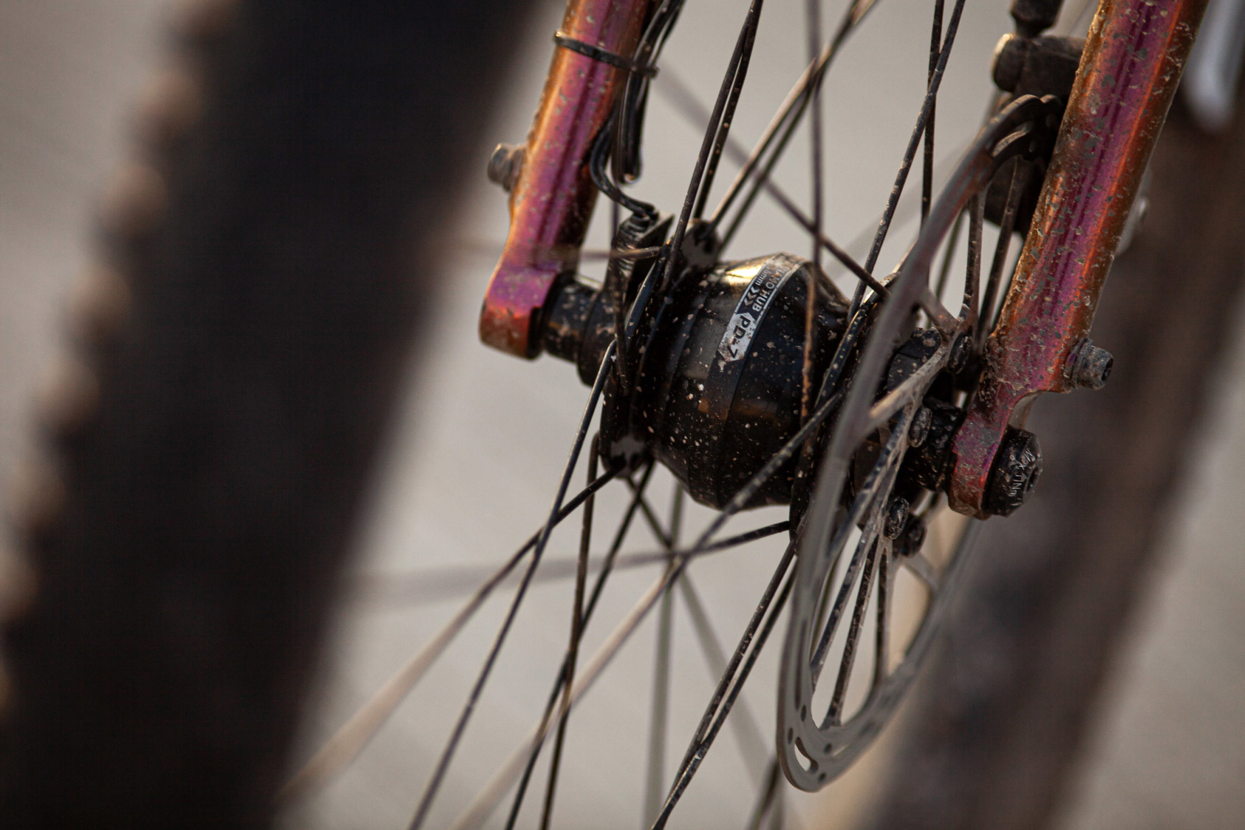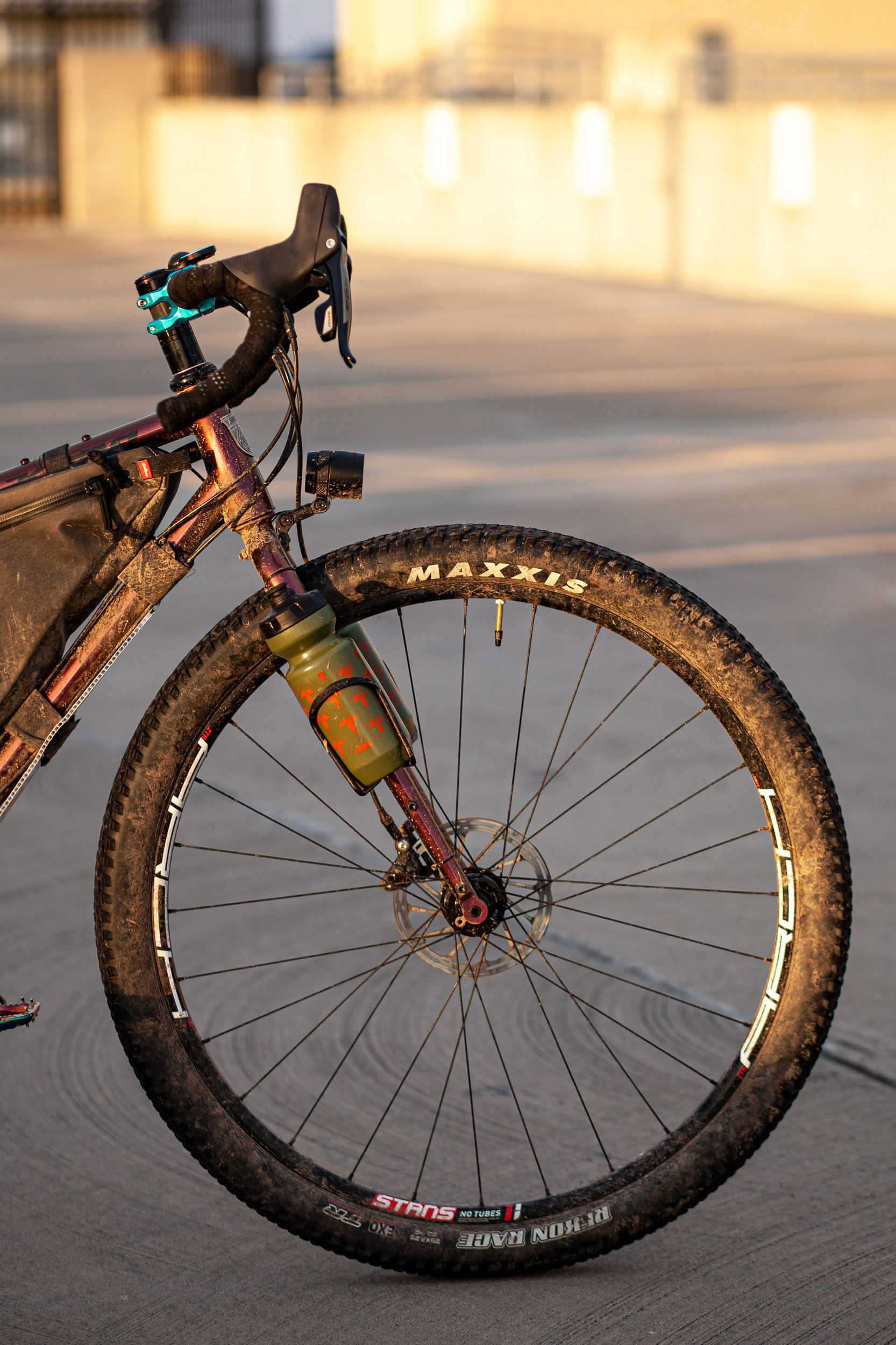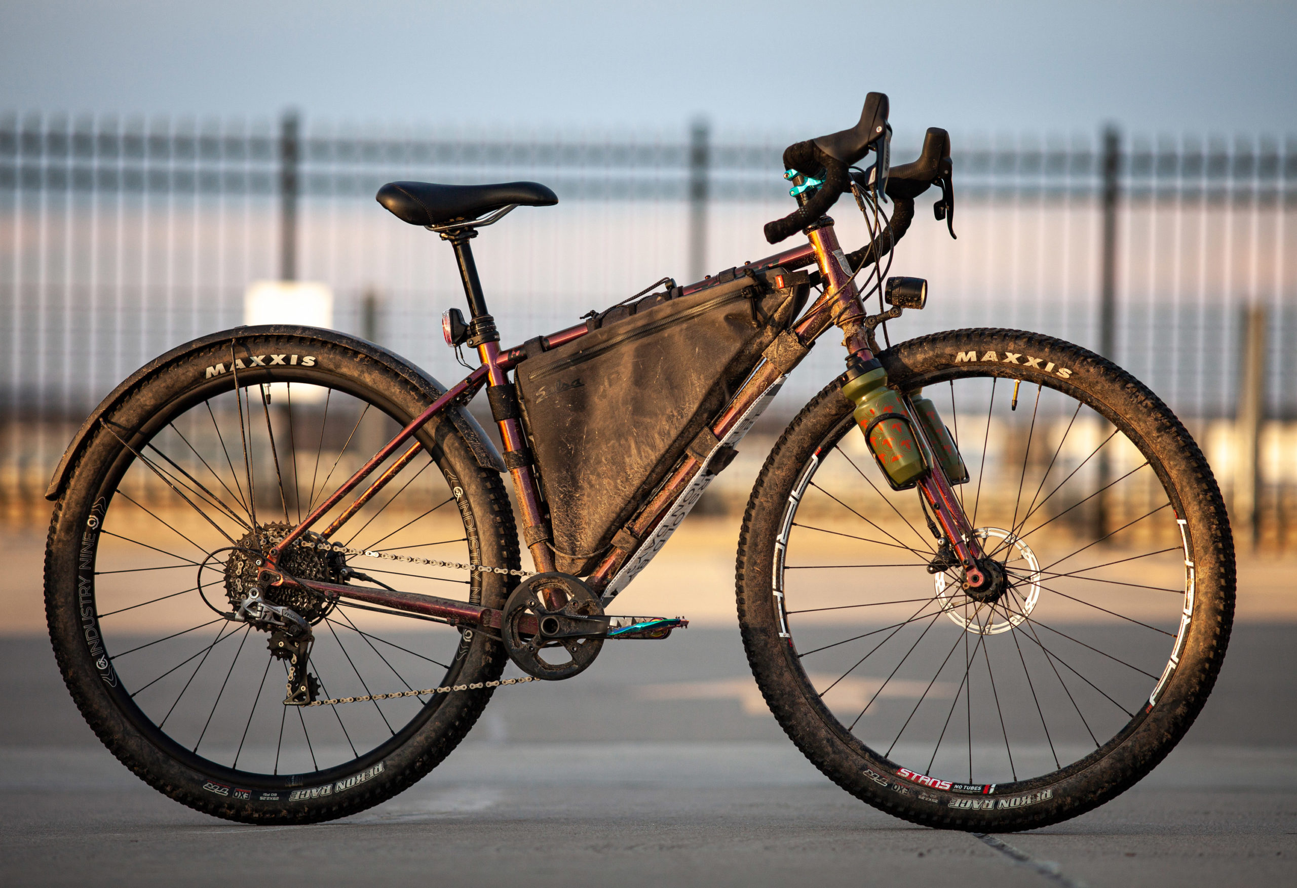An off the shelf Salsa EXP frame bag perfectly fits the Sutra ULTD’s front triangle, while a home made cor-flute mud guard keeps the bag clean and communicates a public service announcement.