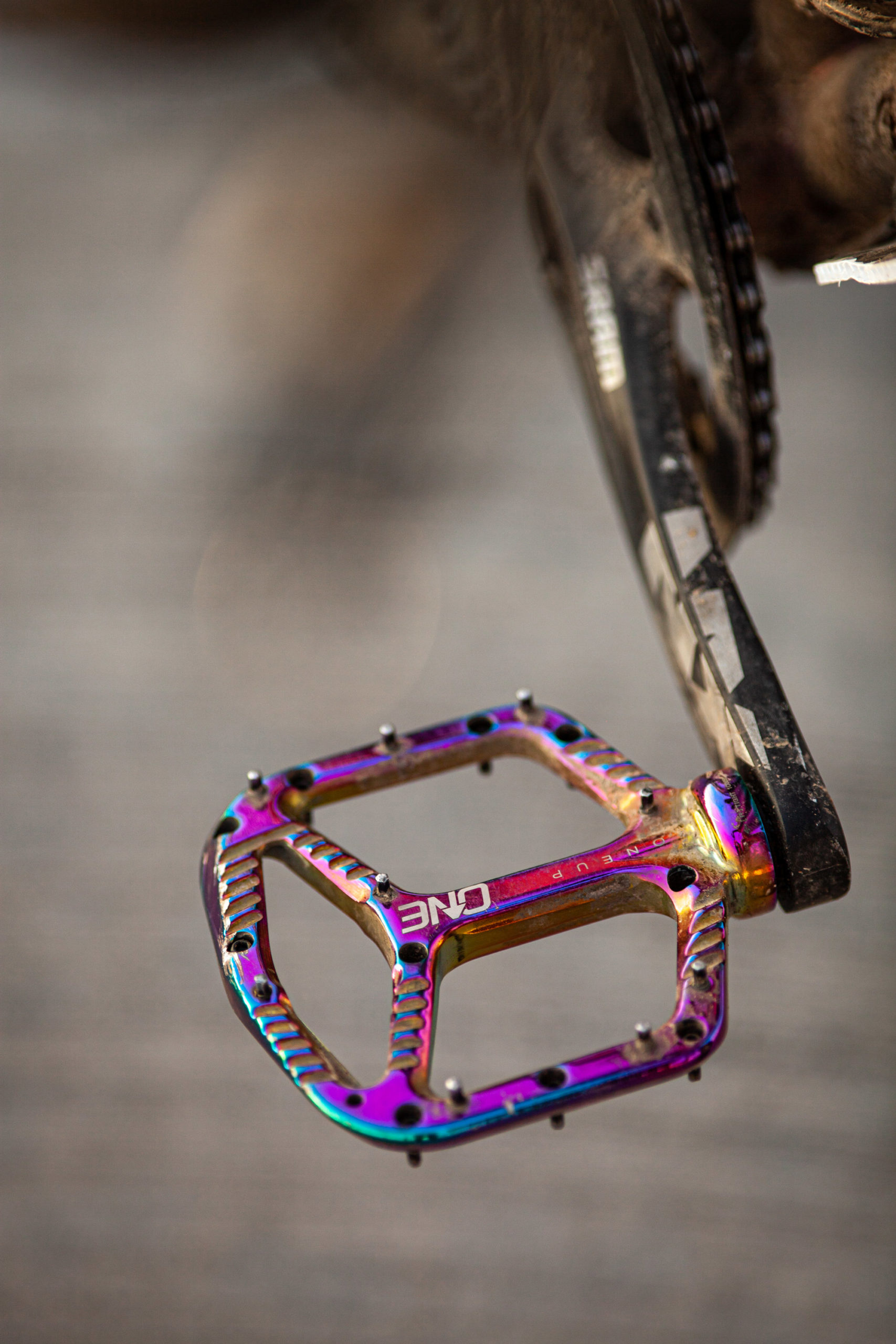 The bikes SRAM NX/Rival groupset has remained for the most part as have the Maxxis 2.25″ Rekon Race tubeless tires. Jason has swapped out the stock Kona stem for sexy blue 40mm Industry Nine A31.8 Mountain Stem and added in a Spurcycle bell.