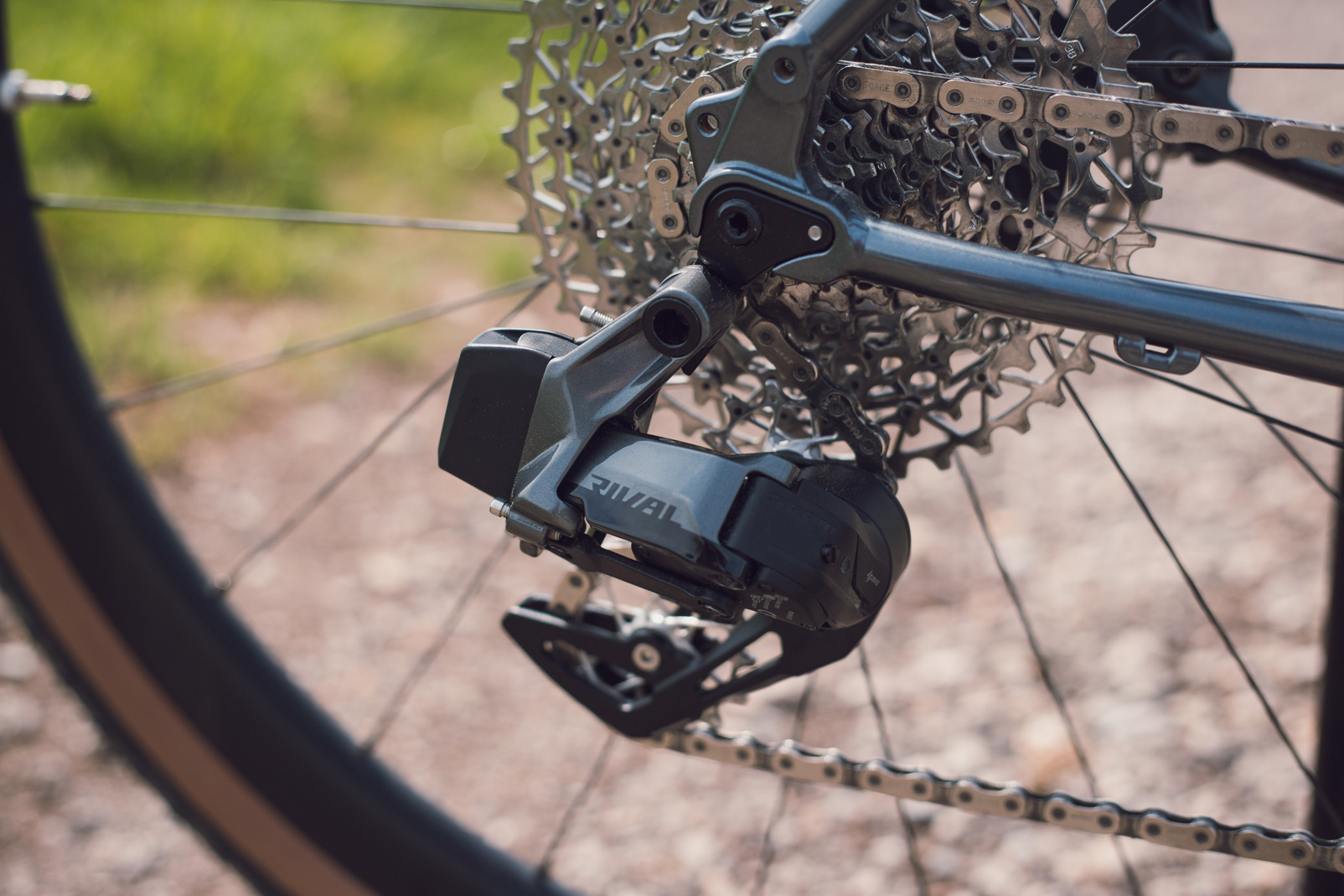42T in the front 10-44T in the back, shifted smoothly by a Sram Rival AXS derailleur.