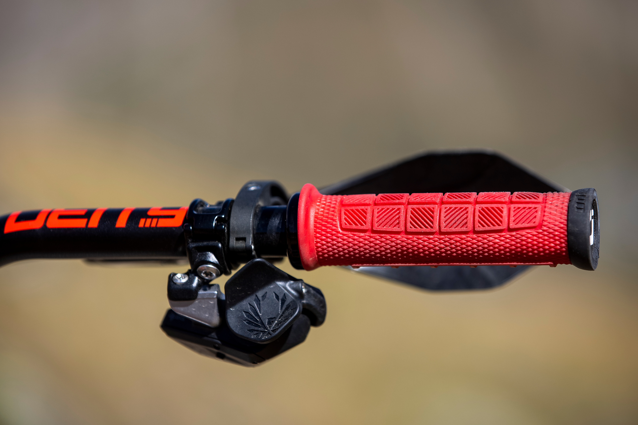 ODI Motion Elite grips are mounted on Deity Black Label 25mm rise bars.