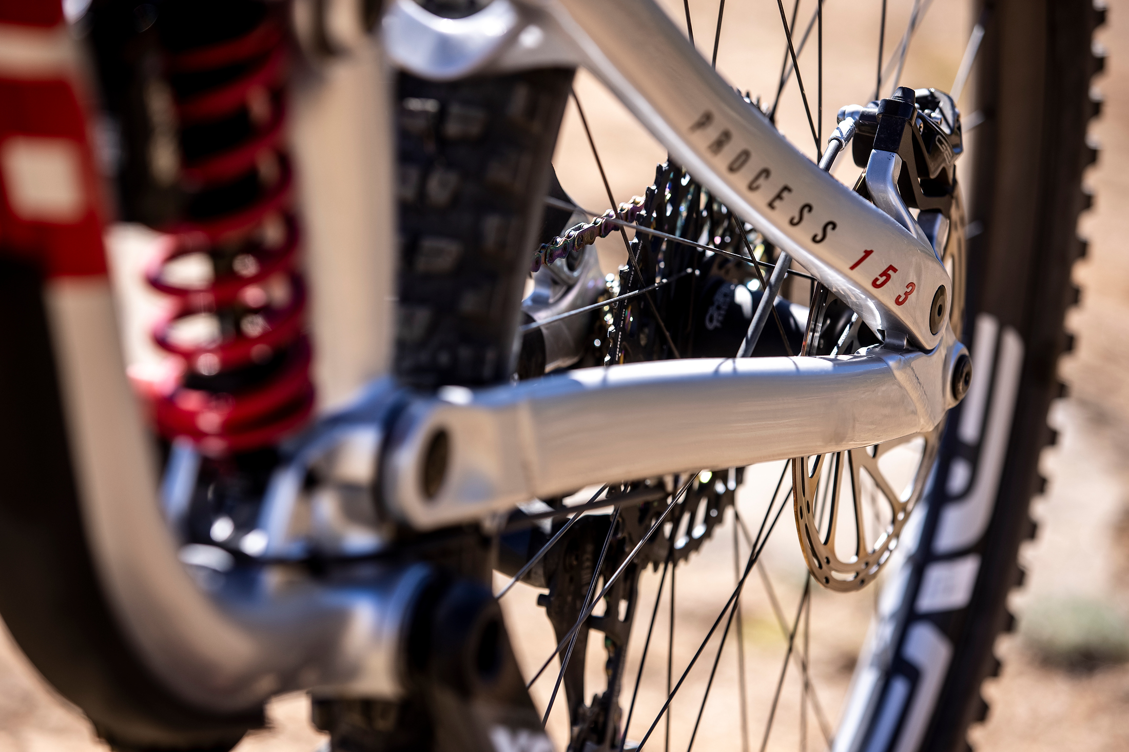 All of our Process bikes are designed to accept coils and Connor is definitely a fan. Connor’s bike would normally run a 425 Race Only progressive spring (that’s a 500 Rock Shox one pictured). And his pedals of choice of course, HT AE01’s.