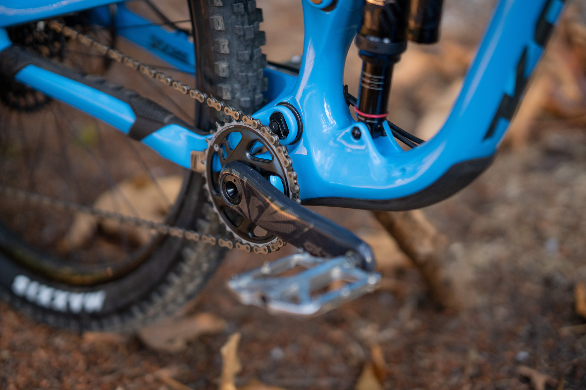 Ky is running Carbon SRAM GX cranks paired with a 32t X-Sync Eagle chainring.