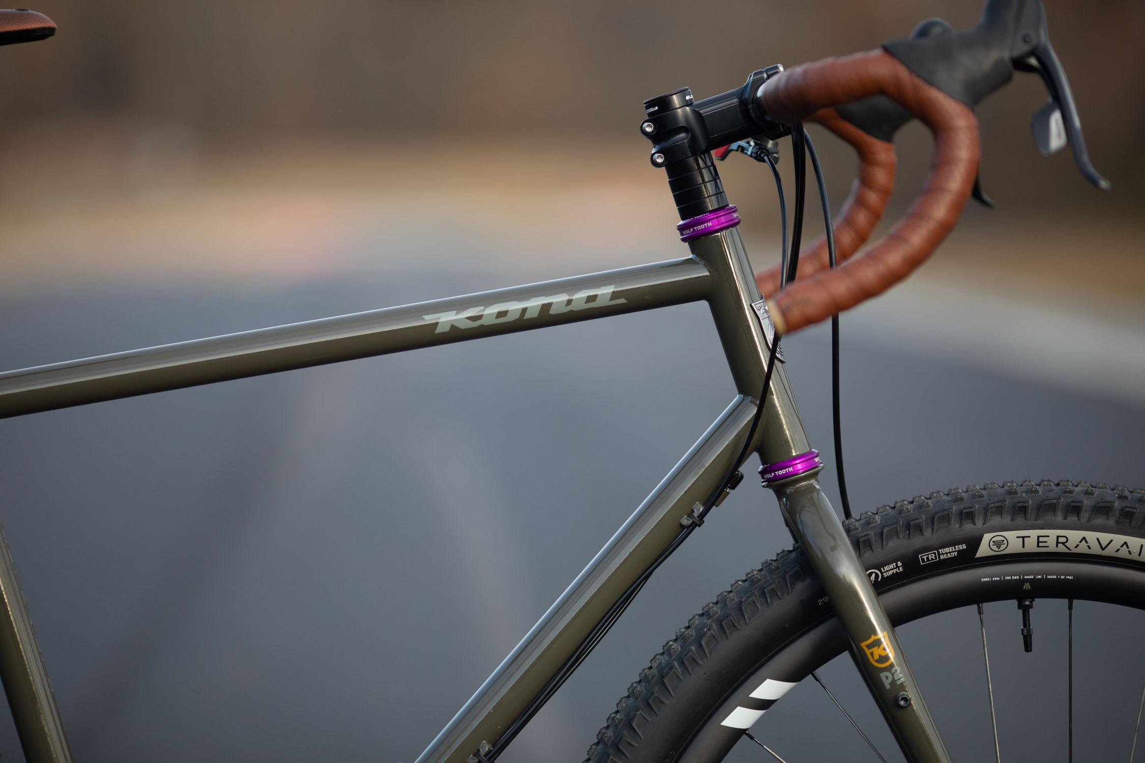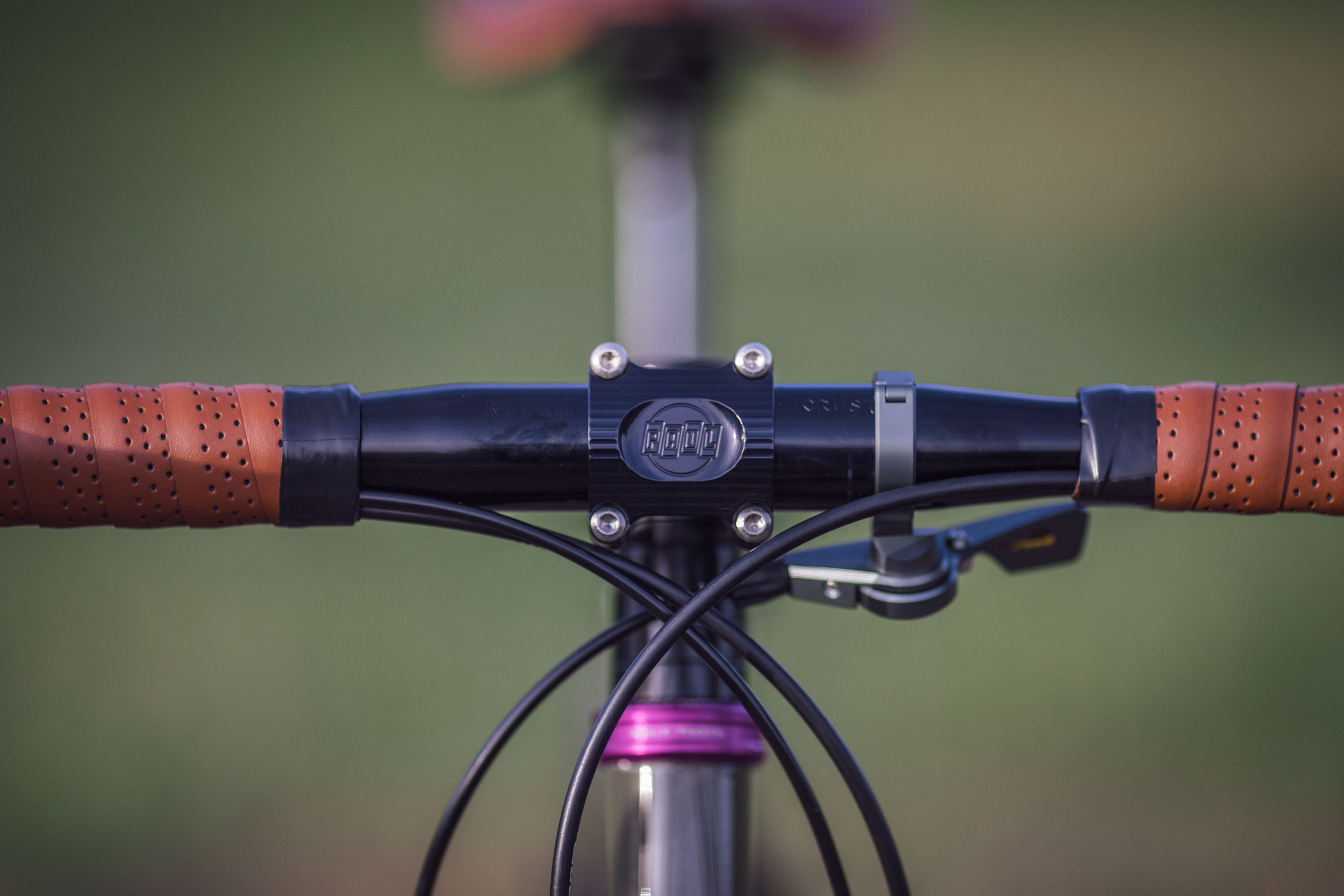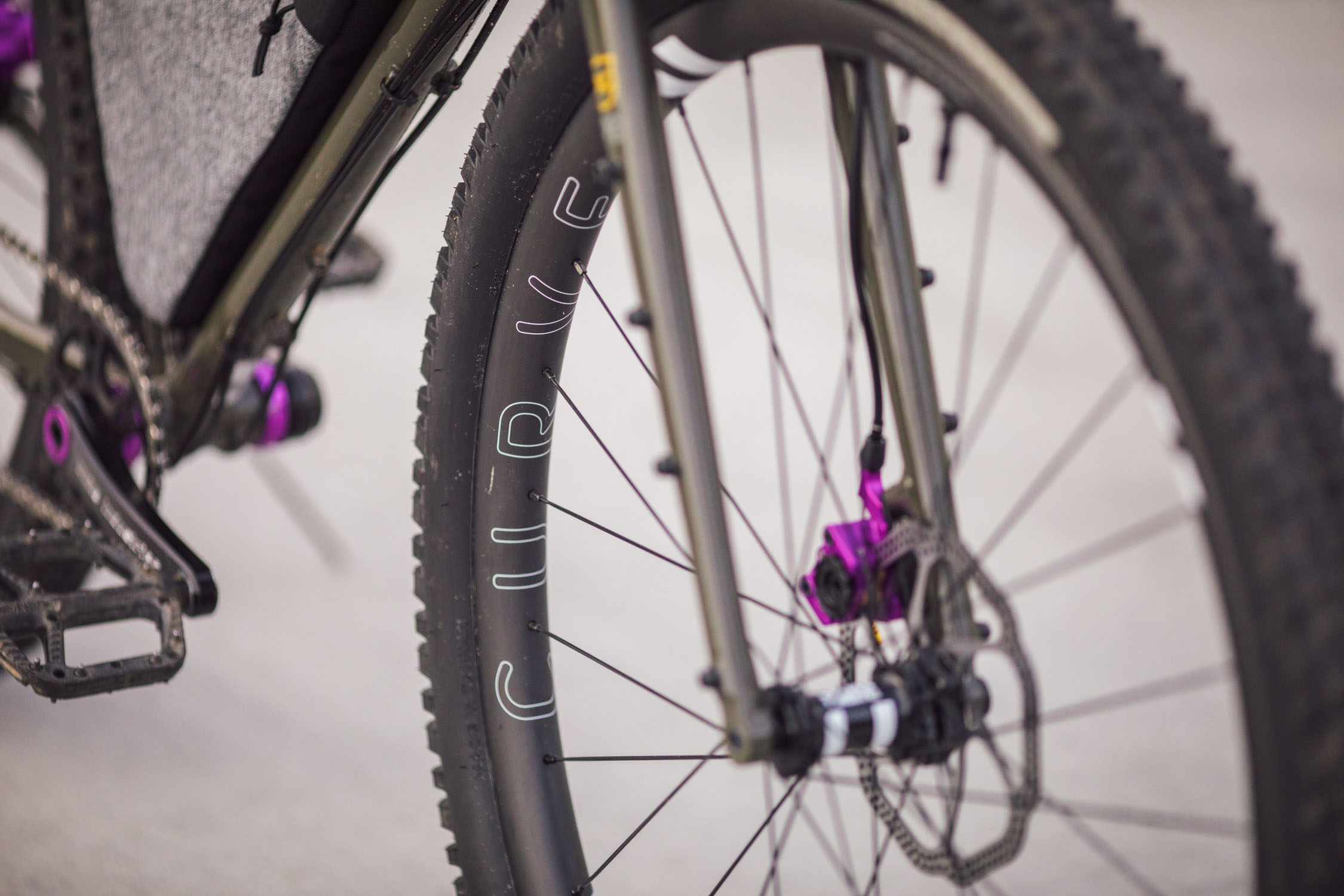 You’ve probably noticed just how rad the ano purple accents look on this build. Well those hits just keep coming, up in the cockpit, you’ll find a purple Wolf Tooth headset anchoring the fork and stem. The bar is from Crust Bikes and is their Shaka Bar and the stem is from Paul Components and is a 70m Boxcar. Oh, and that bar tape is CampAndGoSlow Rattlesnake tape (in the first and last photos).