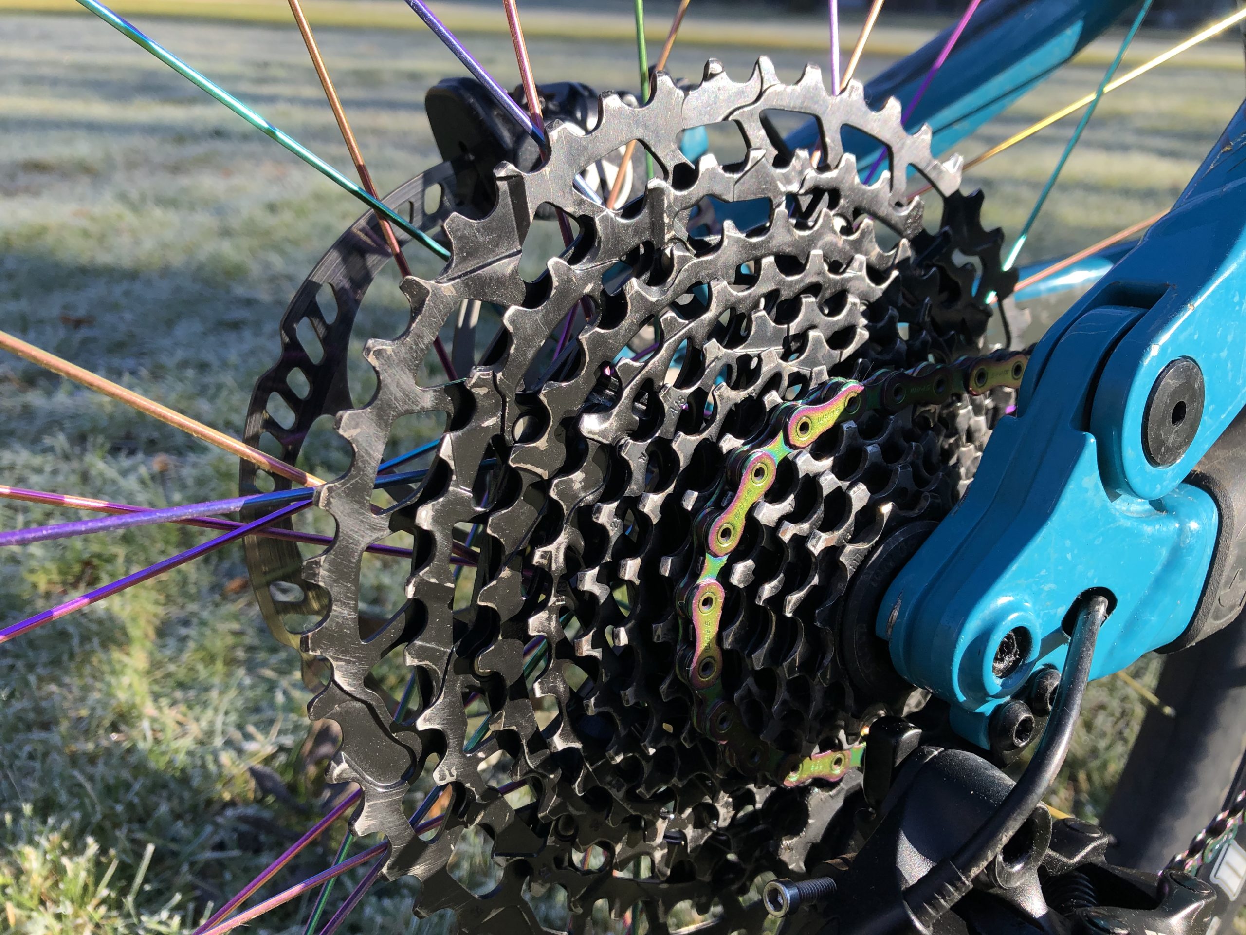 The stock SRAM NX Eagle crankset has a sexy oil slick Eagle XX1 chain wrapped around it.