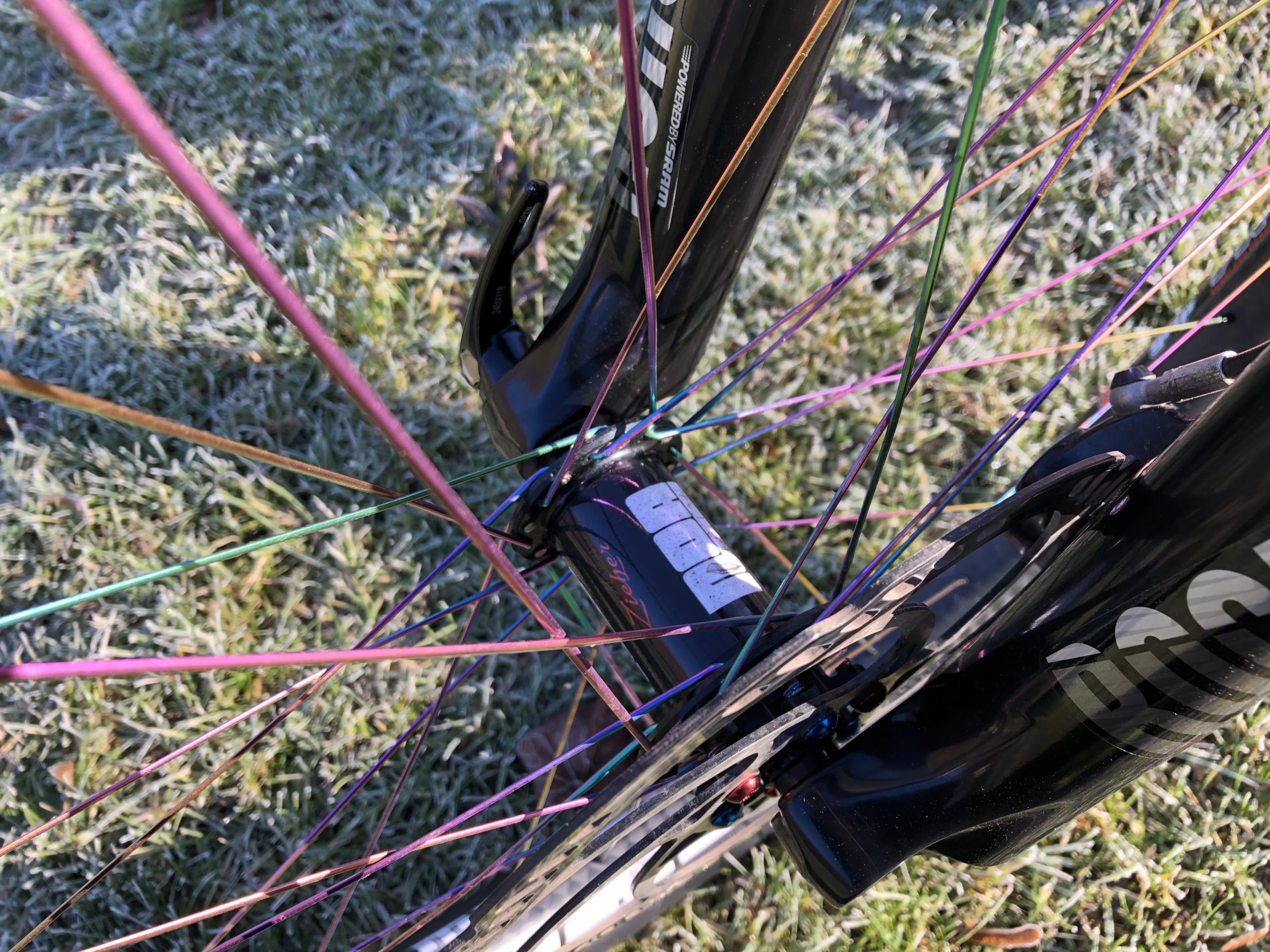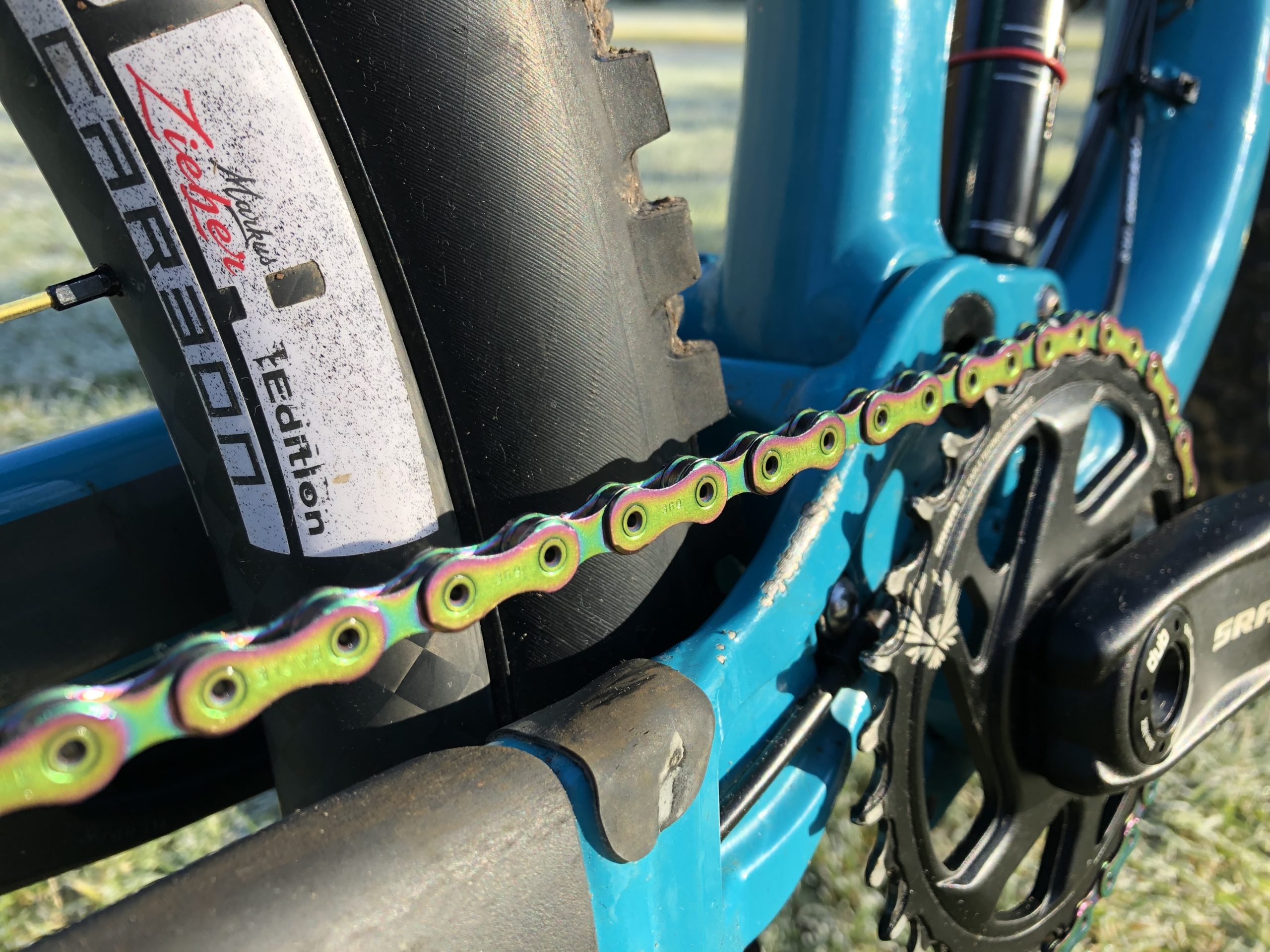 The stock SRAM NX Eagle crankset has a sexy oil slick Eagle XX1 chain wrapped around it.