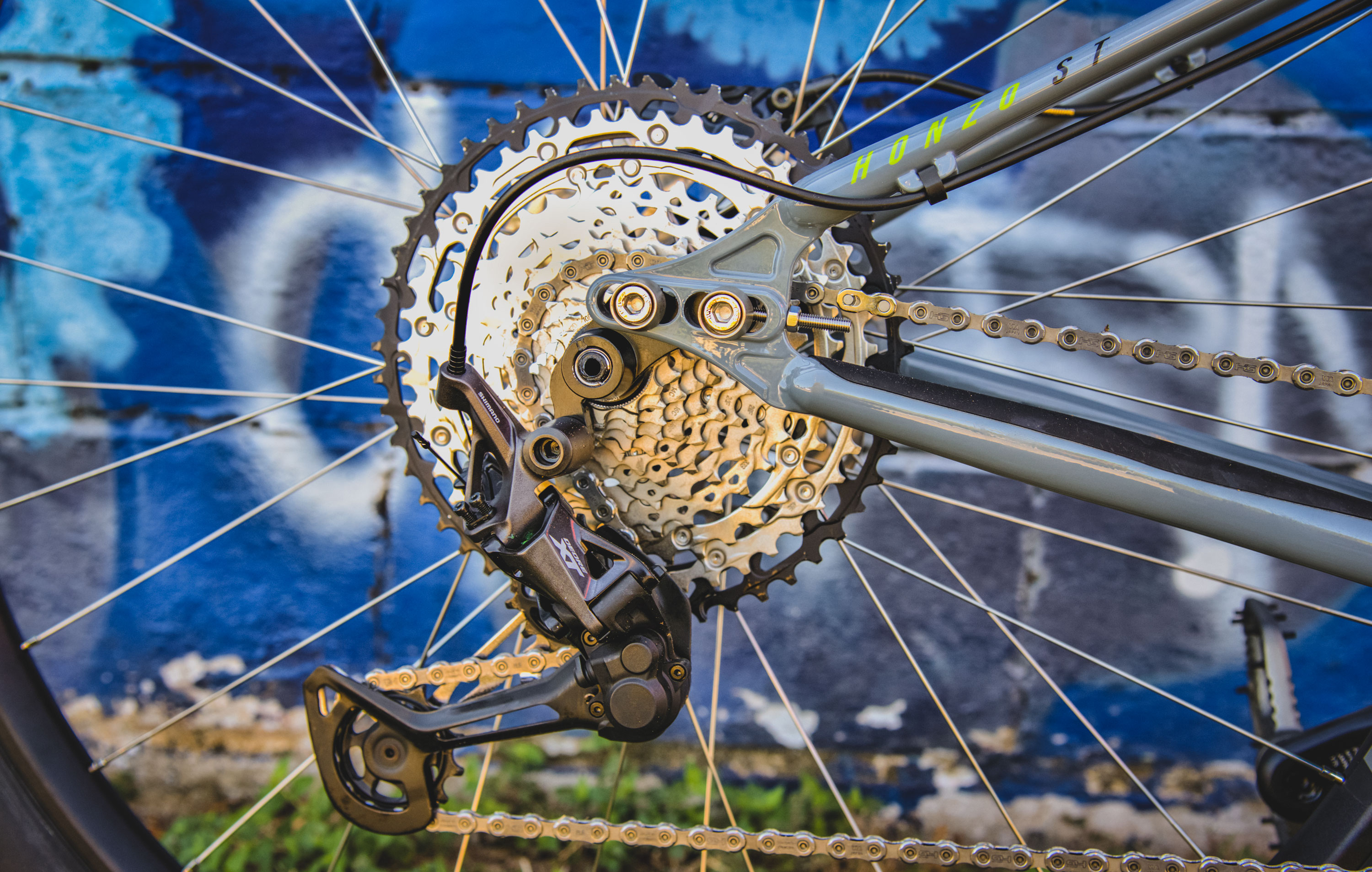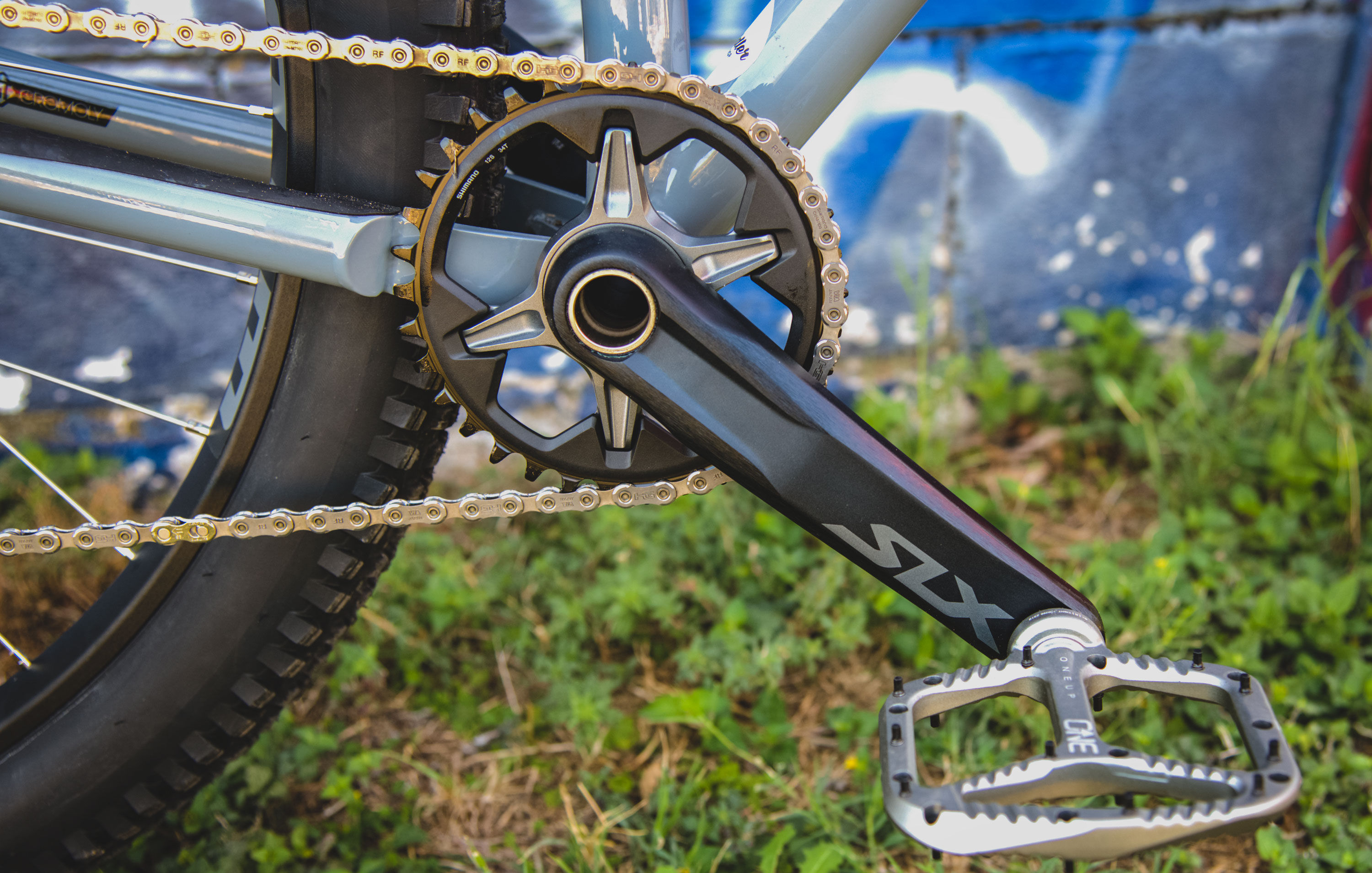 The cool think about Honzo ST builds is the fact that most people are trying to put together a bike, that while it doesn’t break the bank, can get rowdy and go the distance. Marshall’s mix of SLX cranks and an XT rear derailleur (with a 10-51t SLX cassette) set the tone right off the bat. OneUp’s alloy platform pedals round out the drive train.