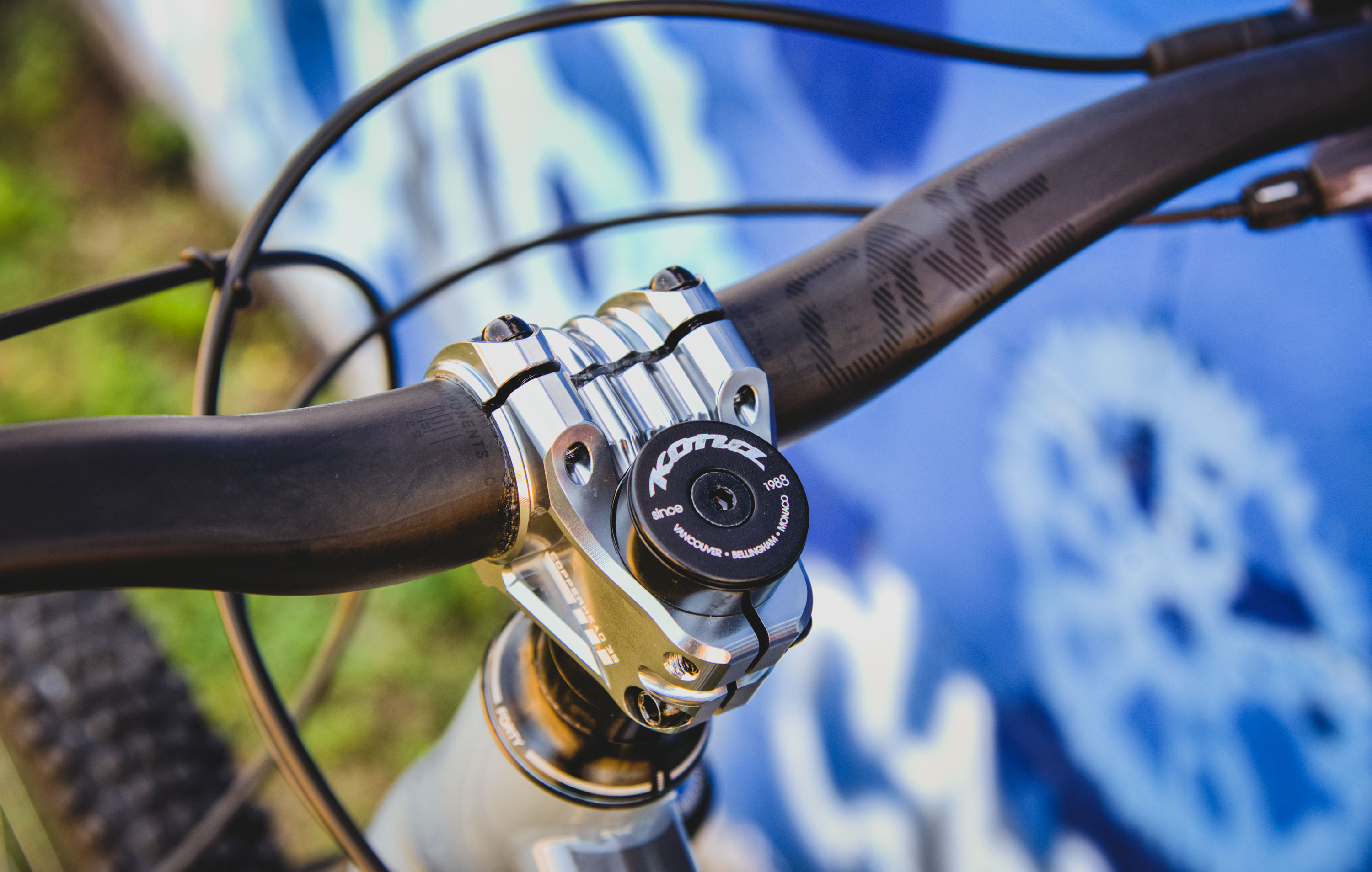 The cockpit is a very modern affair, OneUp Components new compliant carbon bar anchors Shimano SLX brakes (connected to 4 pot SLX calipers) and an XT shifter. Marshall has chosen a 140mm Pike Select for suspension duties.